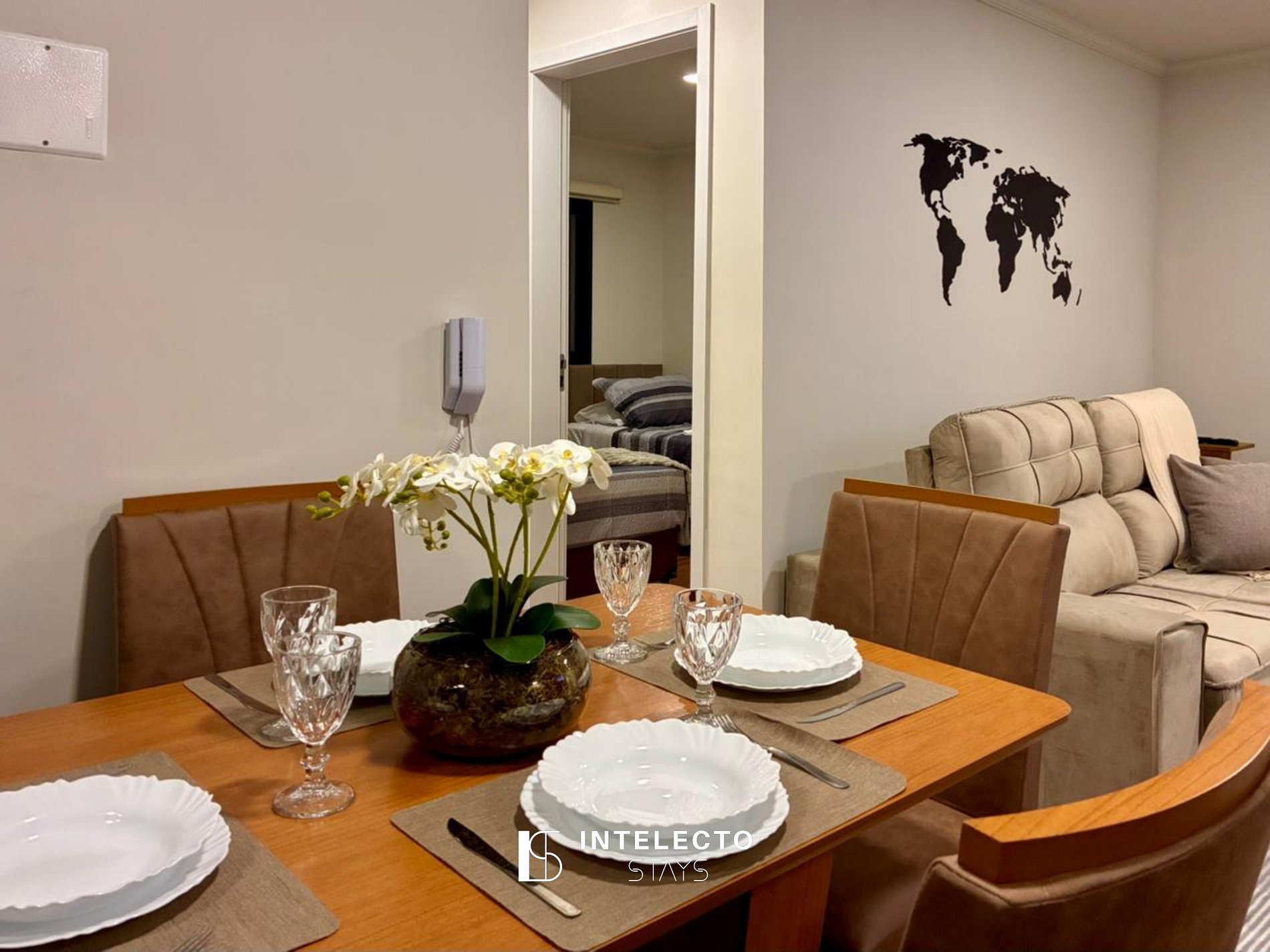 - Sala de dois ambientes com uma vista linda, mesa de 4 lugares, sofá-cama e Smart TV com streamings