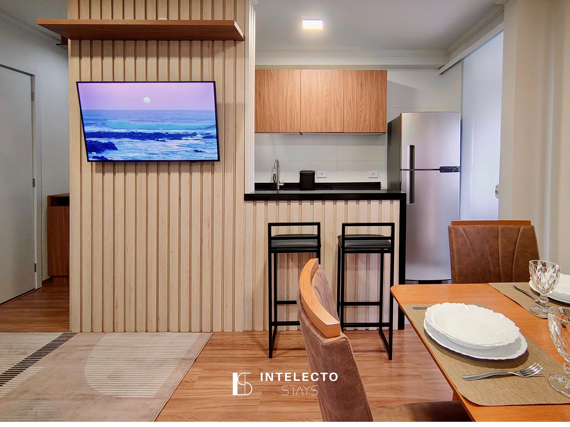 - Sala de dois ambientes com uma vista linda, mesa de 4 lugares, sofá-cama e Smart TV com streamings