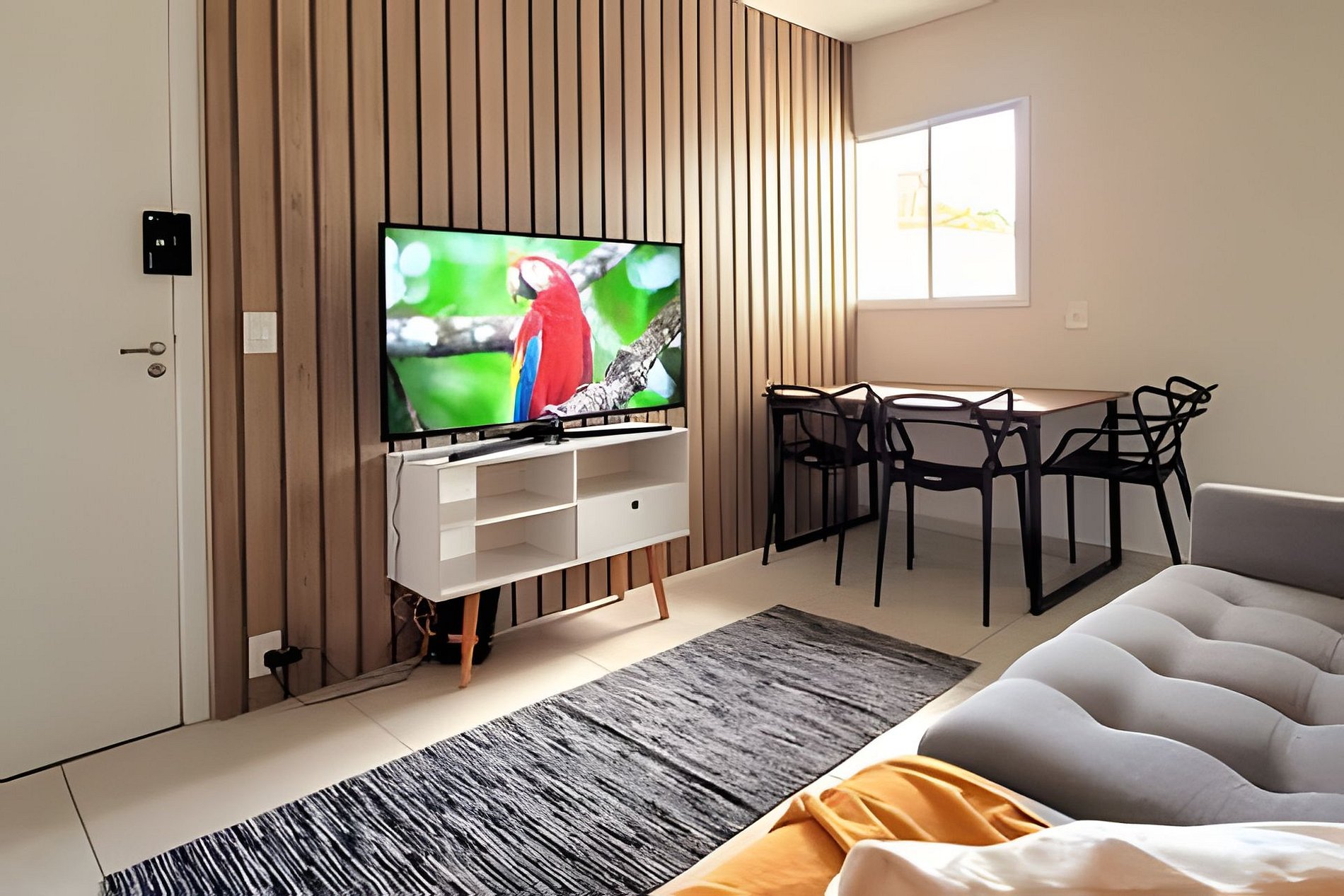 - Sala de dois ambientes com mesa de jantar, sofá confortável e Smart TV com streamings
