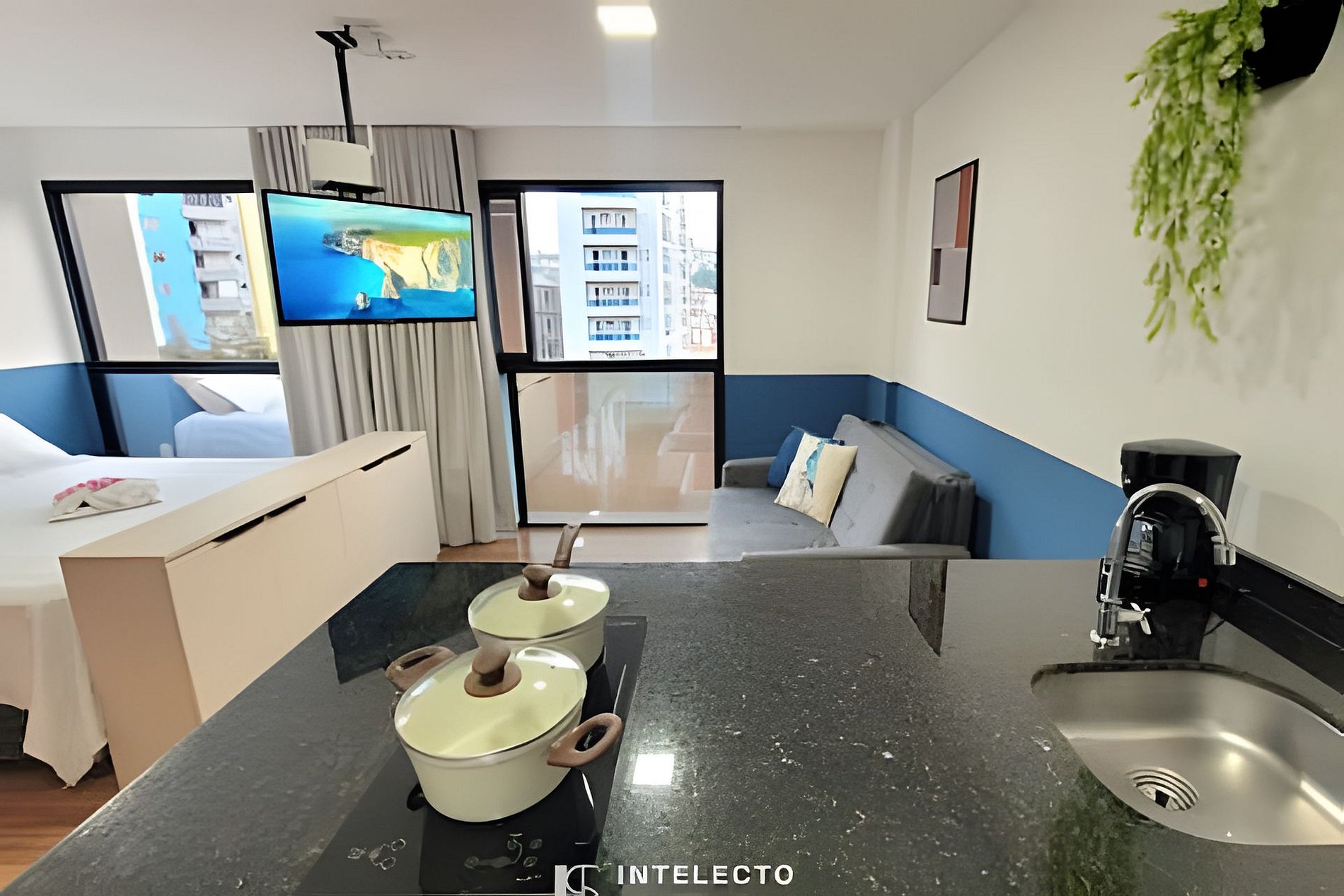 - Espaços integrados (quarto com cama queen e sala de estar com sofá-cama) com armários e guarda-roupas planejados