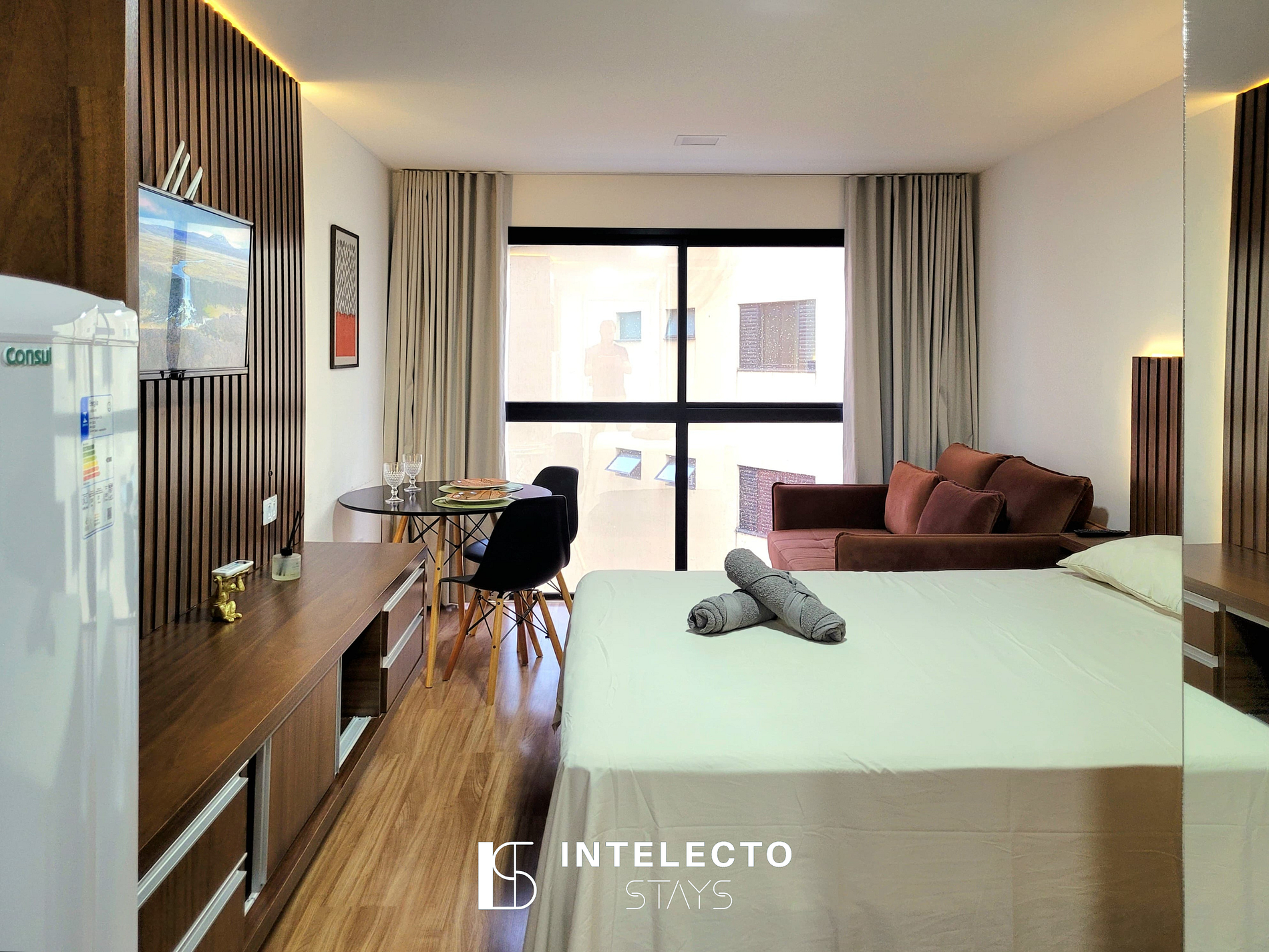 - Espaços integrados (quarto com cama queen e sala de estar com sofá-cama) com armários e guarda-roupas planejados