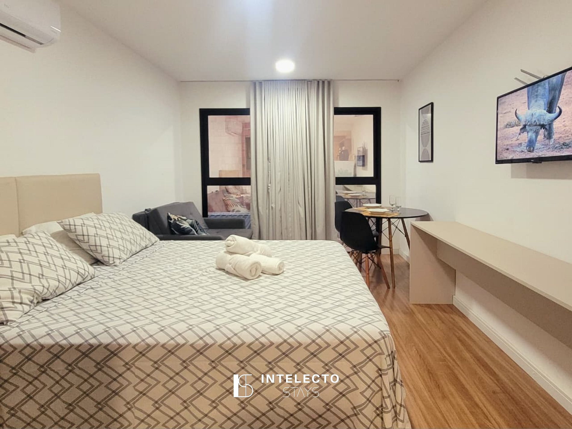 - Espaços integrados (quarto com cama queen e sala de estar com sofá-cama) com armários e guarda-roupas planejados