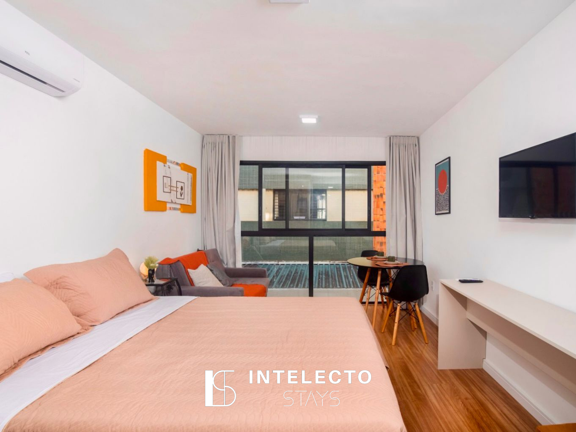 - Espaços integrados (quarto com cama queen e sala de estar com sofá-cama) com armários e guarda-roupas planejados