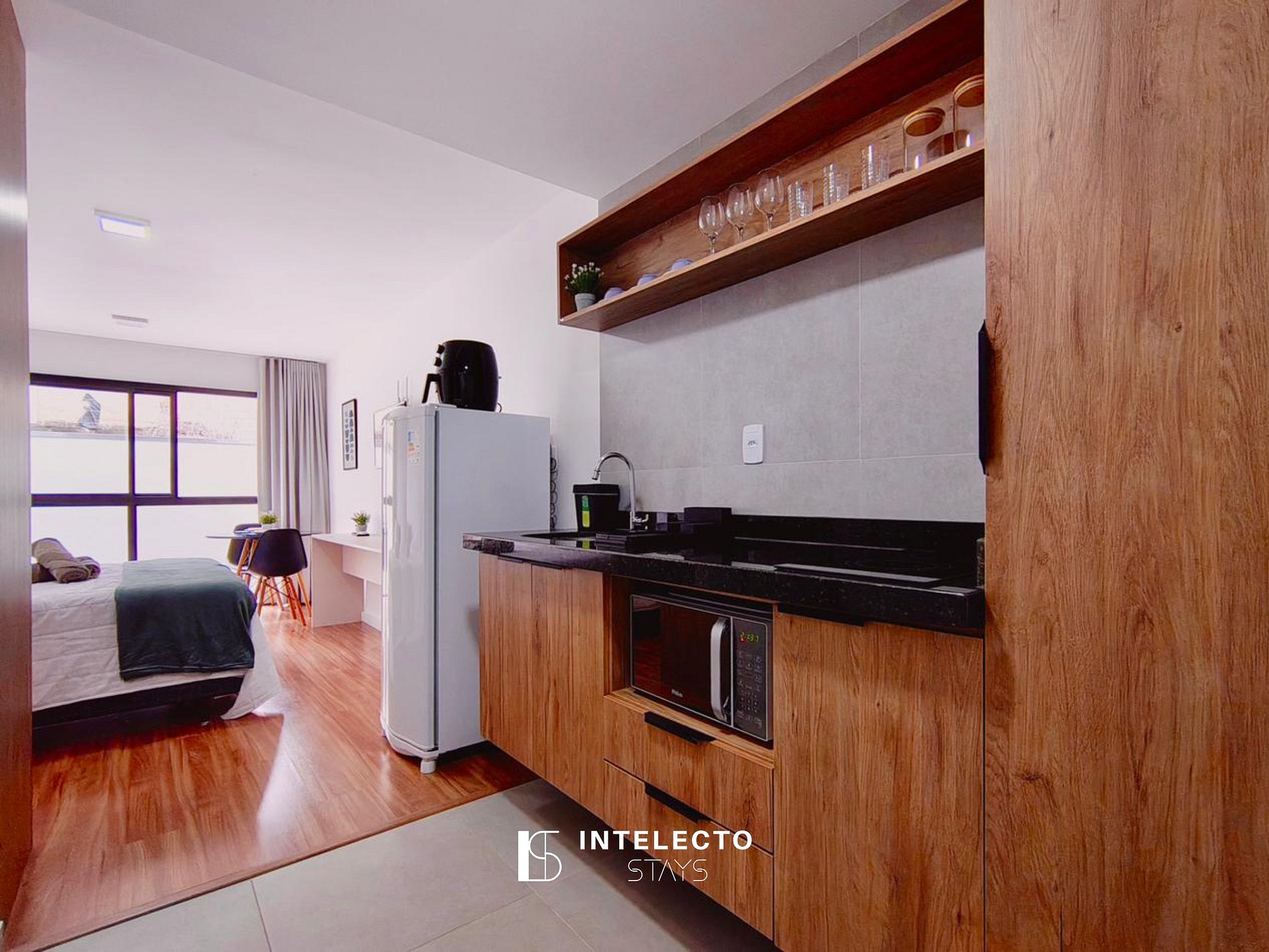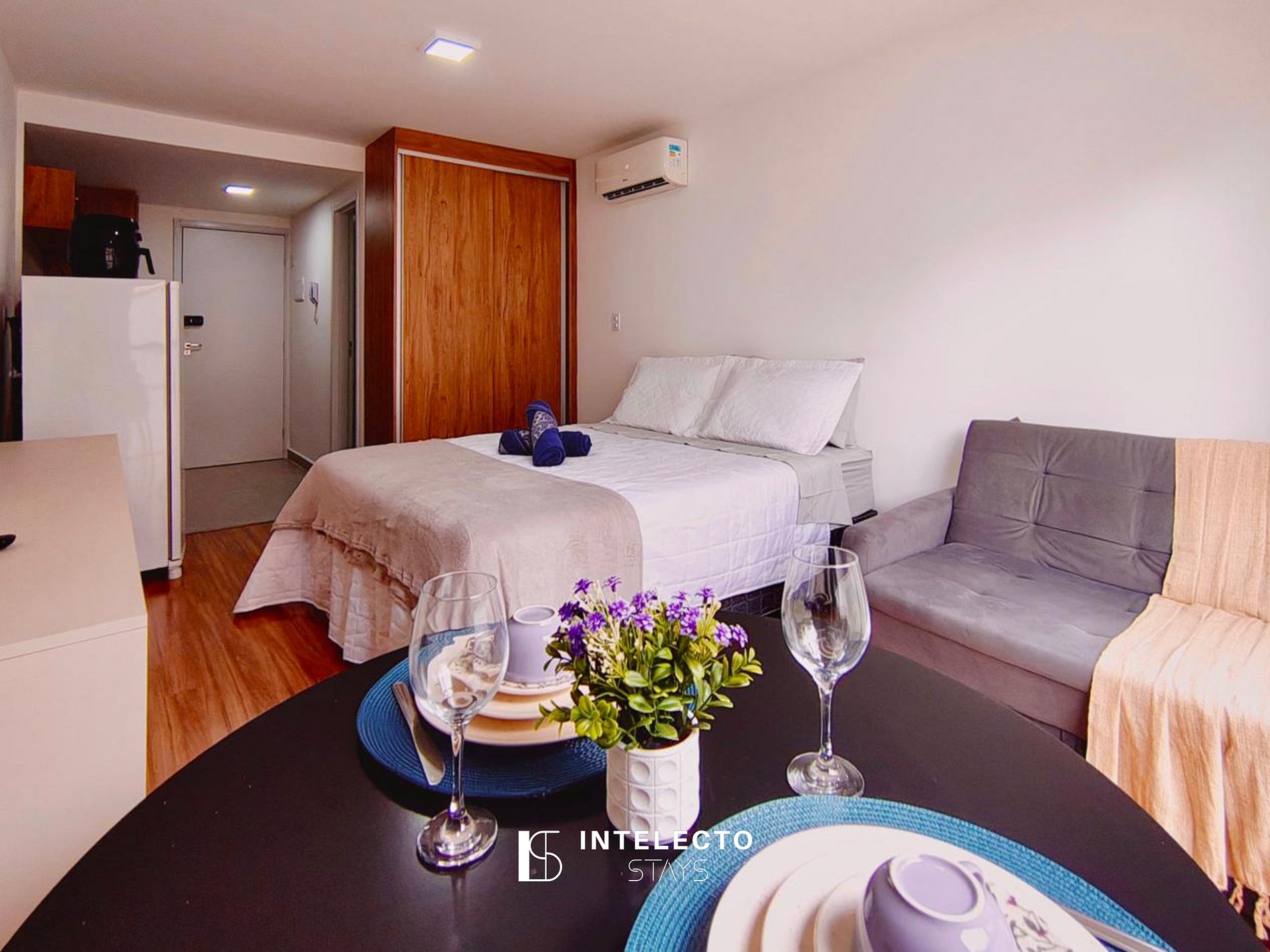 - Espaços integrados (quarto com cama queen e sala de estar com sofá-cama) com armários e guarda-roupas planejados