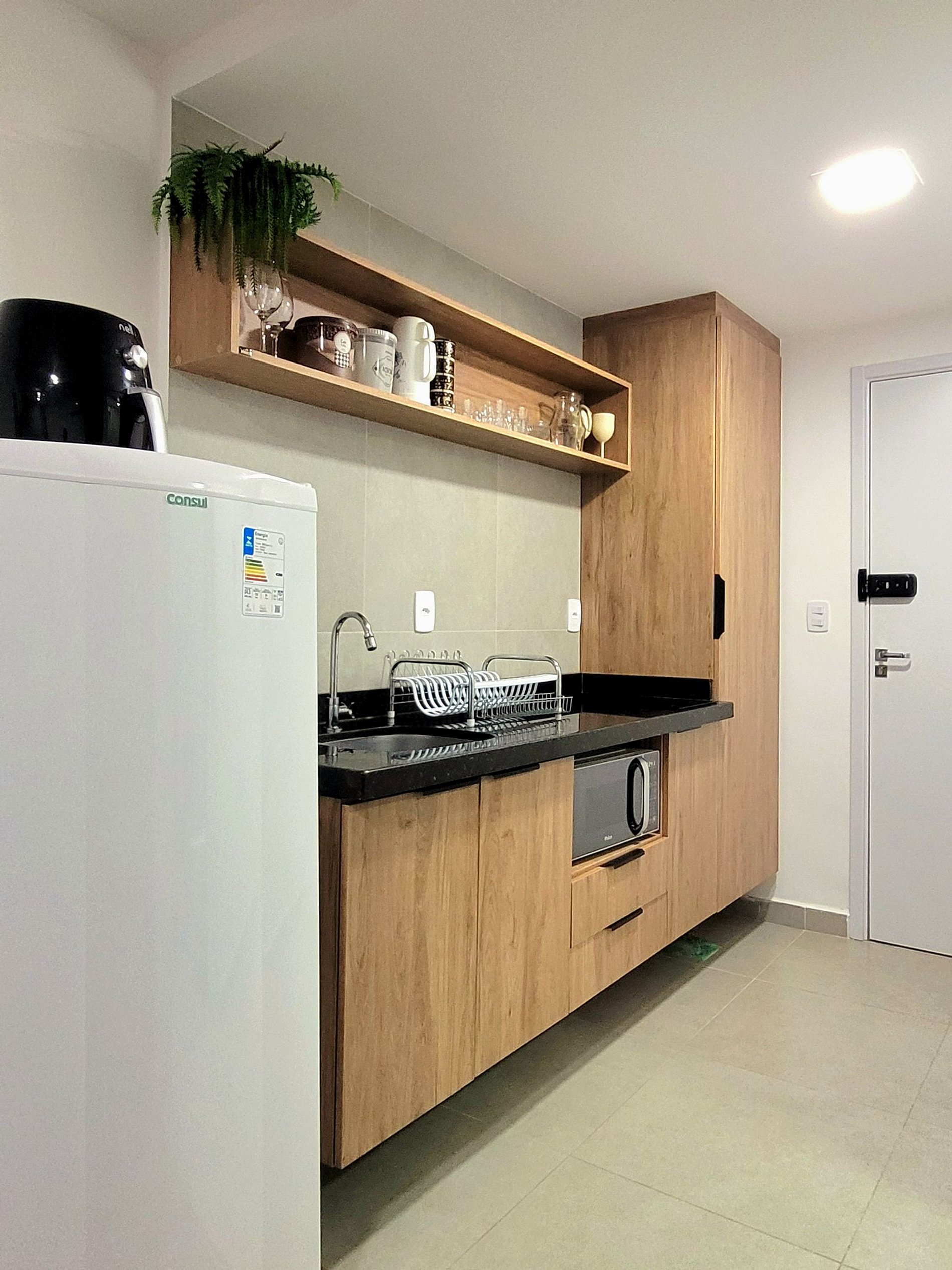 - Espaços integrados (quarto com cama queen e sala de estar com sofá-cama) com armários e guarda-roupas planejados