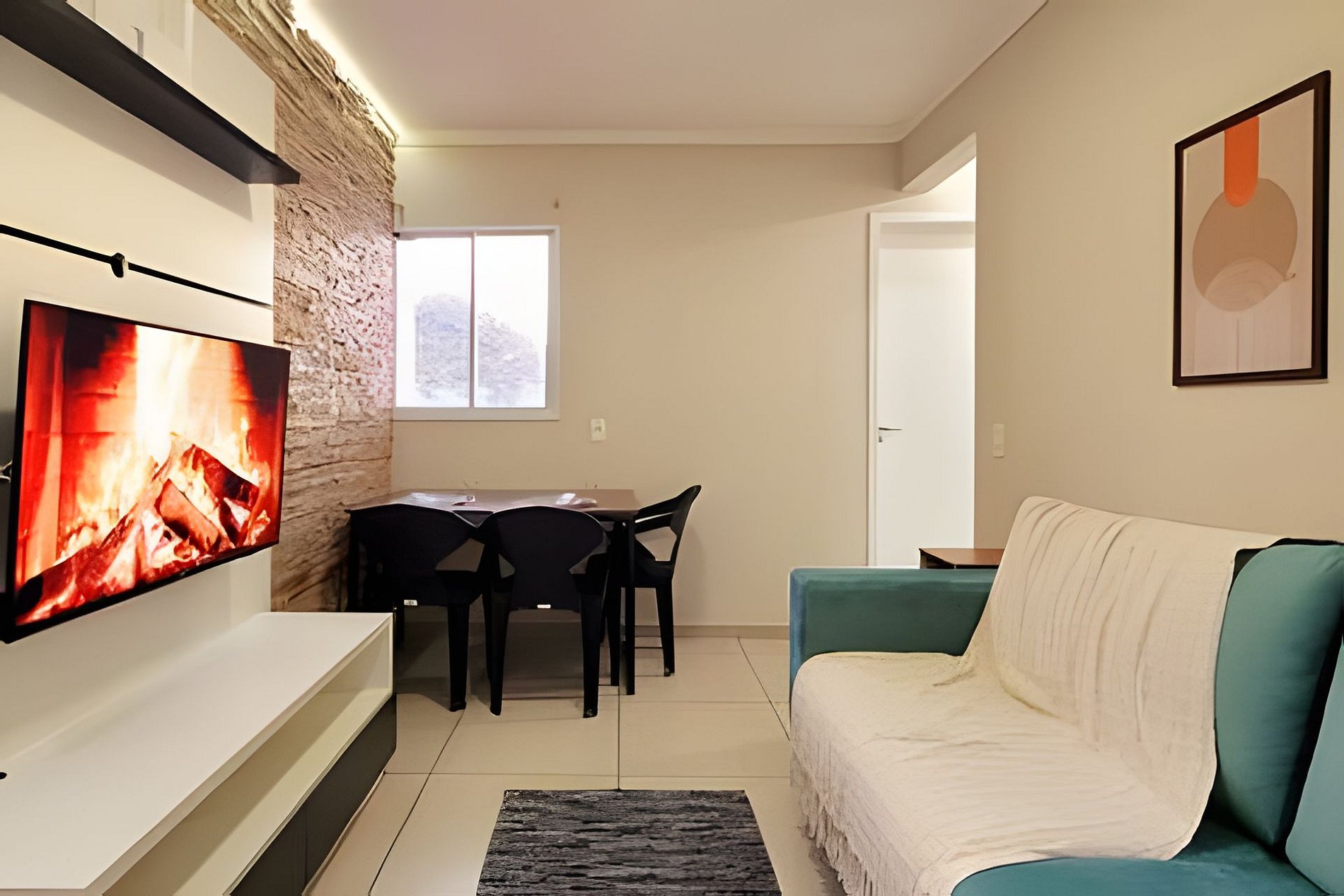 - Sala de dois ambientes com mesa de jantar, sofá confortável e Smart TV com streamings