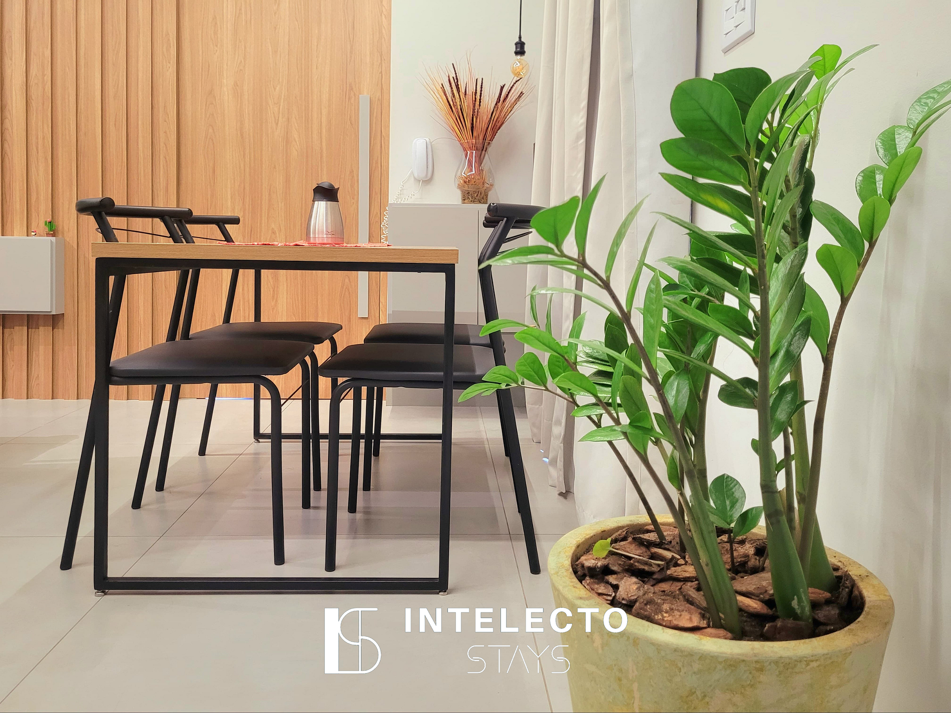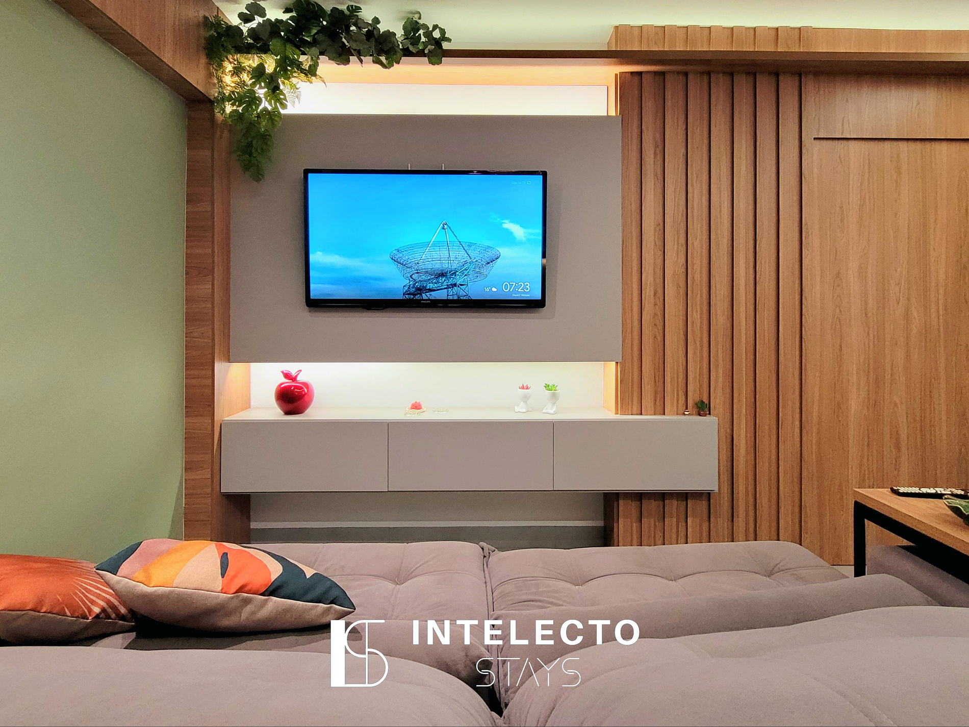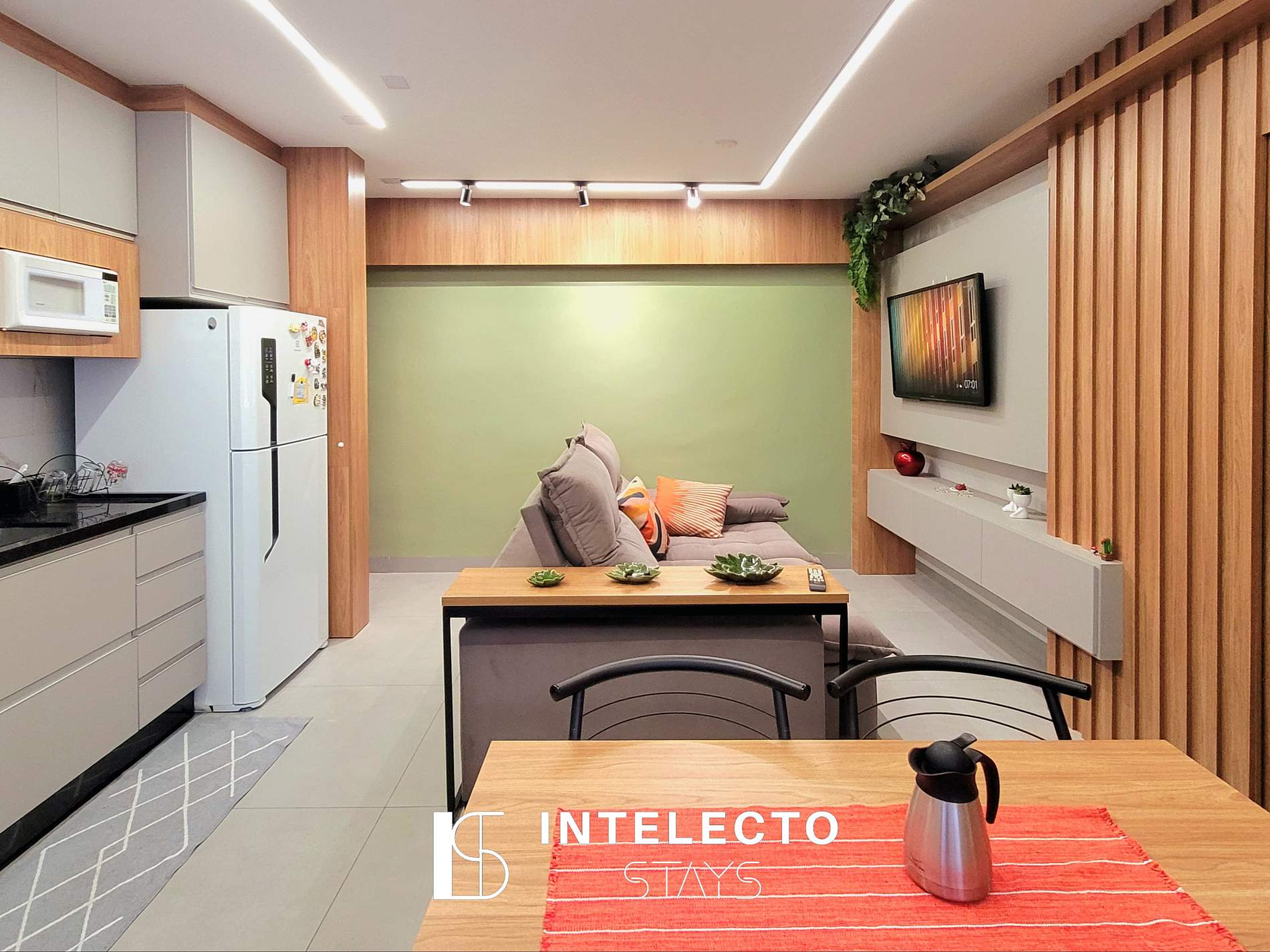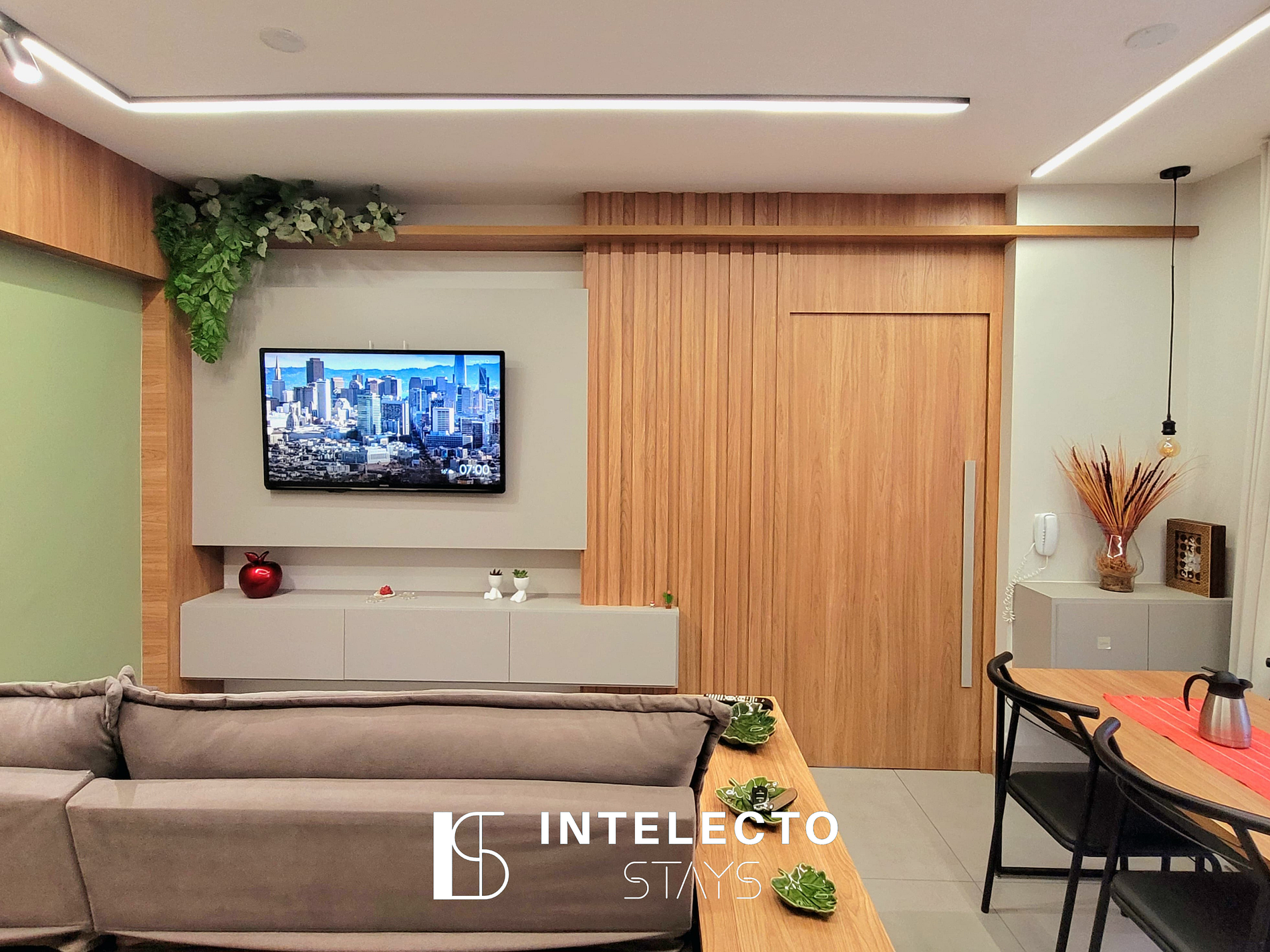 - Sala de dois ambientes com mesa de 4 lugares, sofá super confortável e Smart TV com streamings