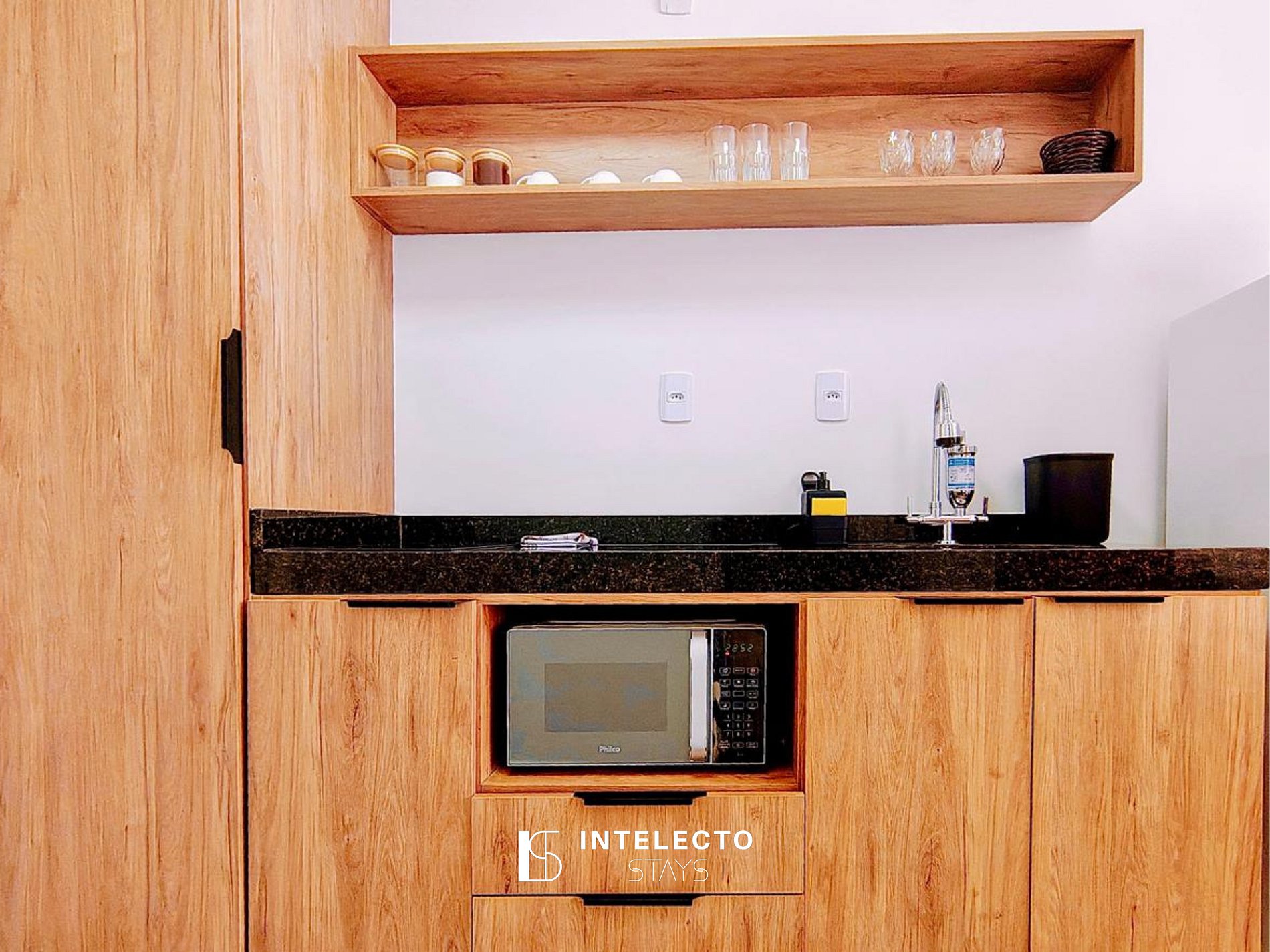 - Espaços integrados (quarto com cama queen e sofá-cama) com armários e guarda-roupas planejados