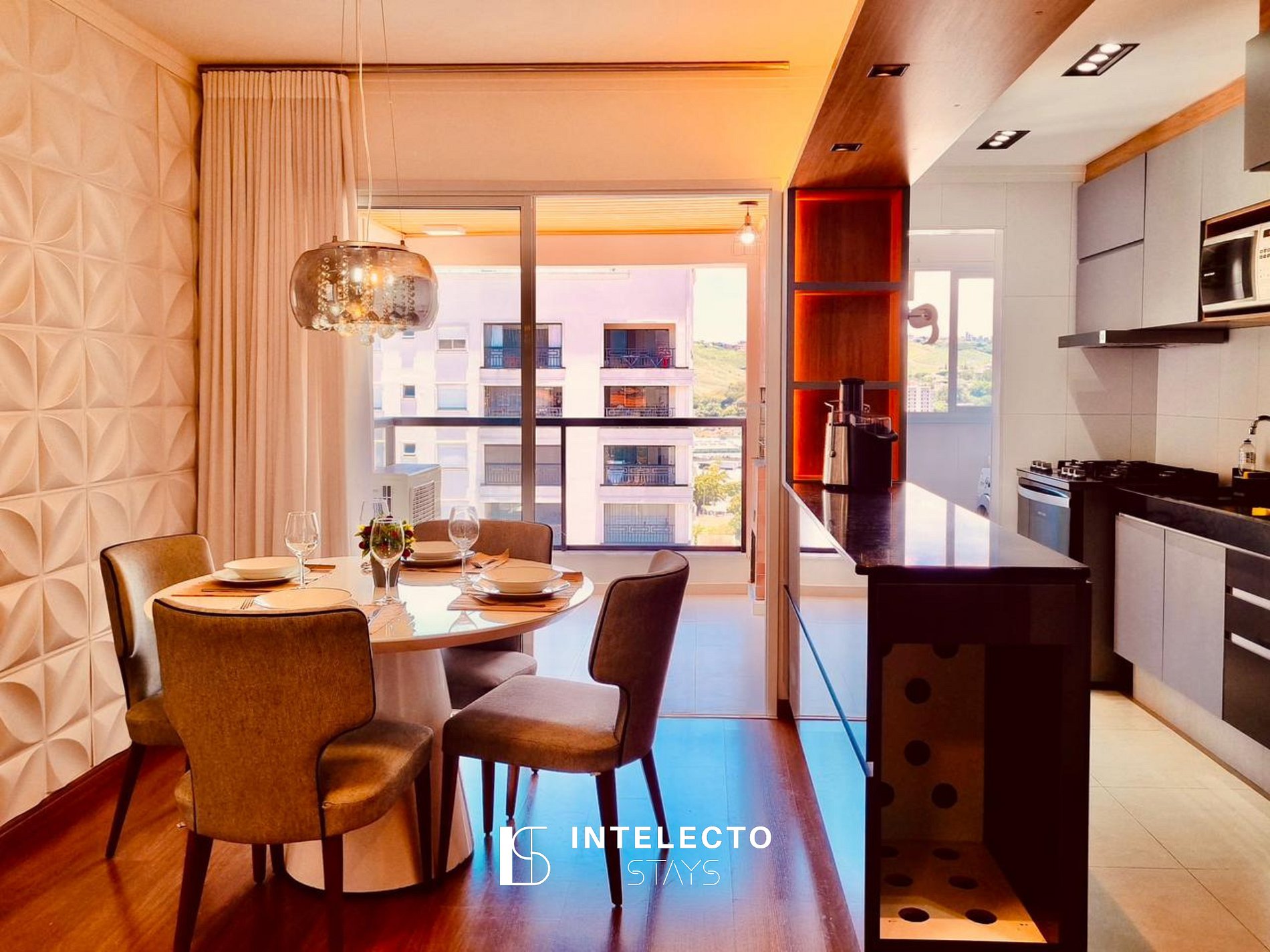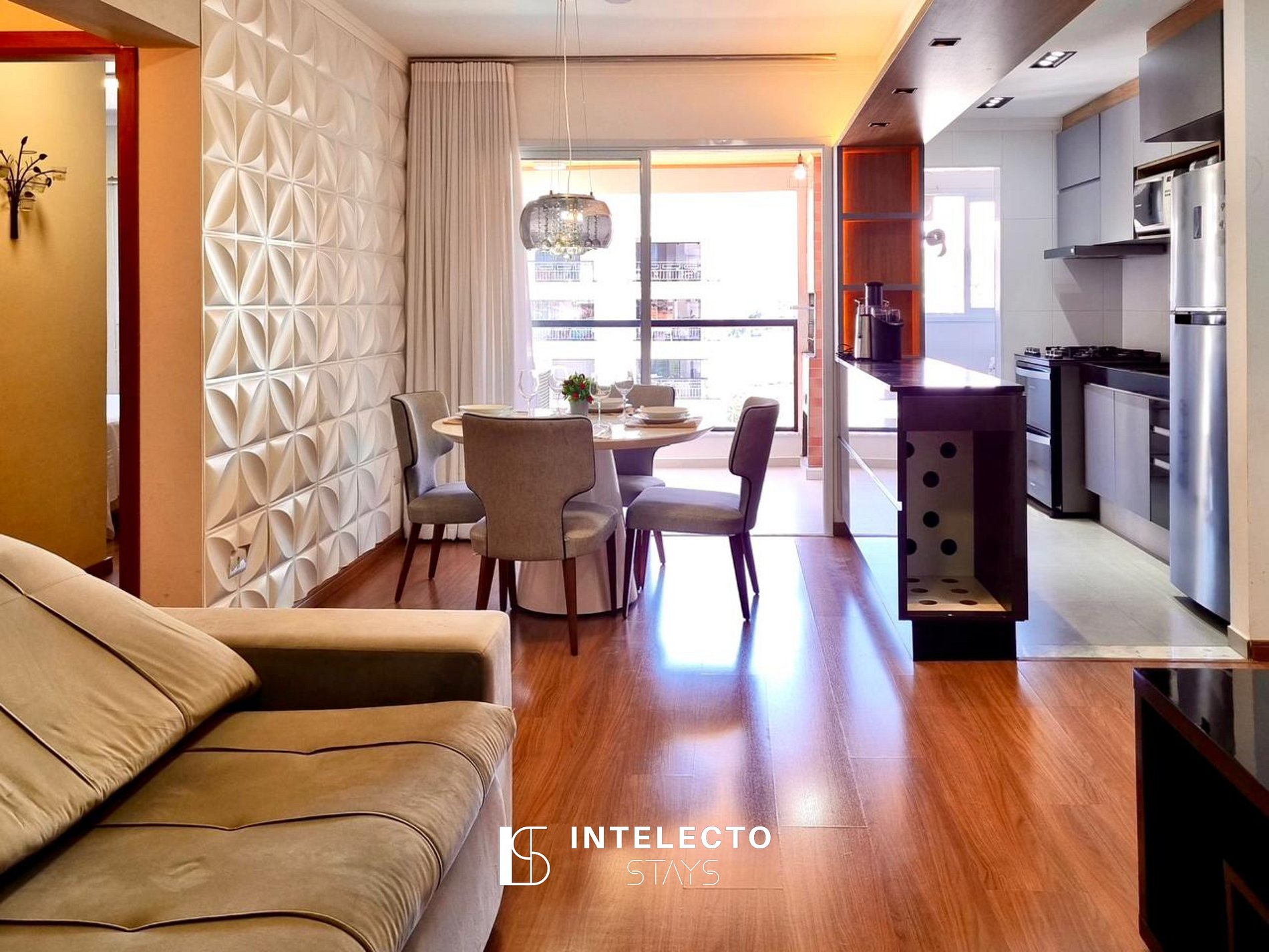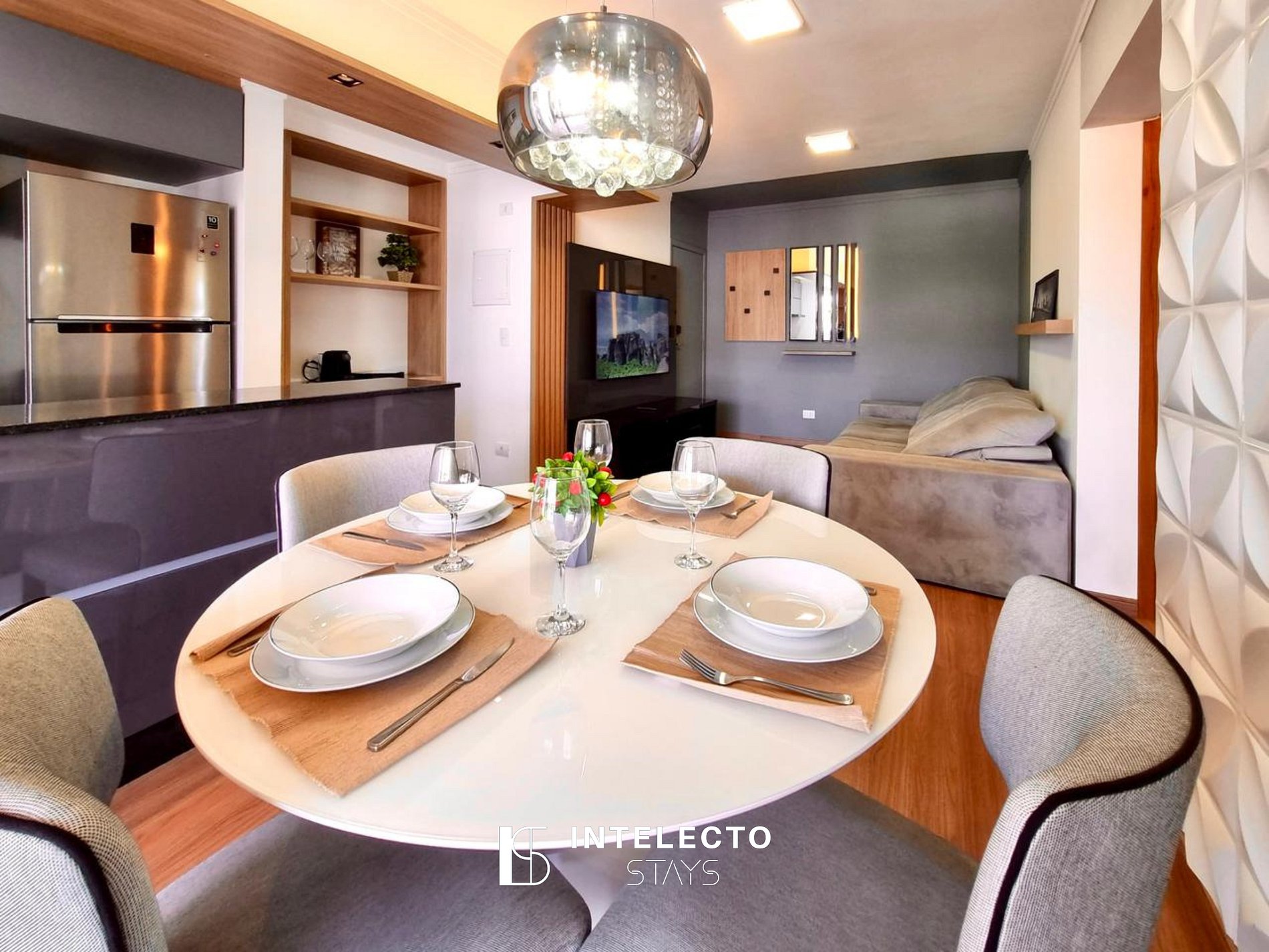 - Sala de dois ambientes, mesa de 4 lugares, sofá-cama e Smart TV com streamings
