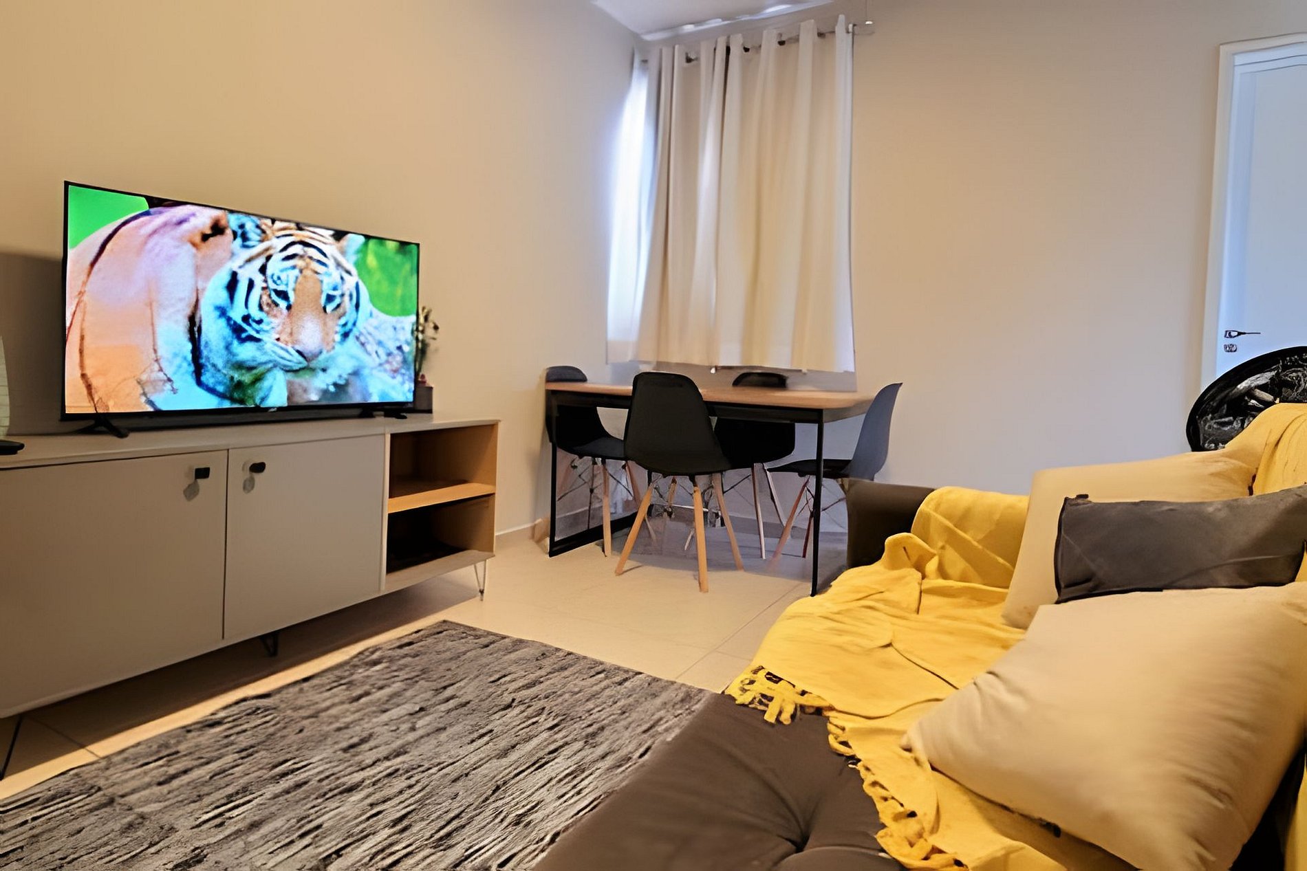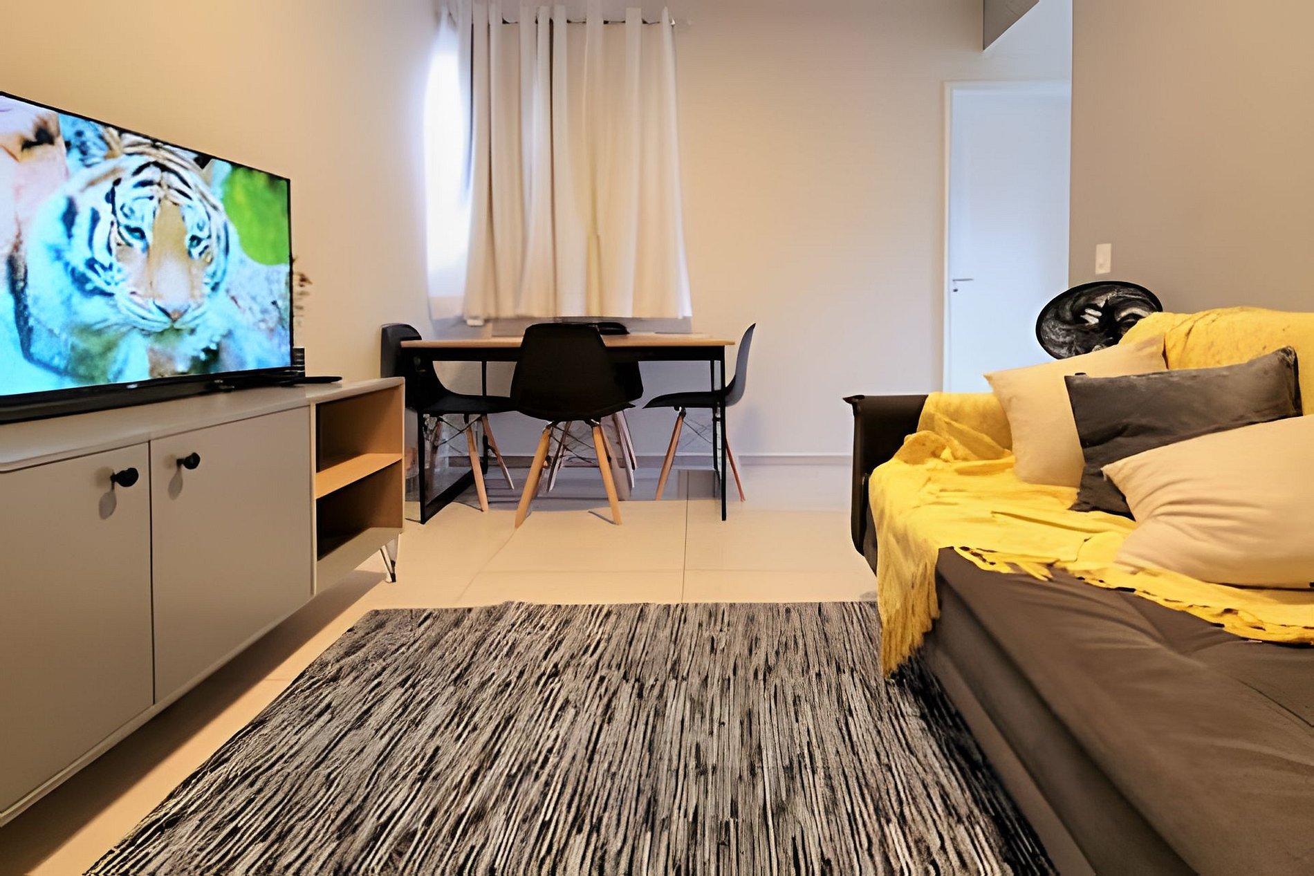 - Sala de dois ambientes com mesa de 4 lugares, sofá-cama confortável e SmarTV com streamings
