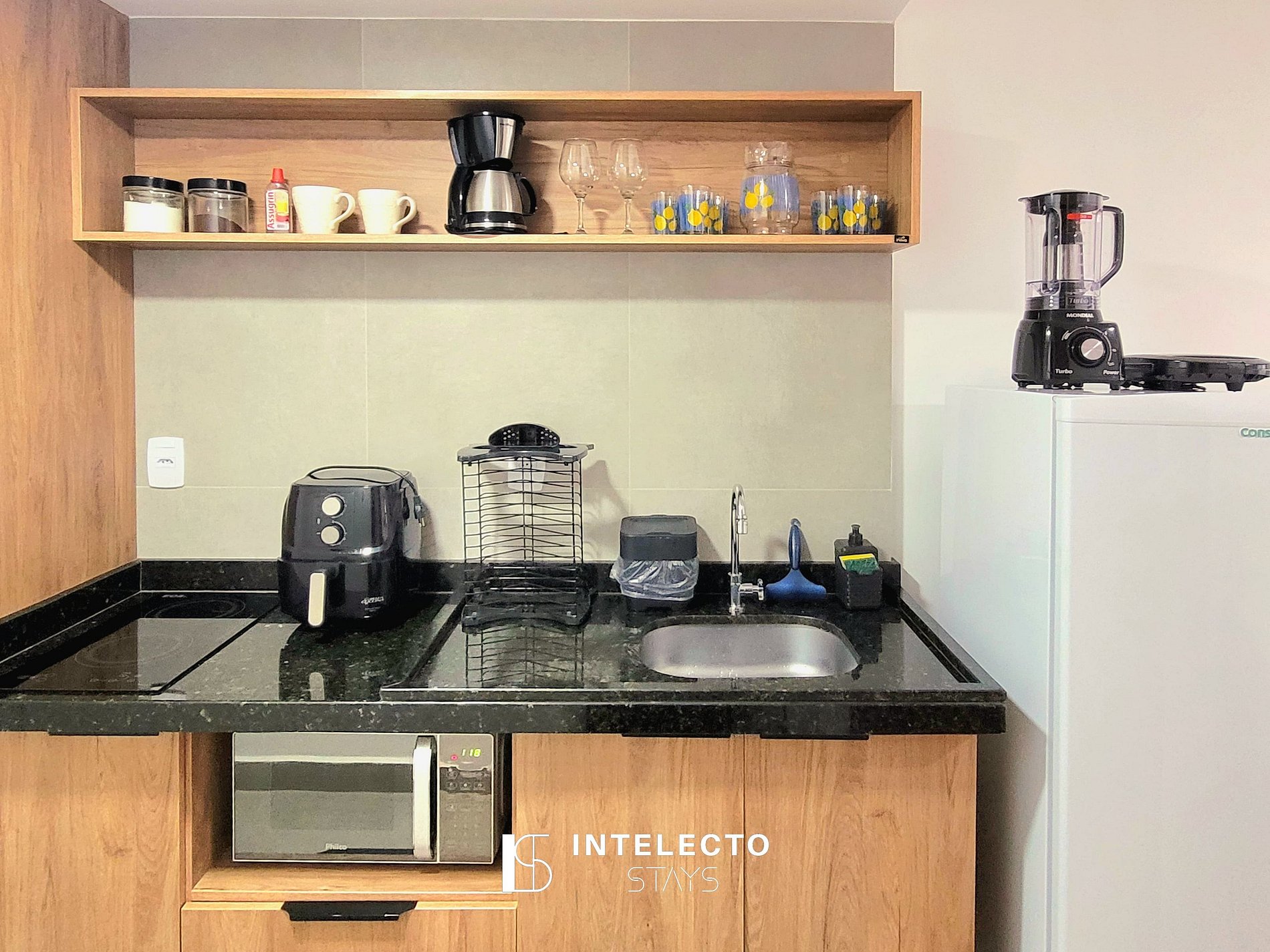 - Espaços integrados (quarto com cama queen e sala de estar com sofá-cama) com armários e guarda-roupas planejados