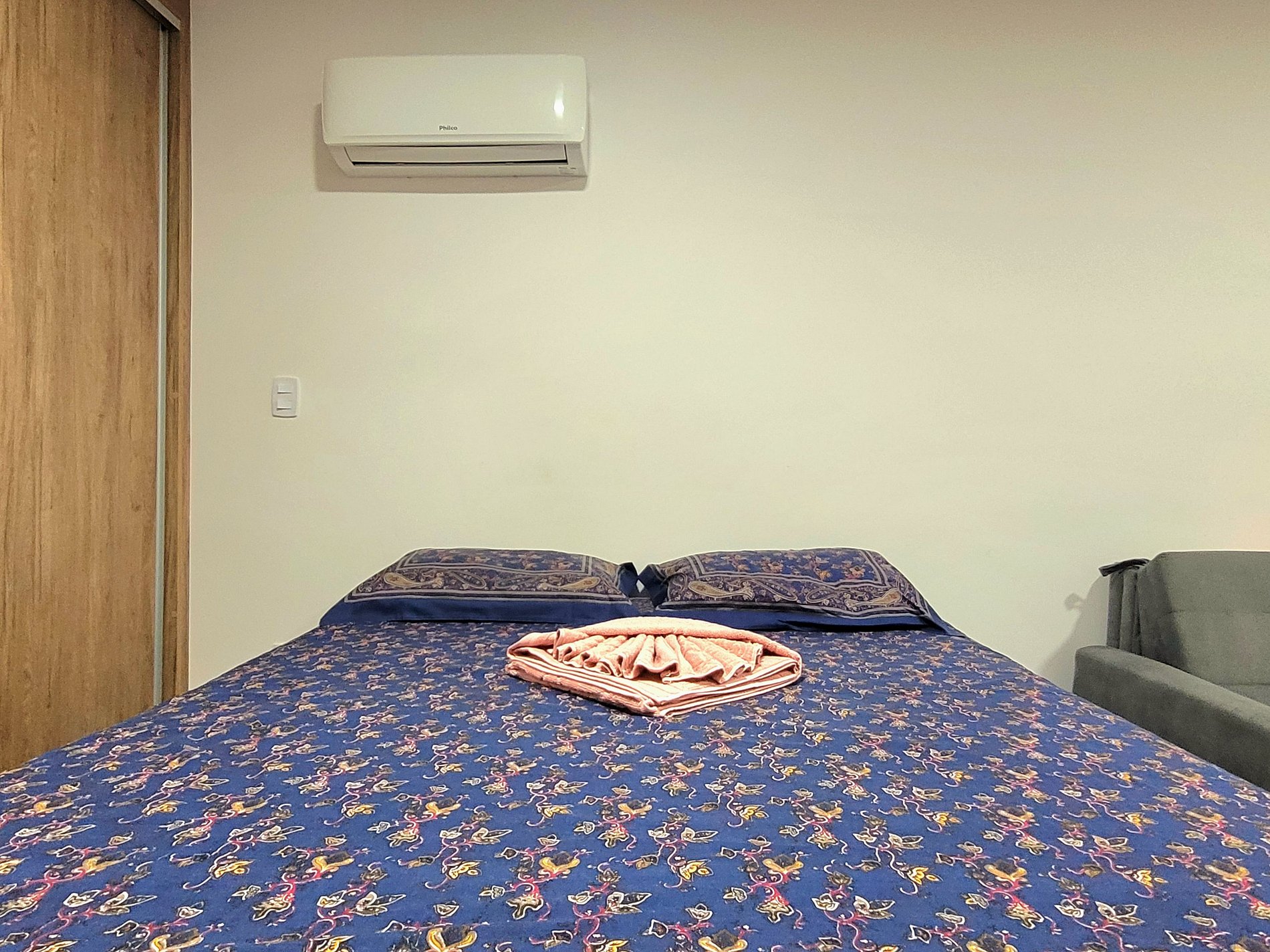 - Espaços integrados (quarto com cama queen e sala de estar com sofá-cama) com armários e guarda-roupas planejados