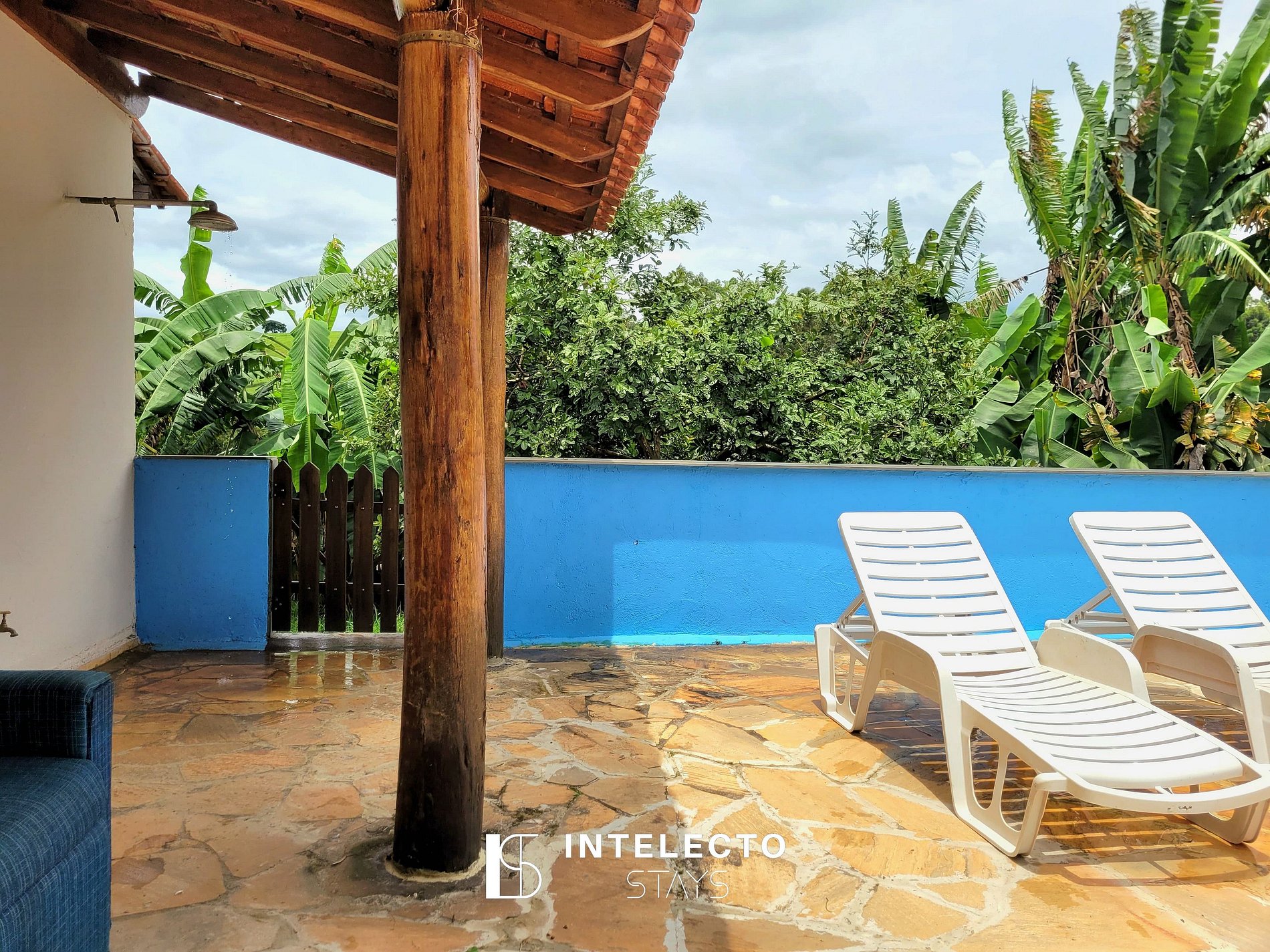 - Área de lazer com piscina, espreguiçadeiras, ducha, churrasqueira a carvão, mesas, cadeiras e geladeira