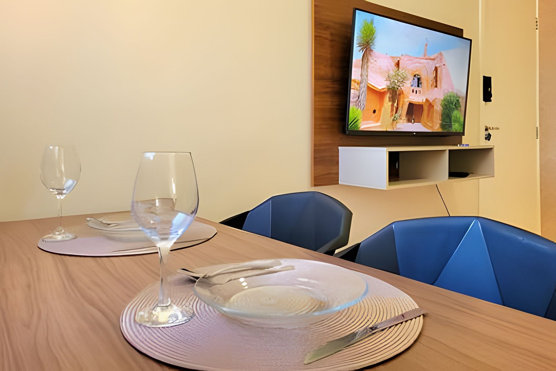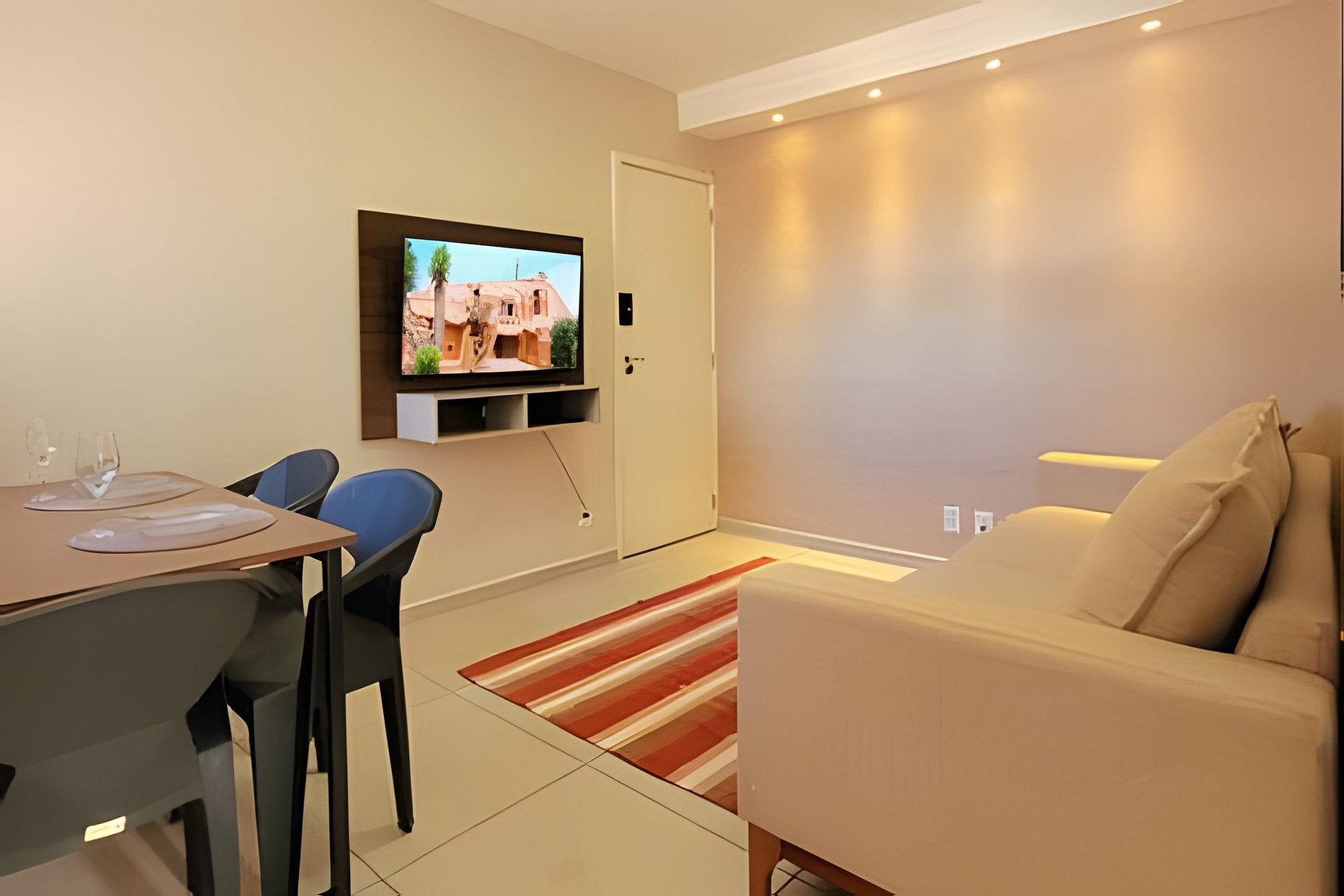 - sala de dois ambientes com mesa de 3 lugares, sofá-cama e Smart TV com streamings.
