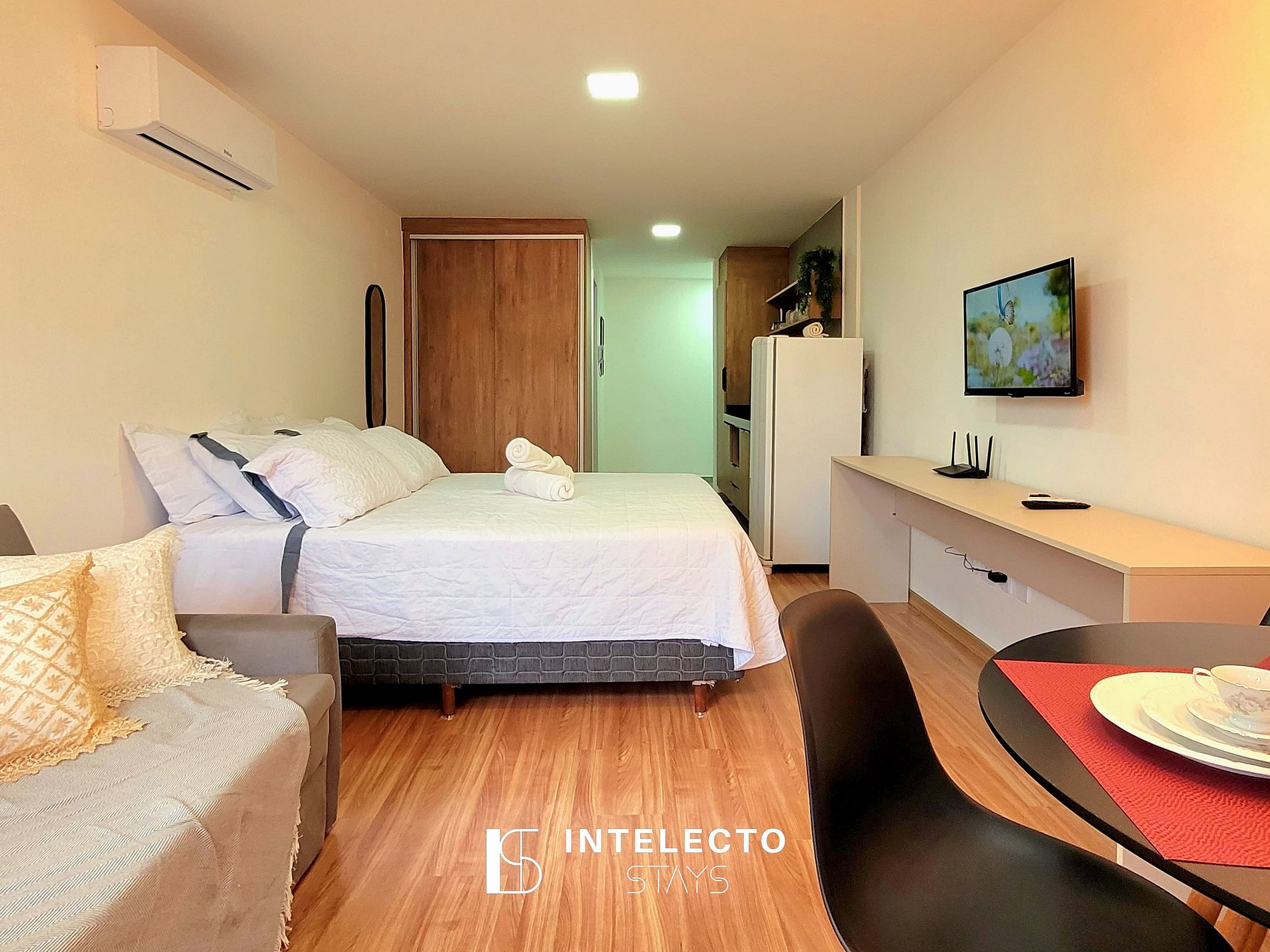 - Espaços integrados (quarto com cama queen e sala de estar com sofá-cama) com armários e guarda-roupas planejados