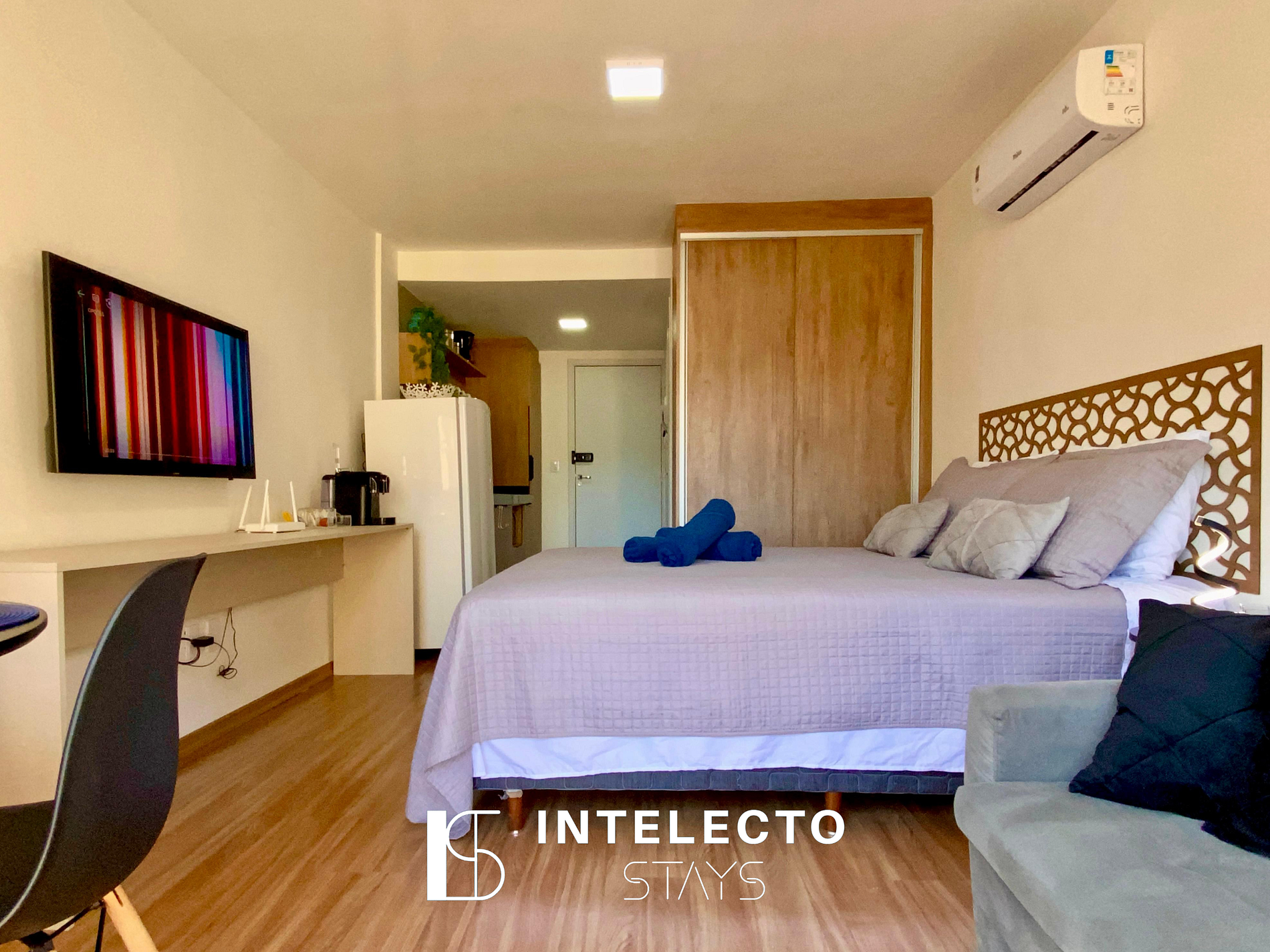 - Espaços integrados (quarto com cama queen e sala de estar com sofá-cama) com armários e guarda-roupas planejados