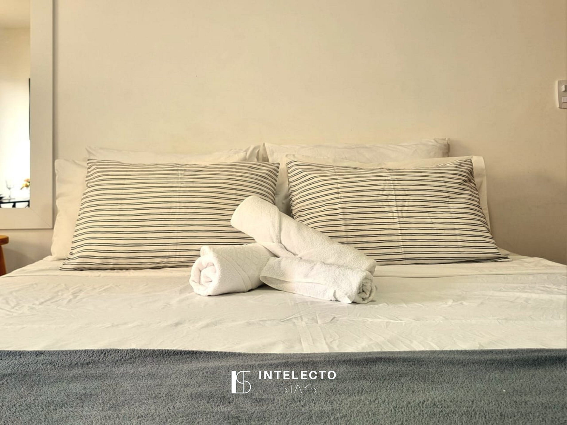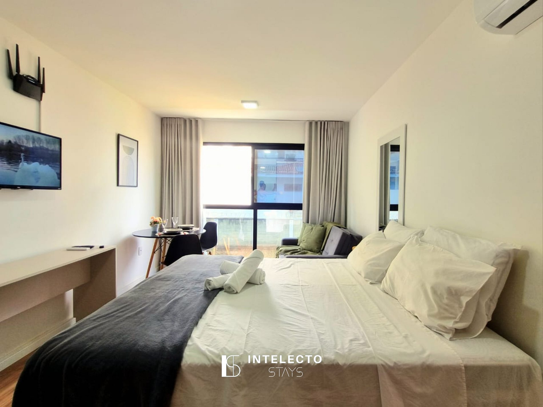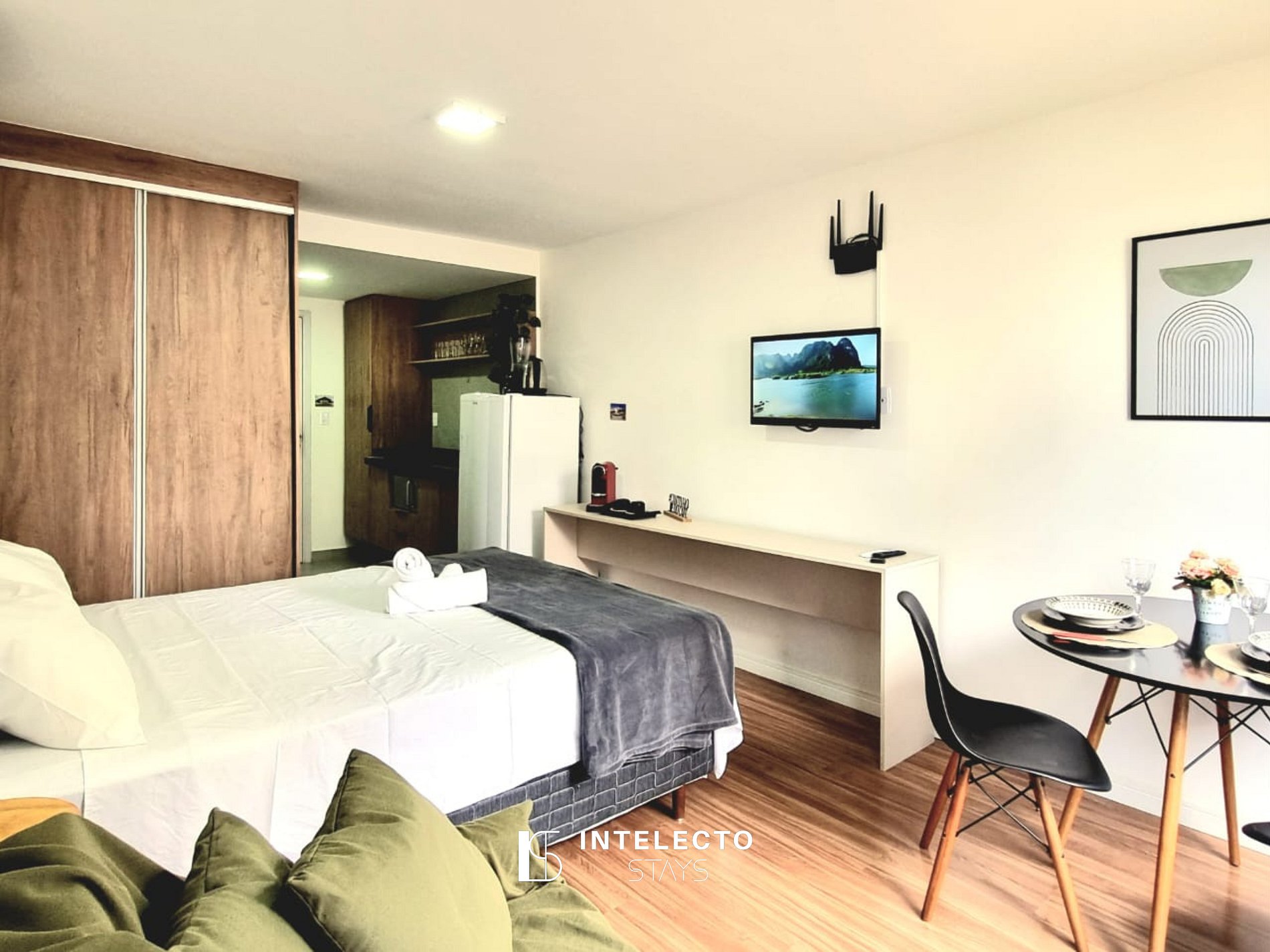 - Espaços integrados (quarto com cama queen e sala de estar com sofá-cama) com armários e guarda-roupas planejados