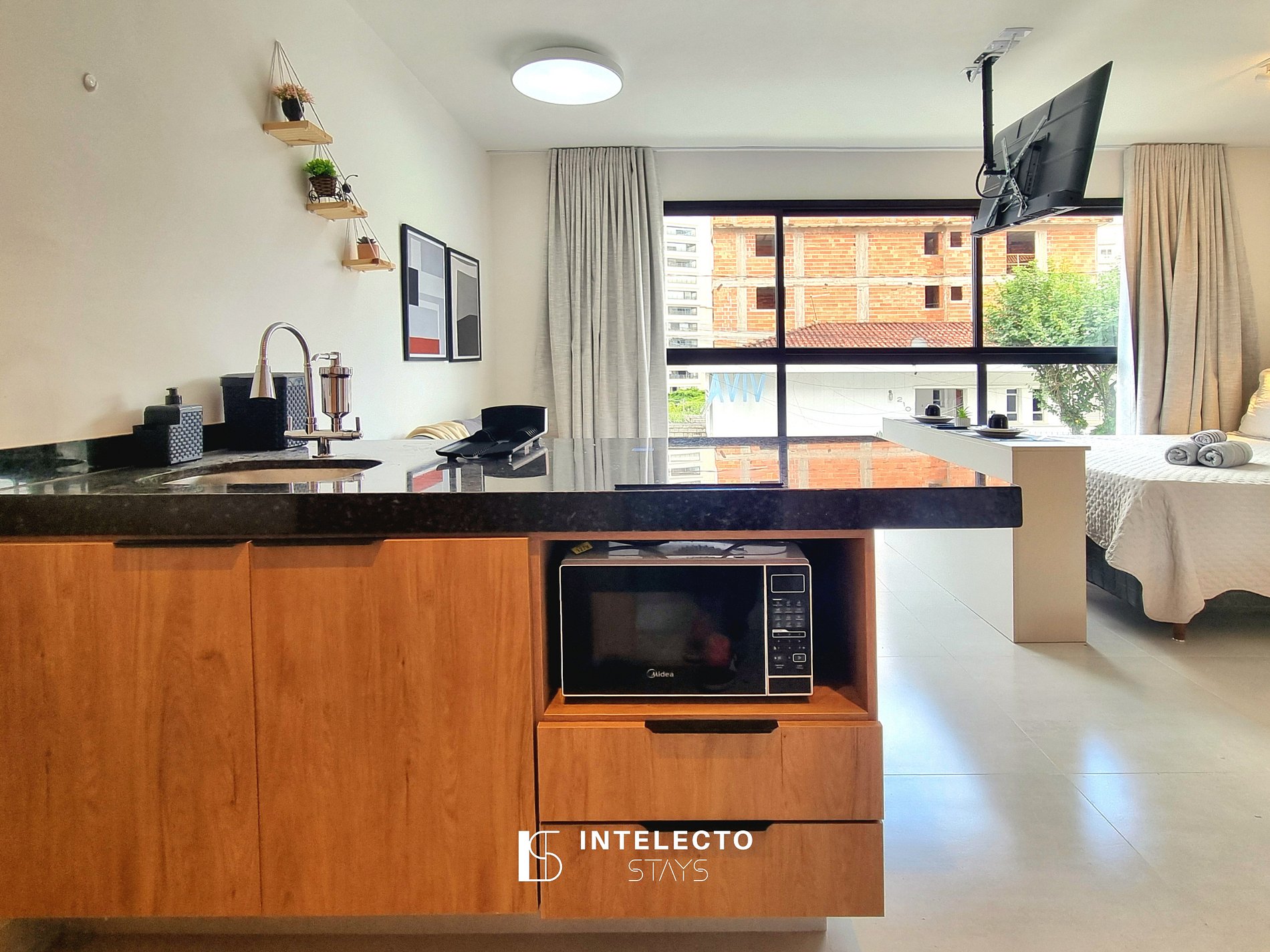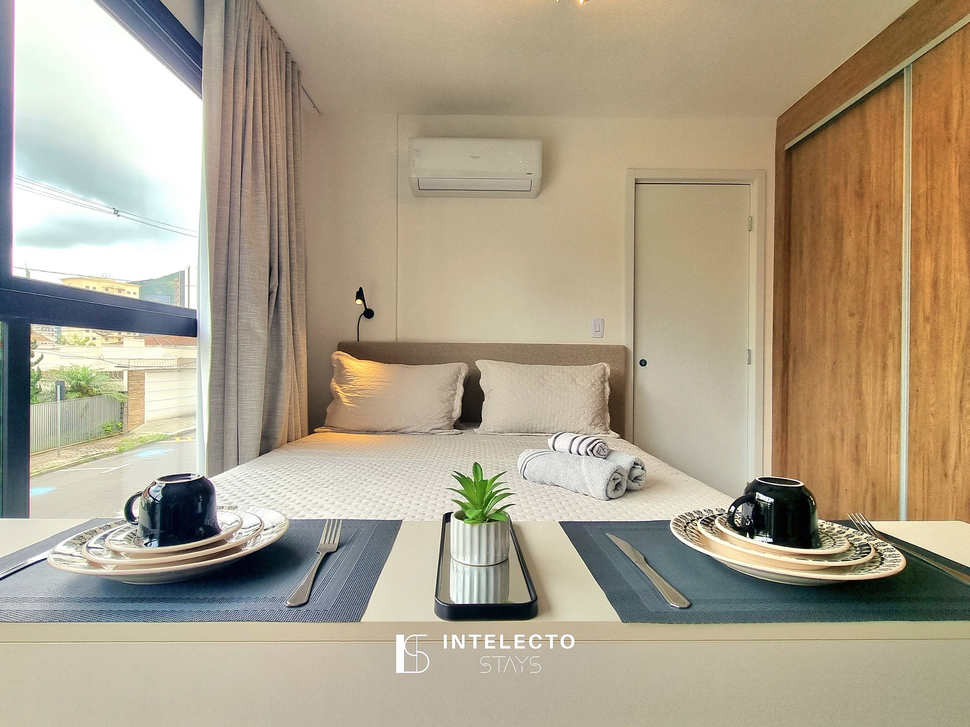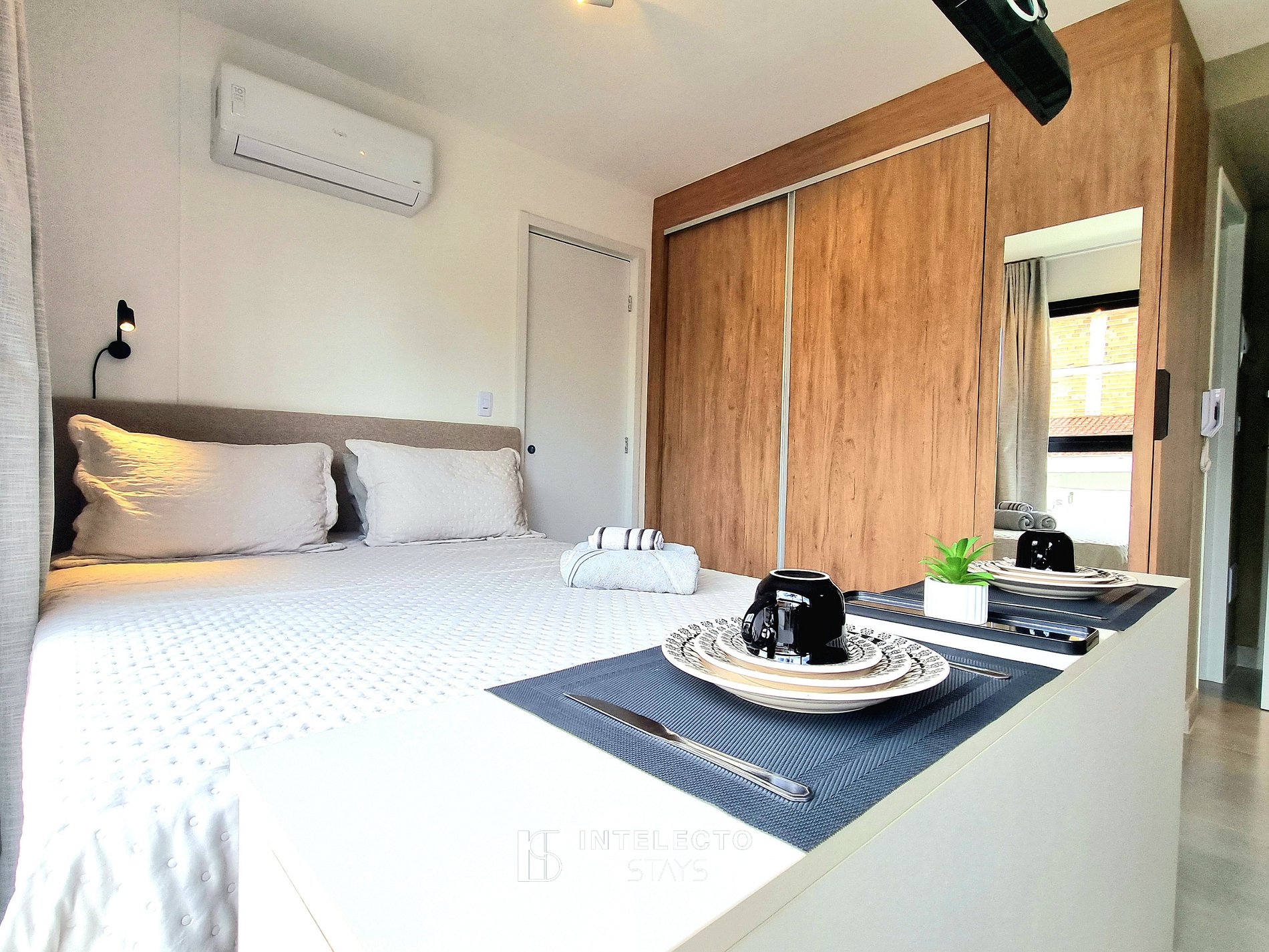 - Espaços integrados (quarto com cama queen e sala de estar com sofá-cama) com armários e guarda-roupas planejados
