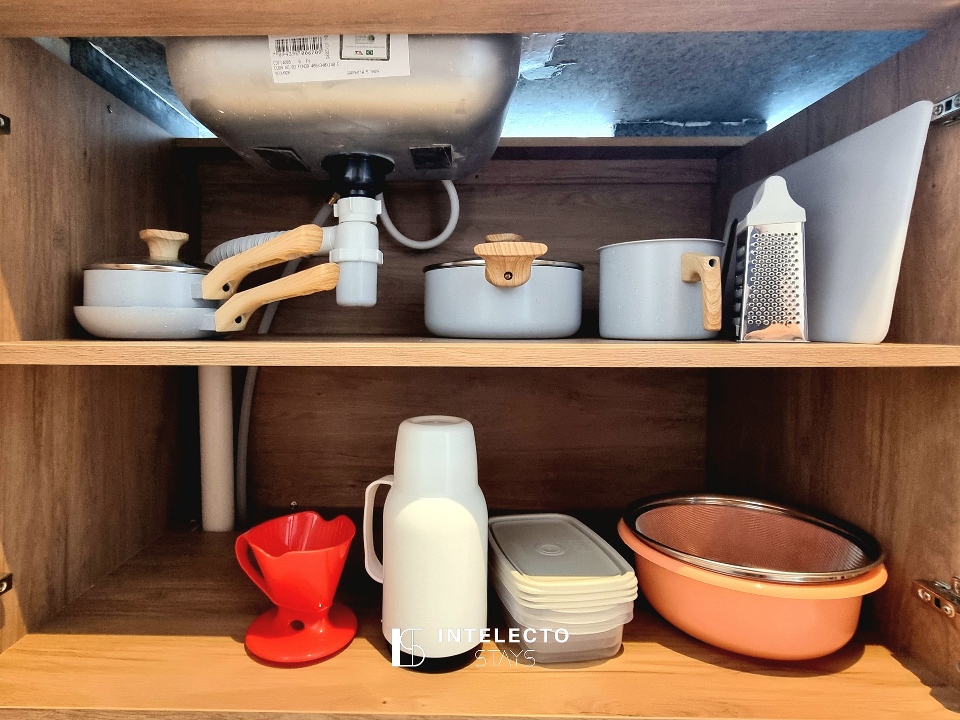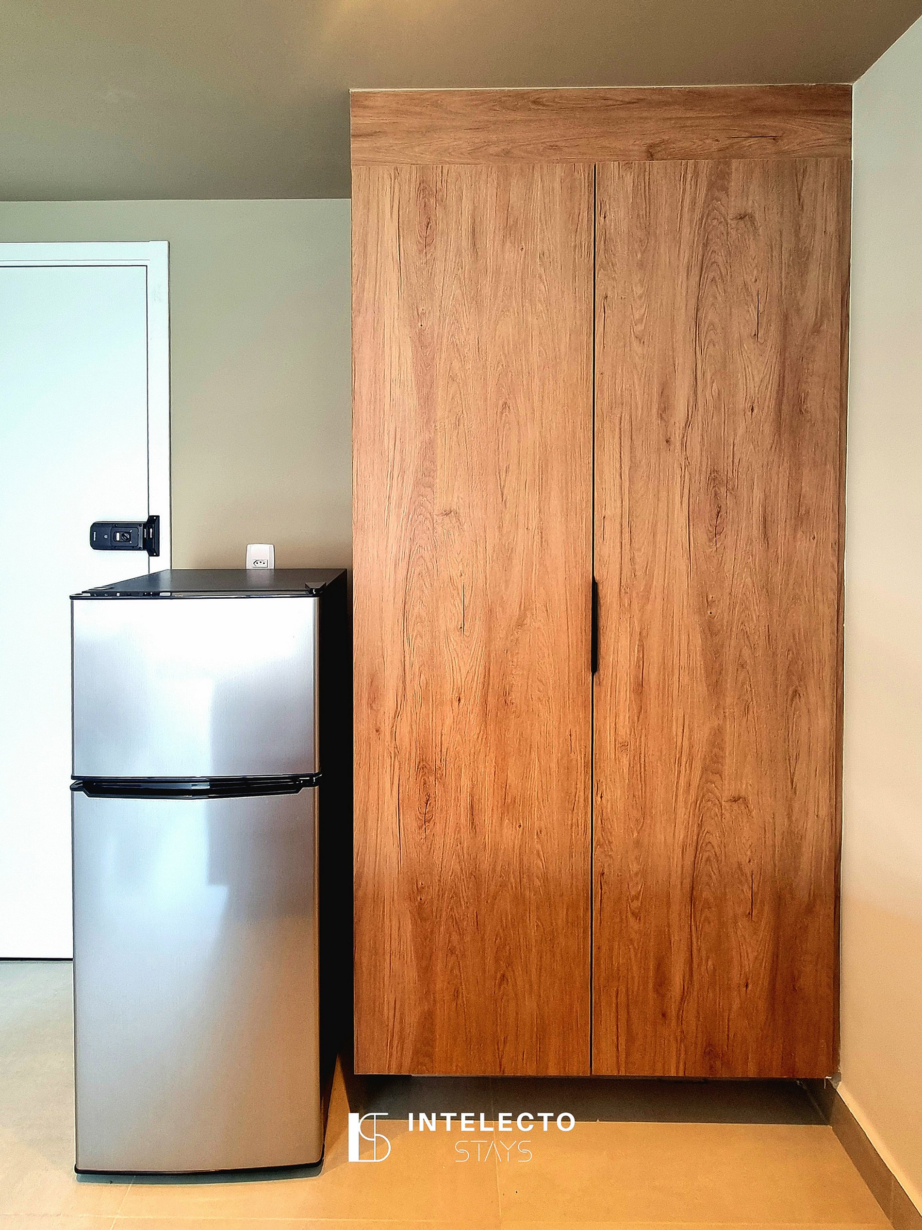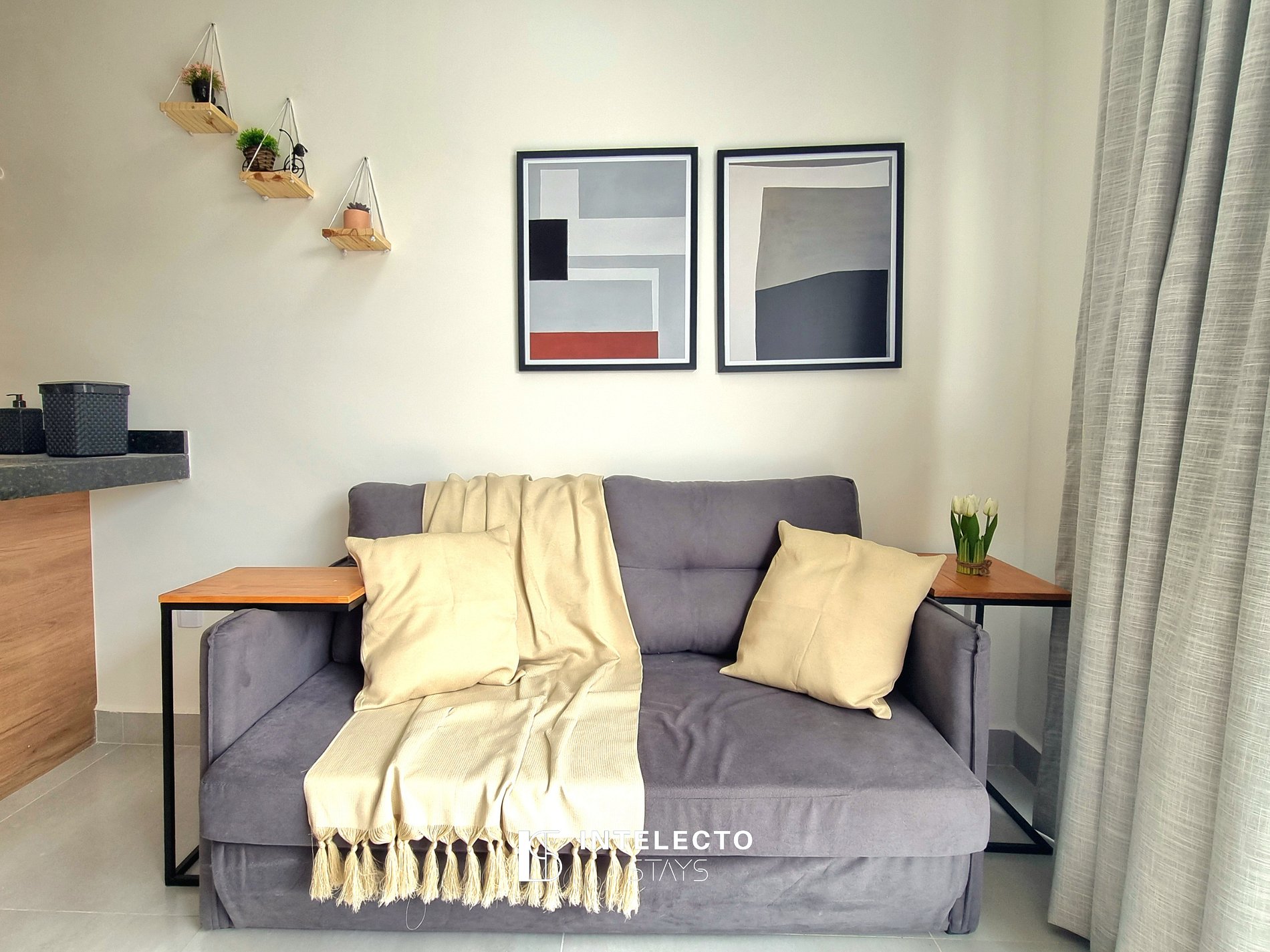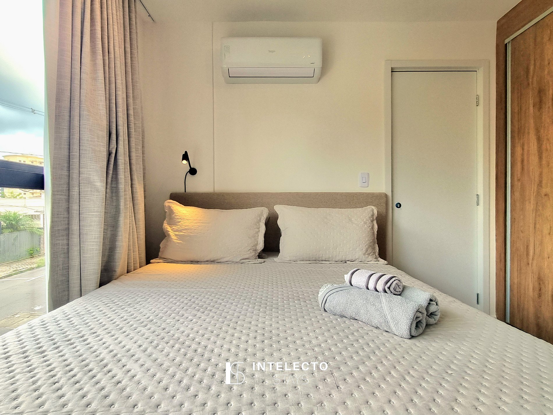 - Espaços integrados (quarto com cama queen e sala de estar com sofá-cama) com armários e guarda-roupas planejados