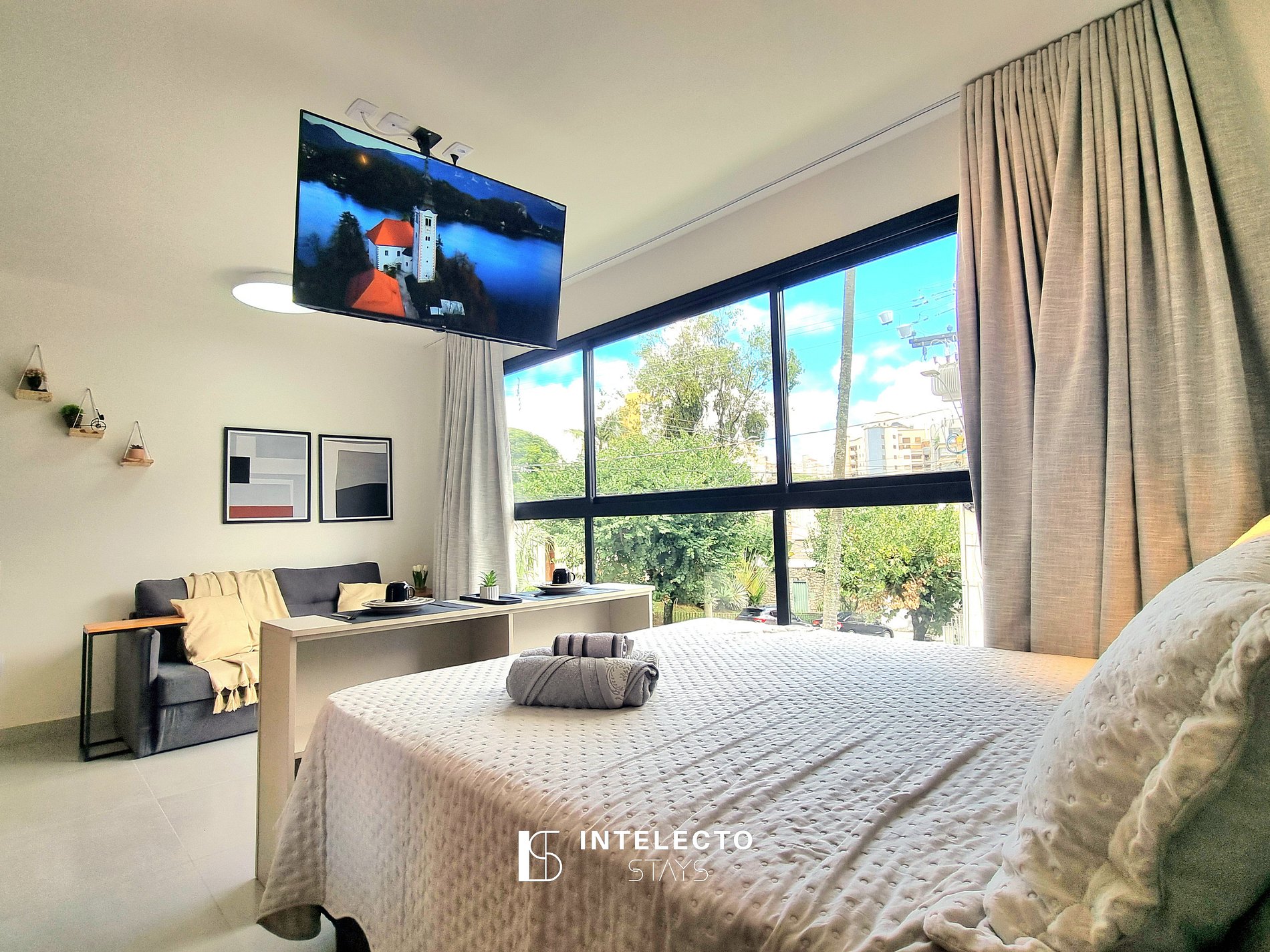 Situado na área central de Poços, perto de tudo. É muito tranquilo, seguro e organizado, com portaria 24 horas, self check-in com reconhecimento facial e uma vista linda da cidade.