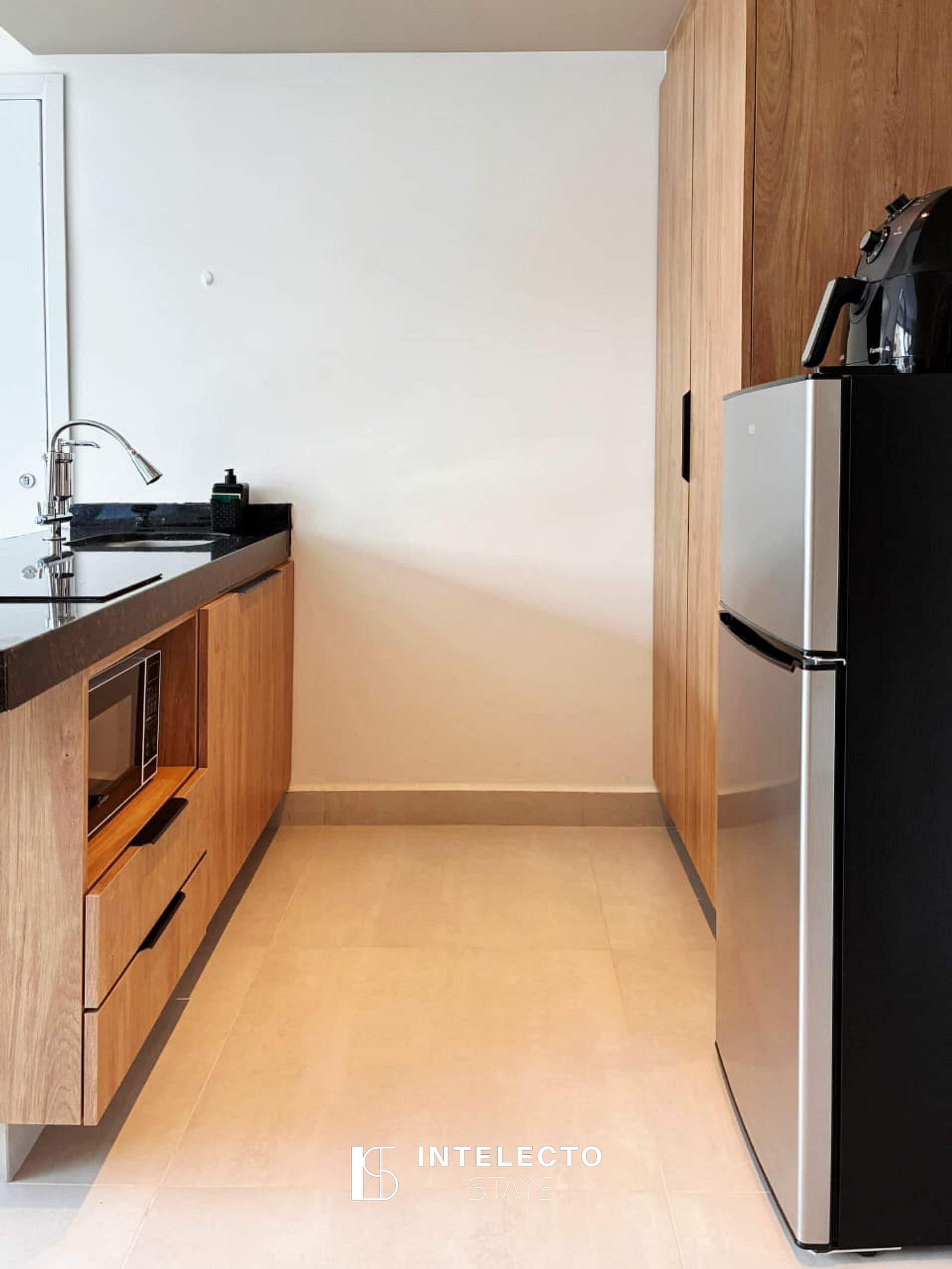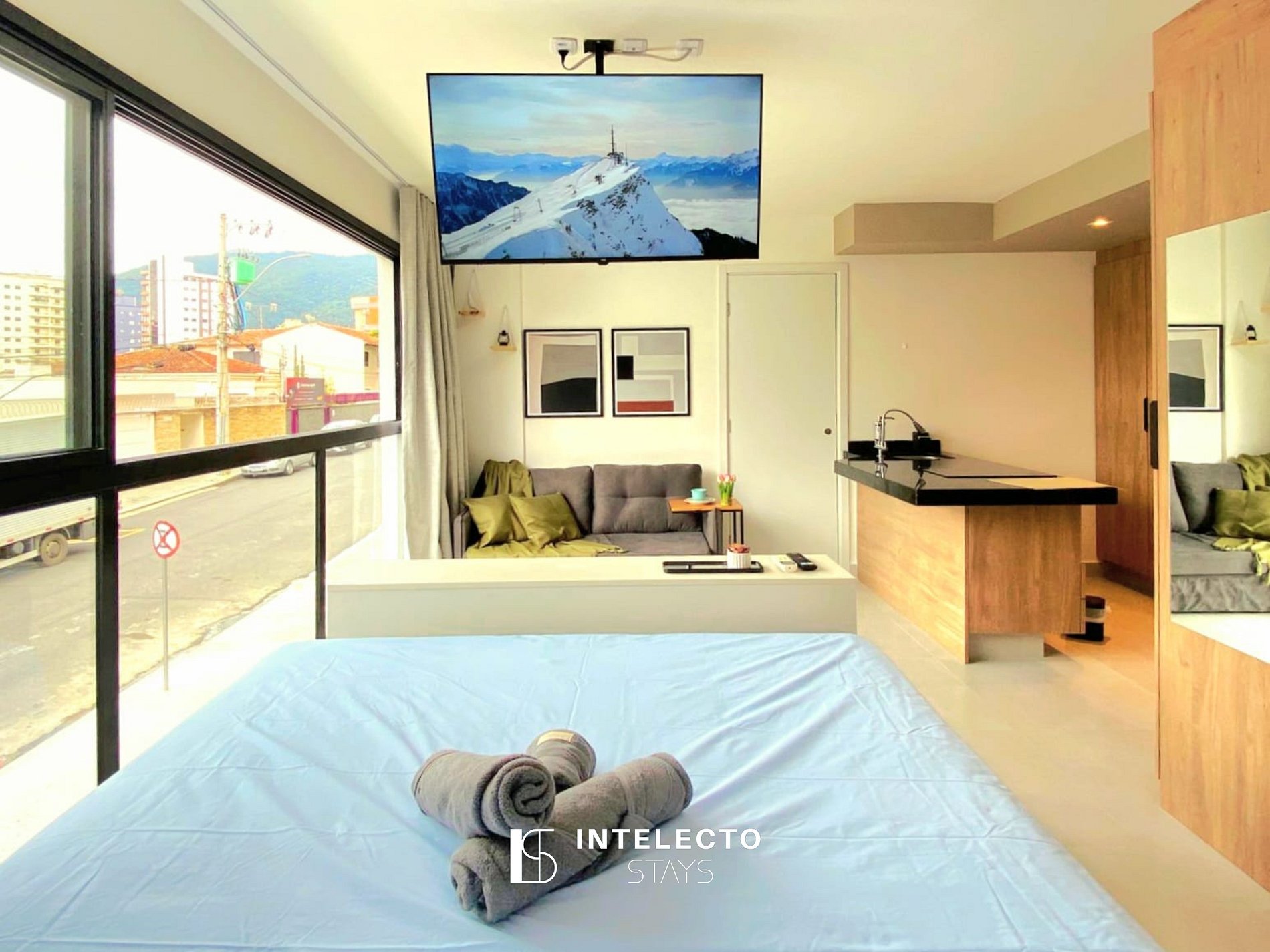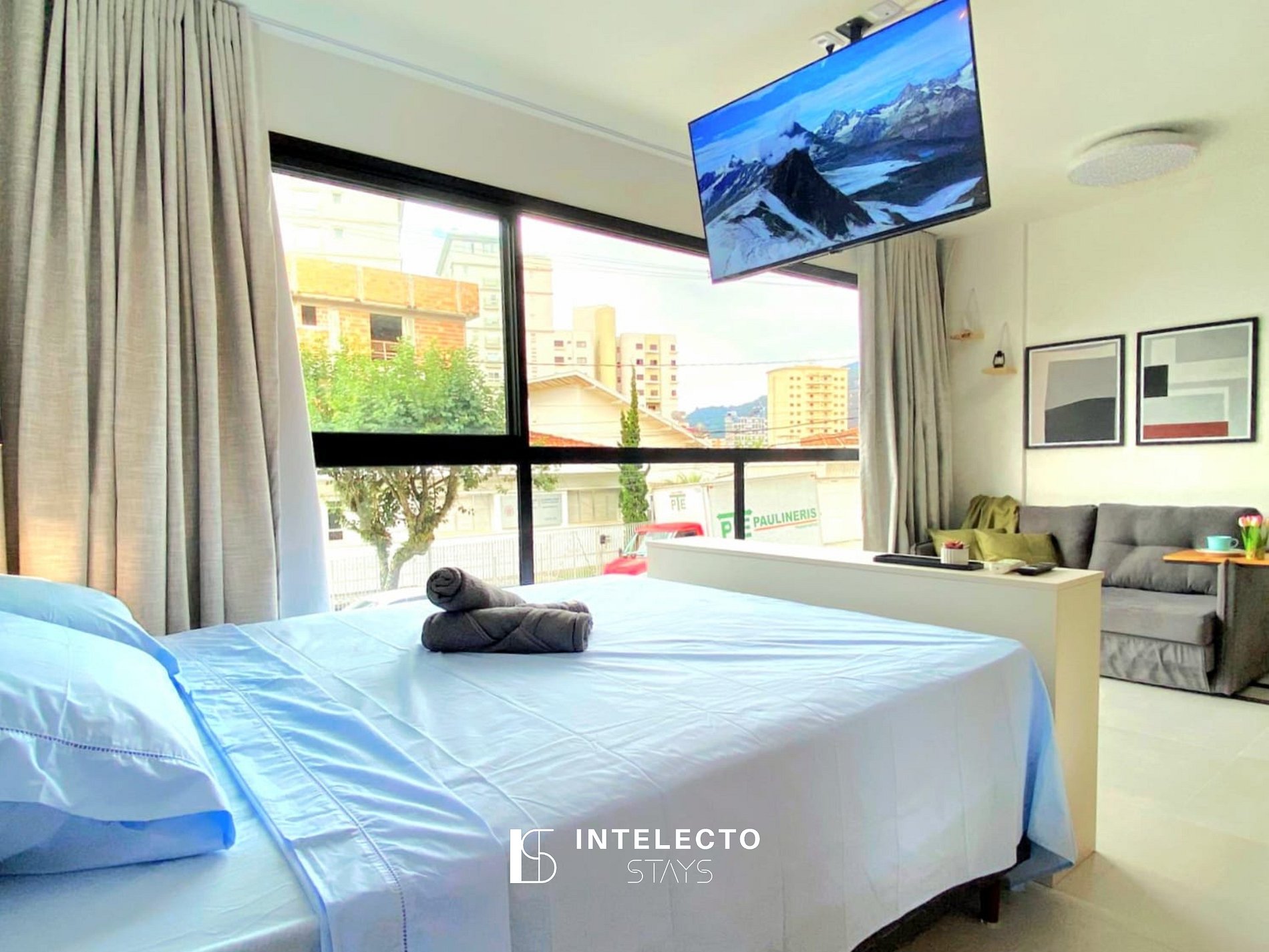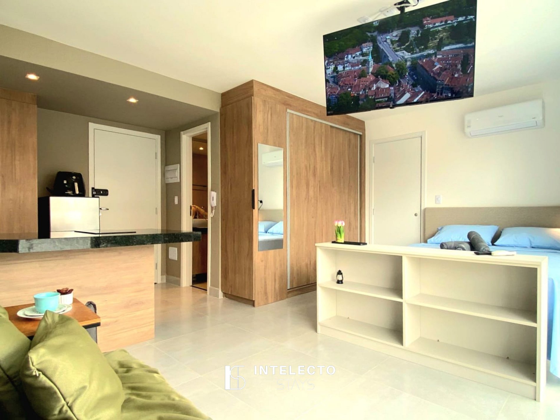 - Espaços integrados (quarto com cama queen e sala de estar com sofá-cama) com armários e guarda-roupas planejados