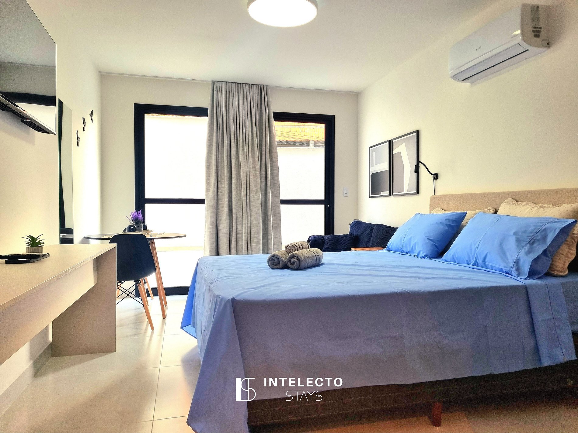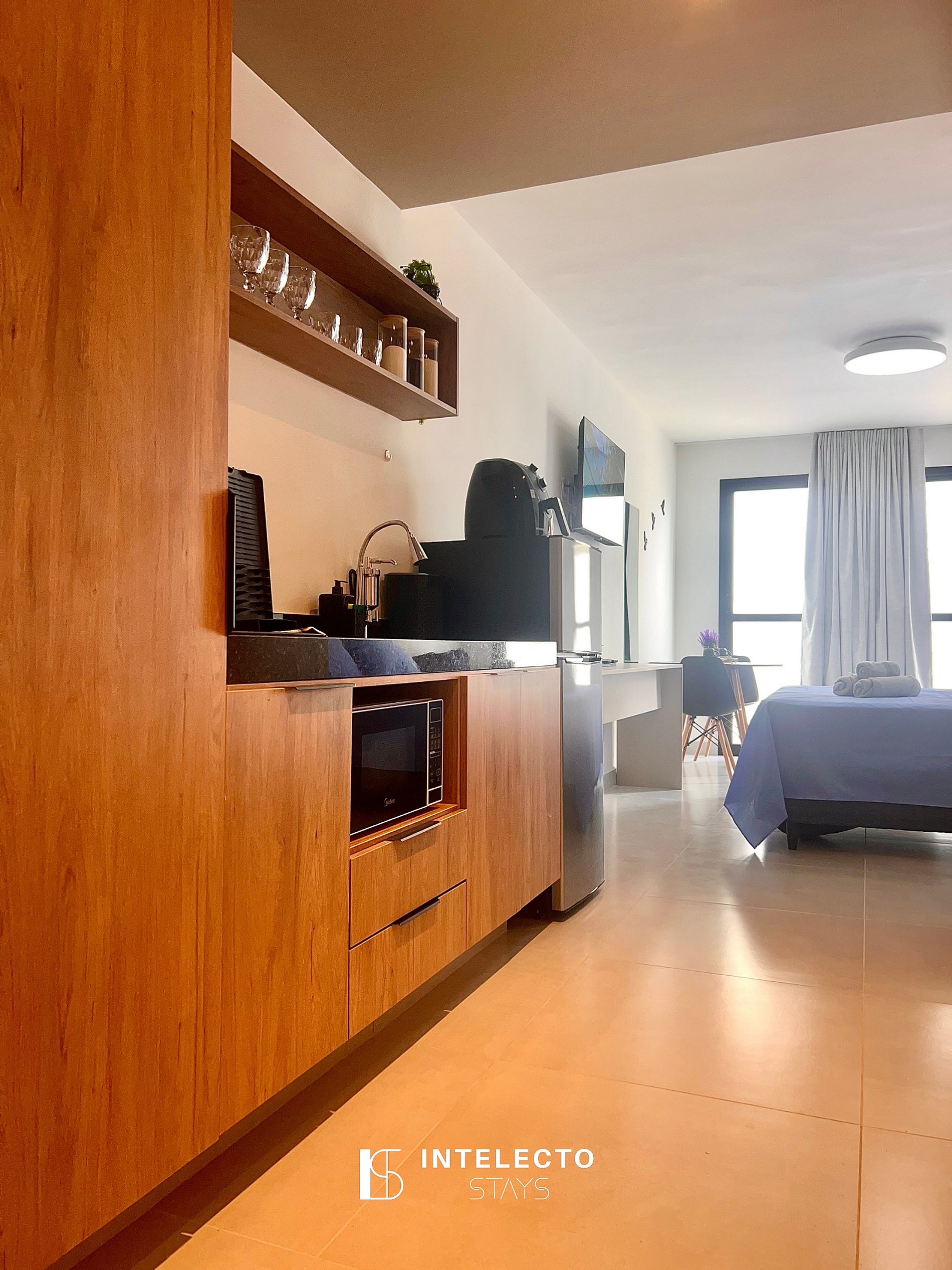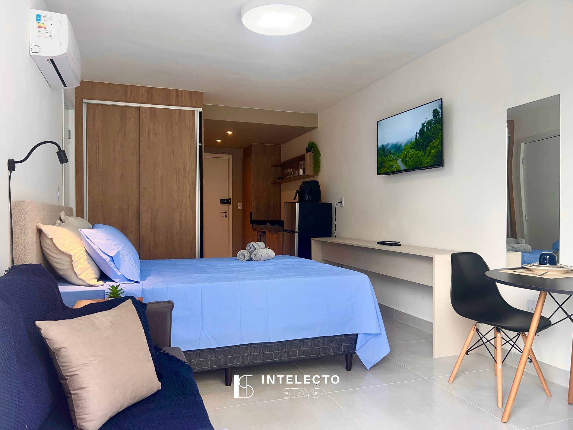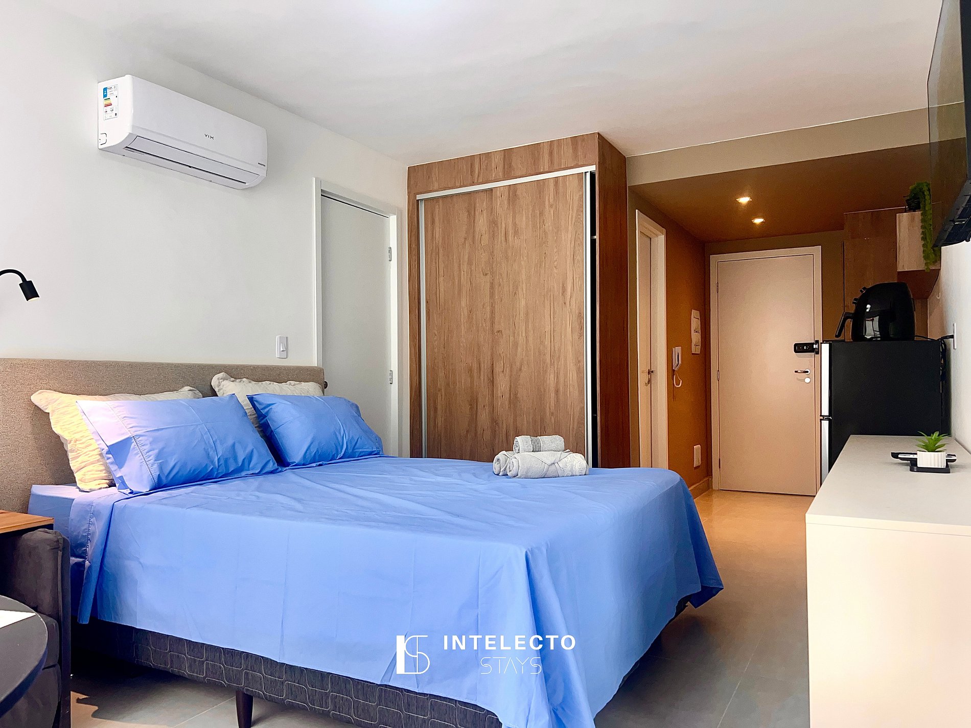 - Espaços integrados (quarto com cama queen e sala de estar com sofá-cama) com armários e guarda-roupas planejados