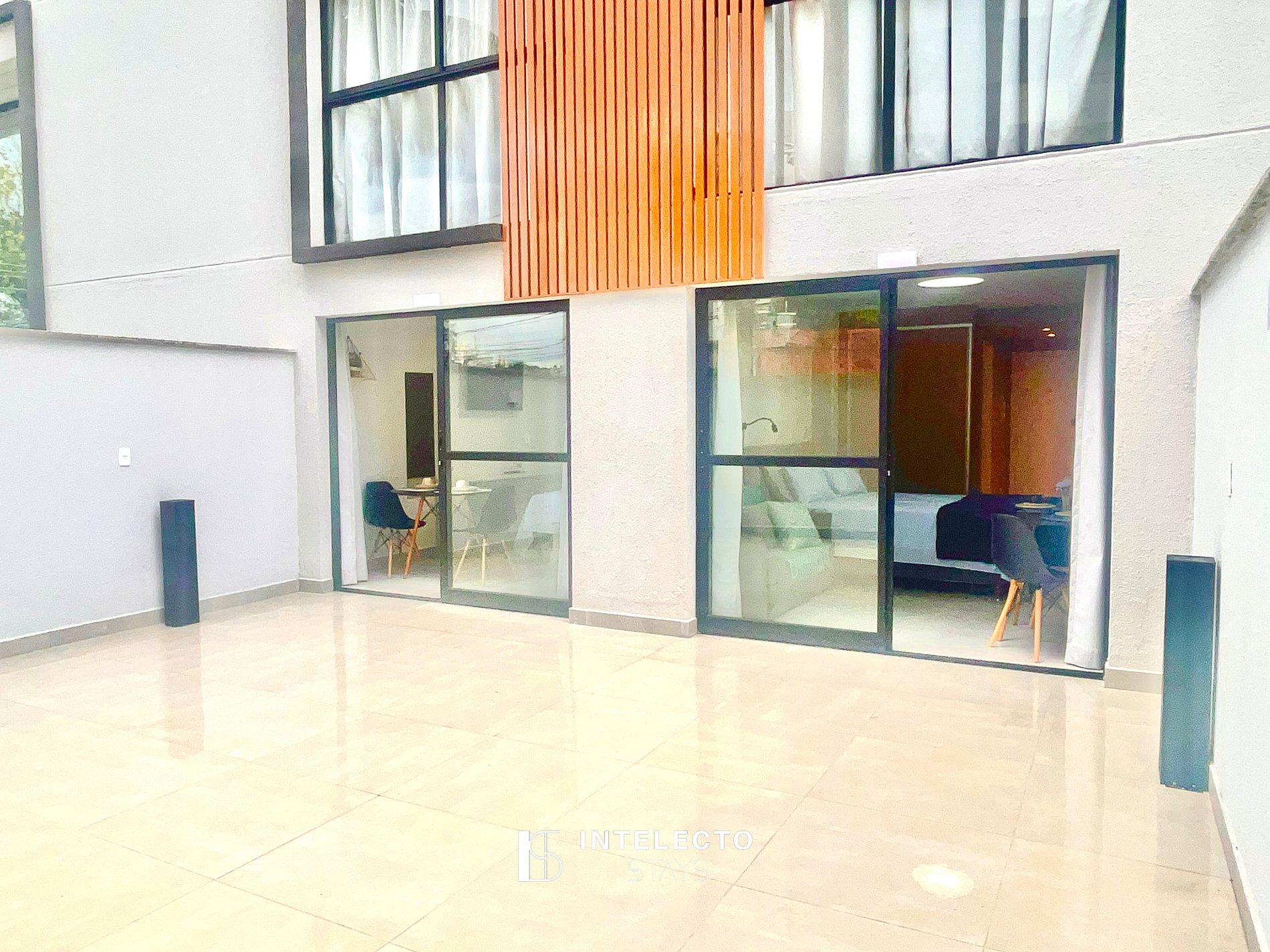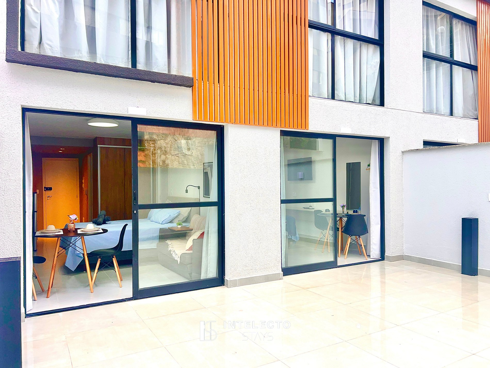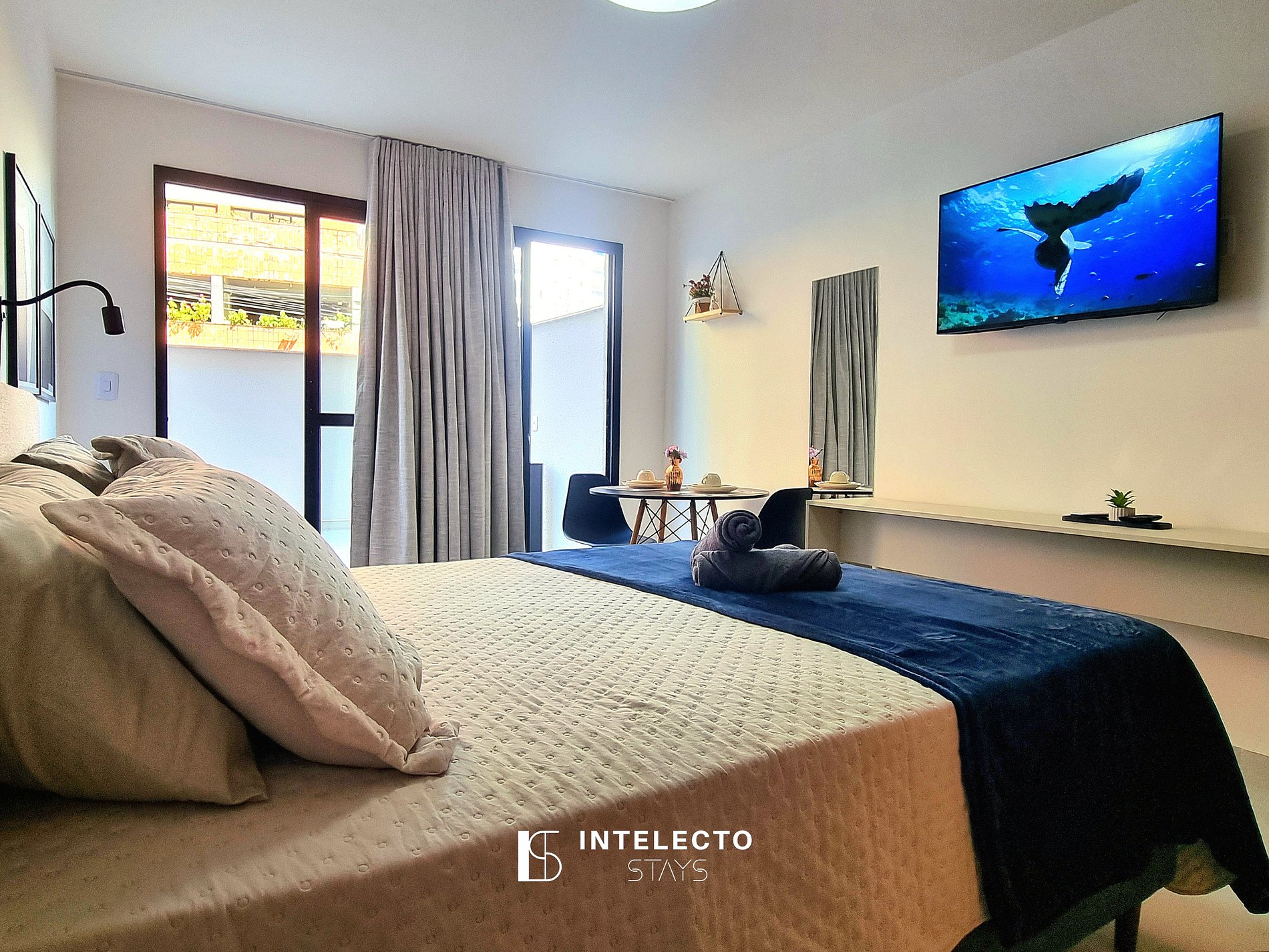 - Espaços integrados (quarto com cama queen e sala de estar com sofá-cama) com armários e guarda-roupas planejados