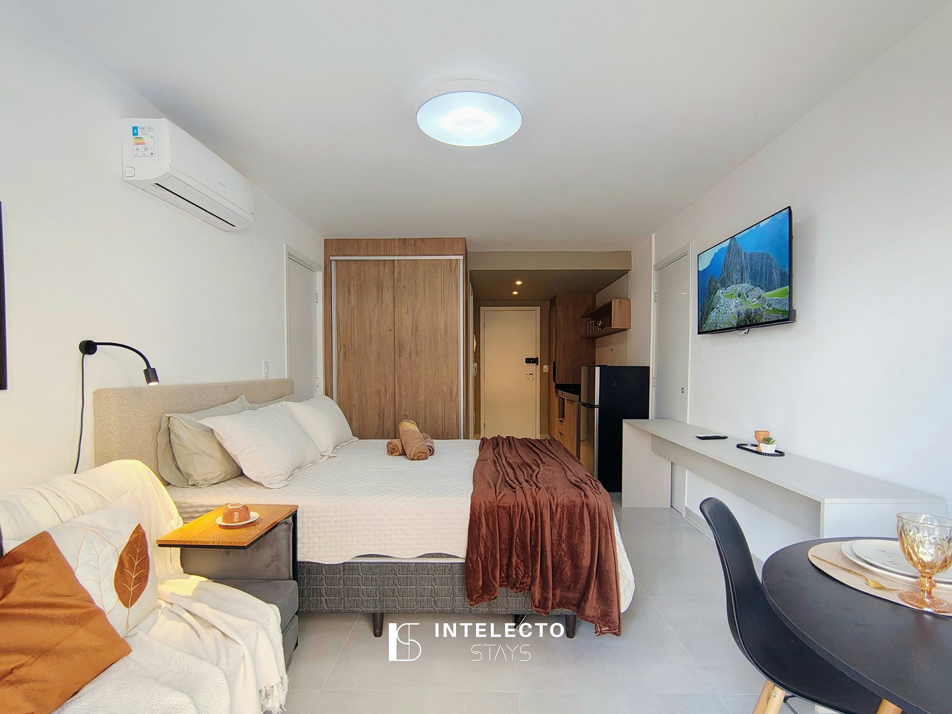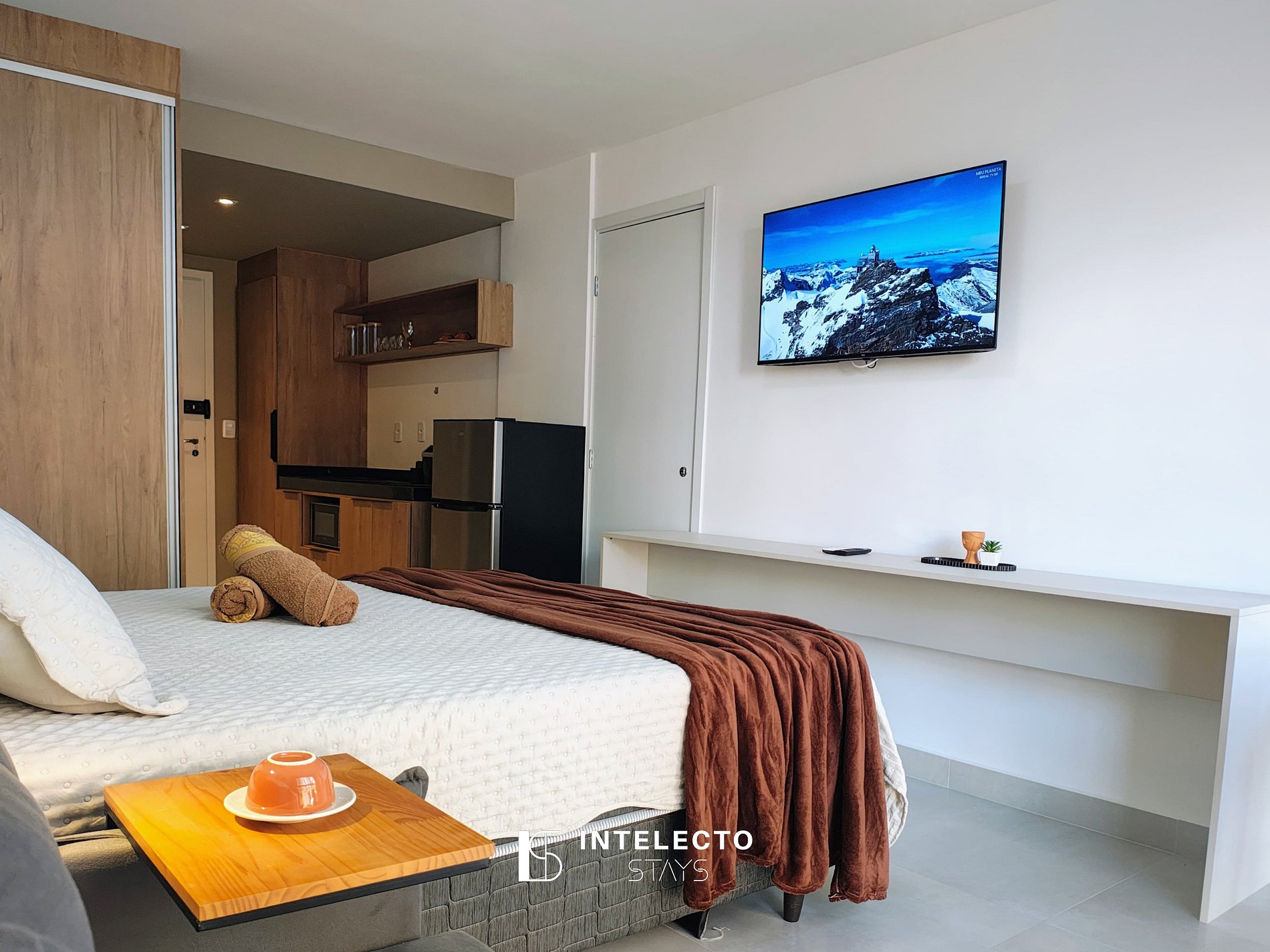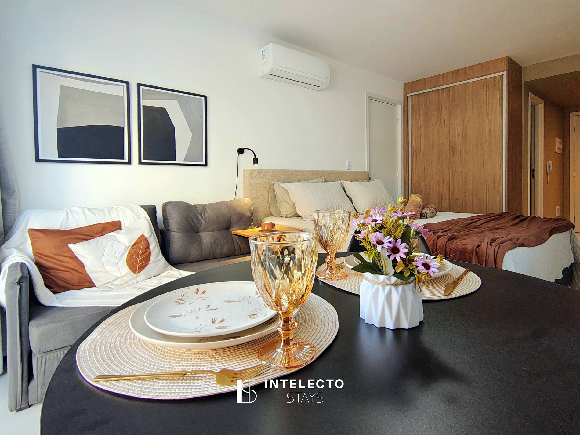 - Espaços integrados (quarto com cama queen e sala de estar com sofá-cama) com armários e guarda-roupas planejados
