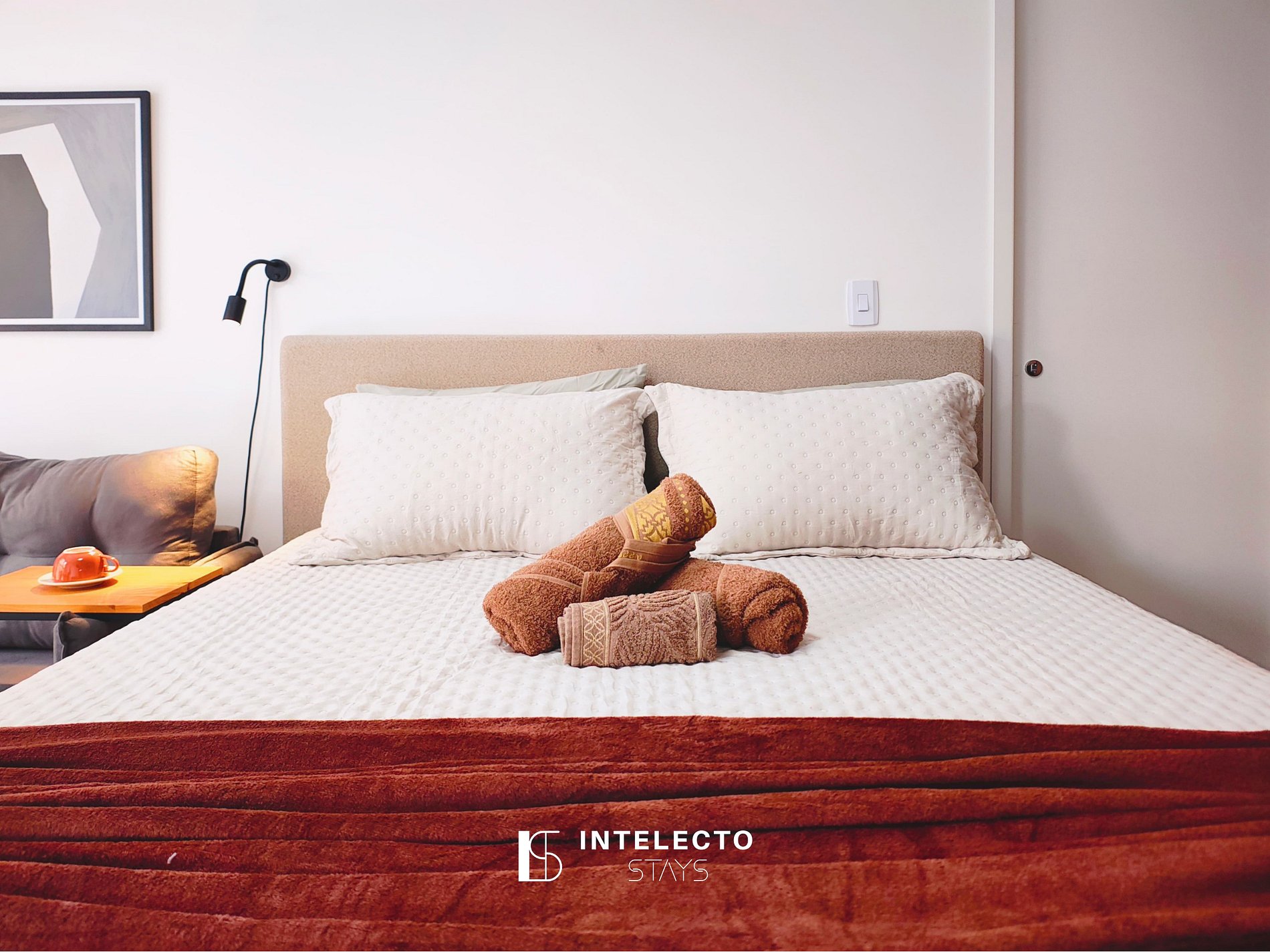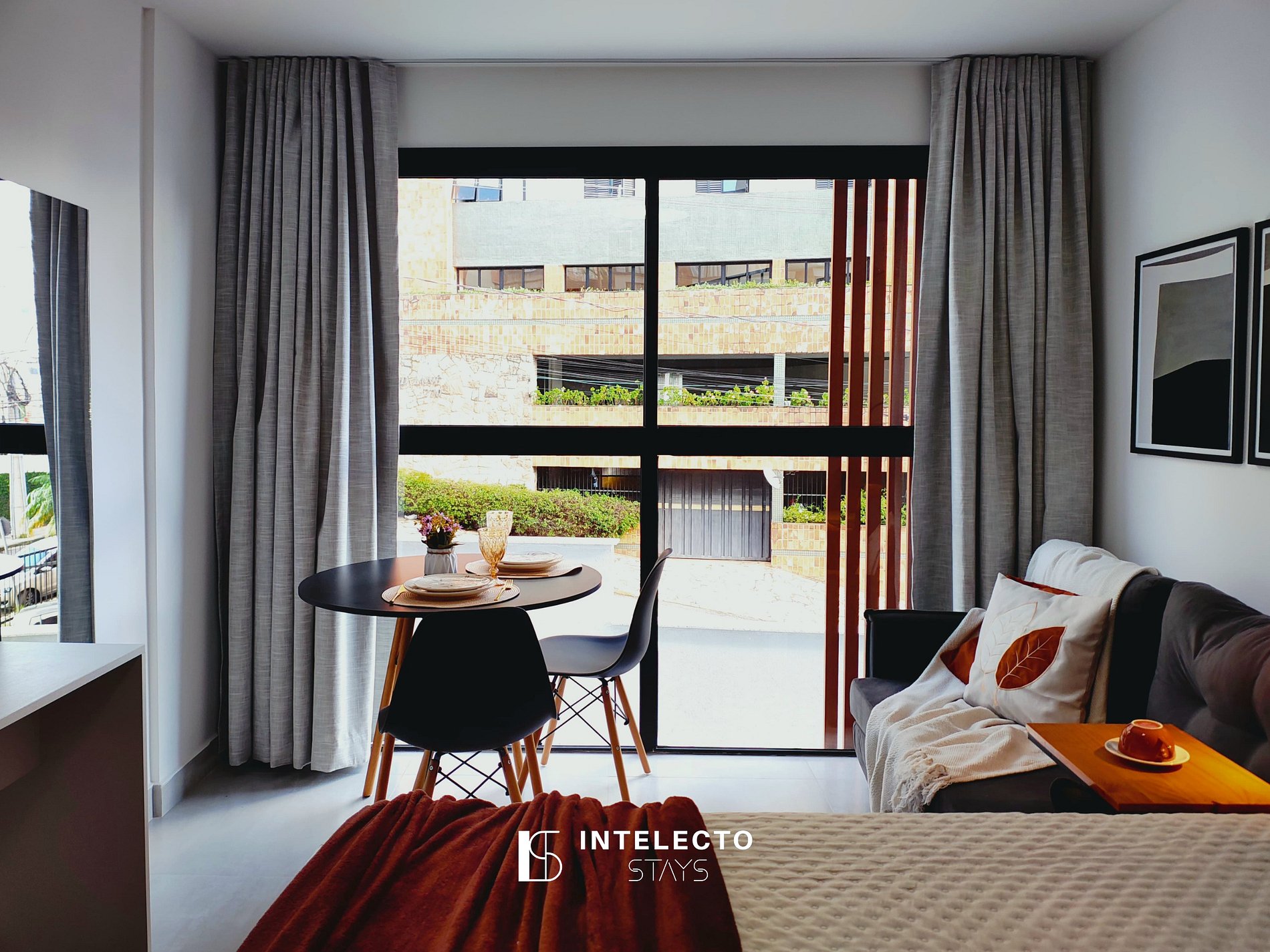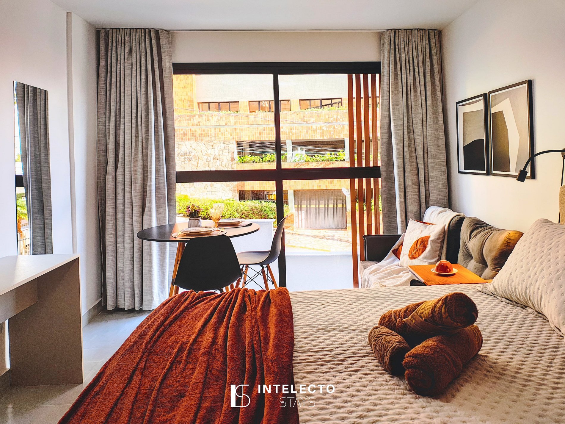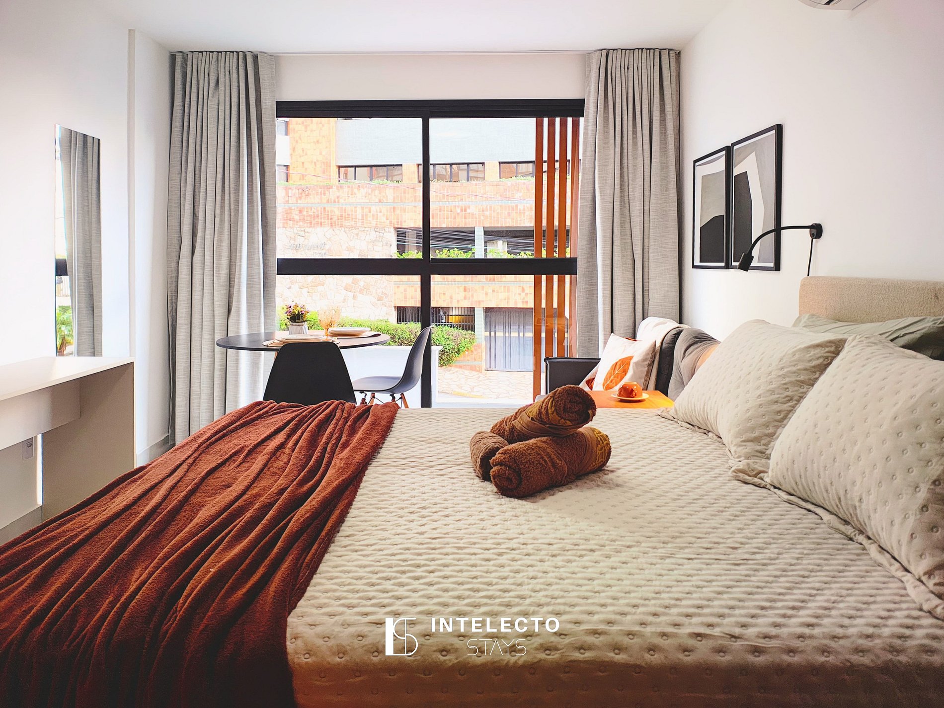- Espaços integrados (quarto com cama queen e sala de estar com sofá-cama) com armários e guarda-roupas planejados