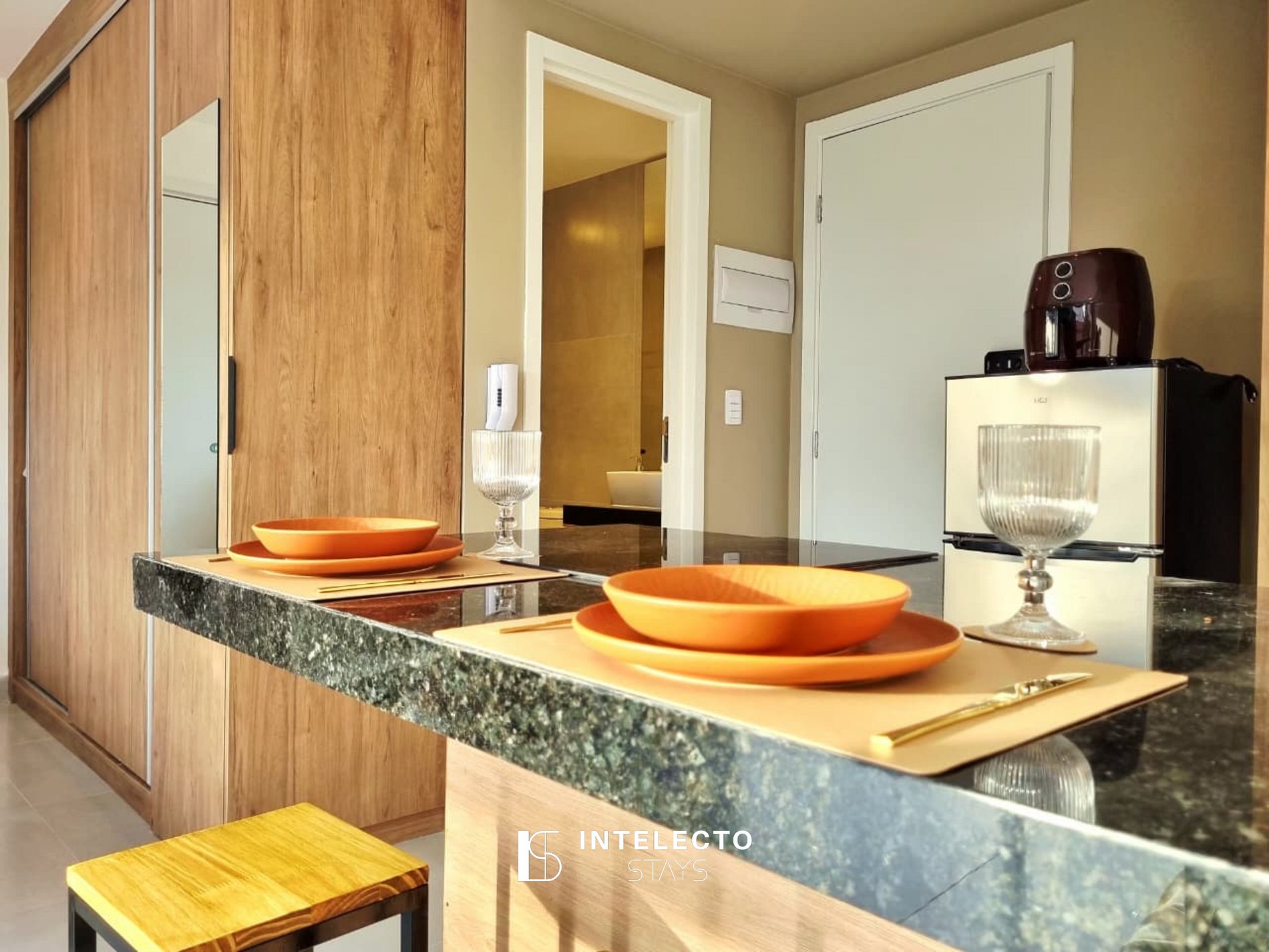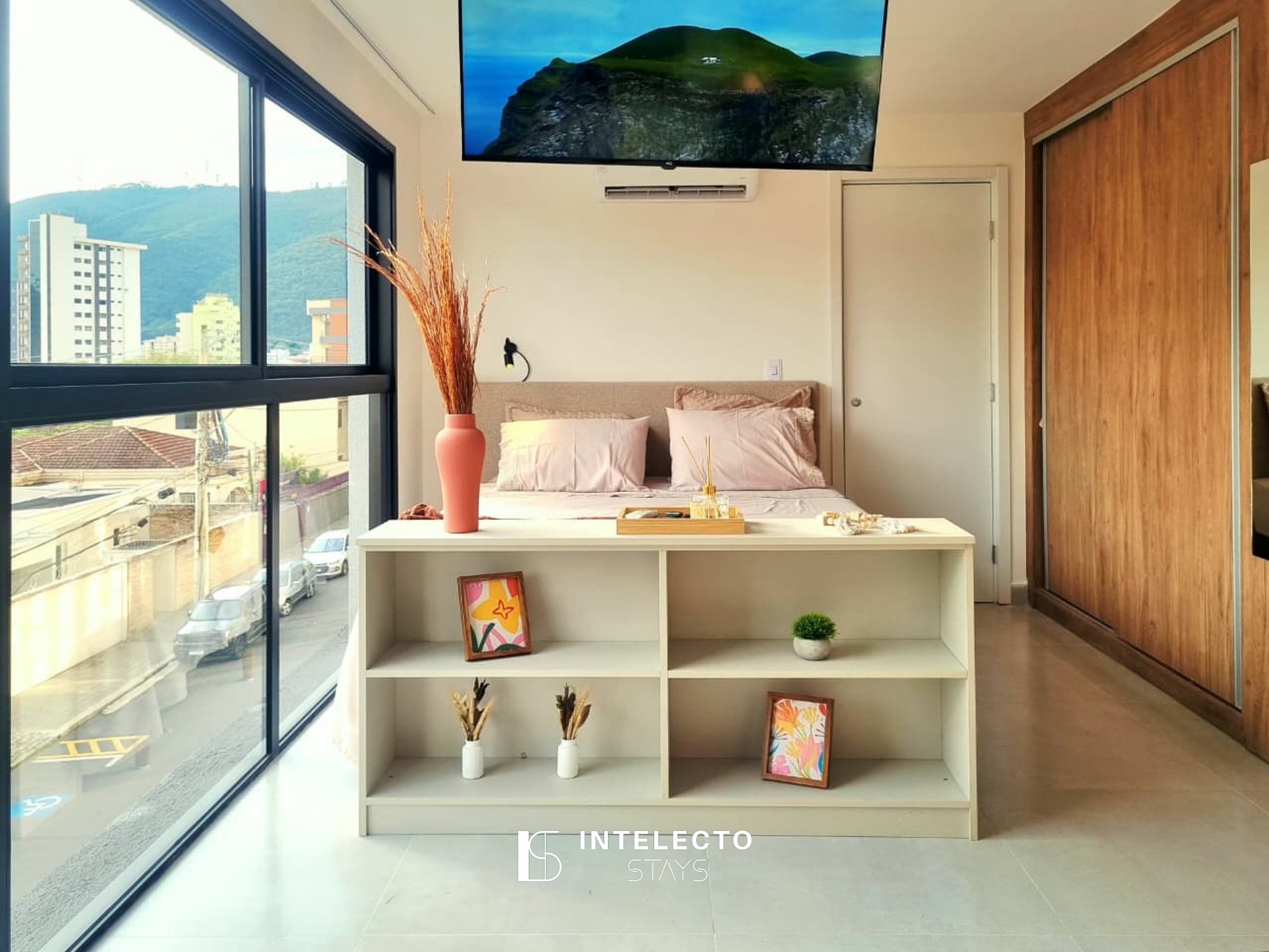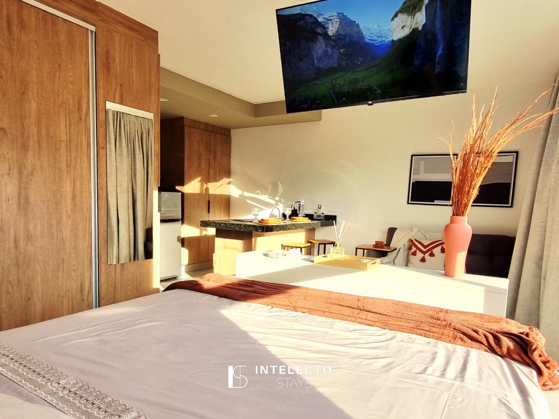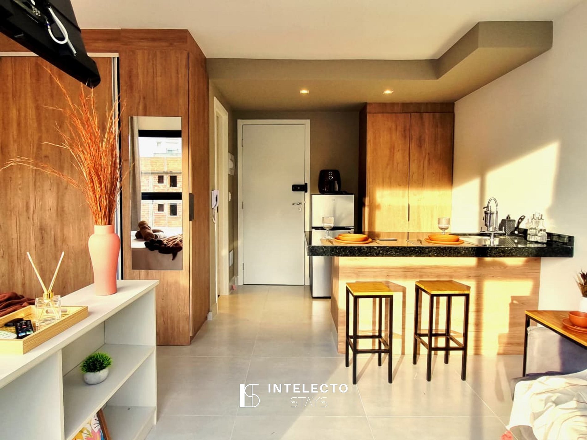 - Espaços integrados (quarto com cama queen e sala de estar com sofá-cama) com armários e guarda-roupas planejados