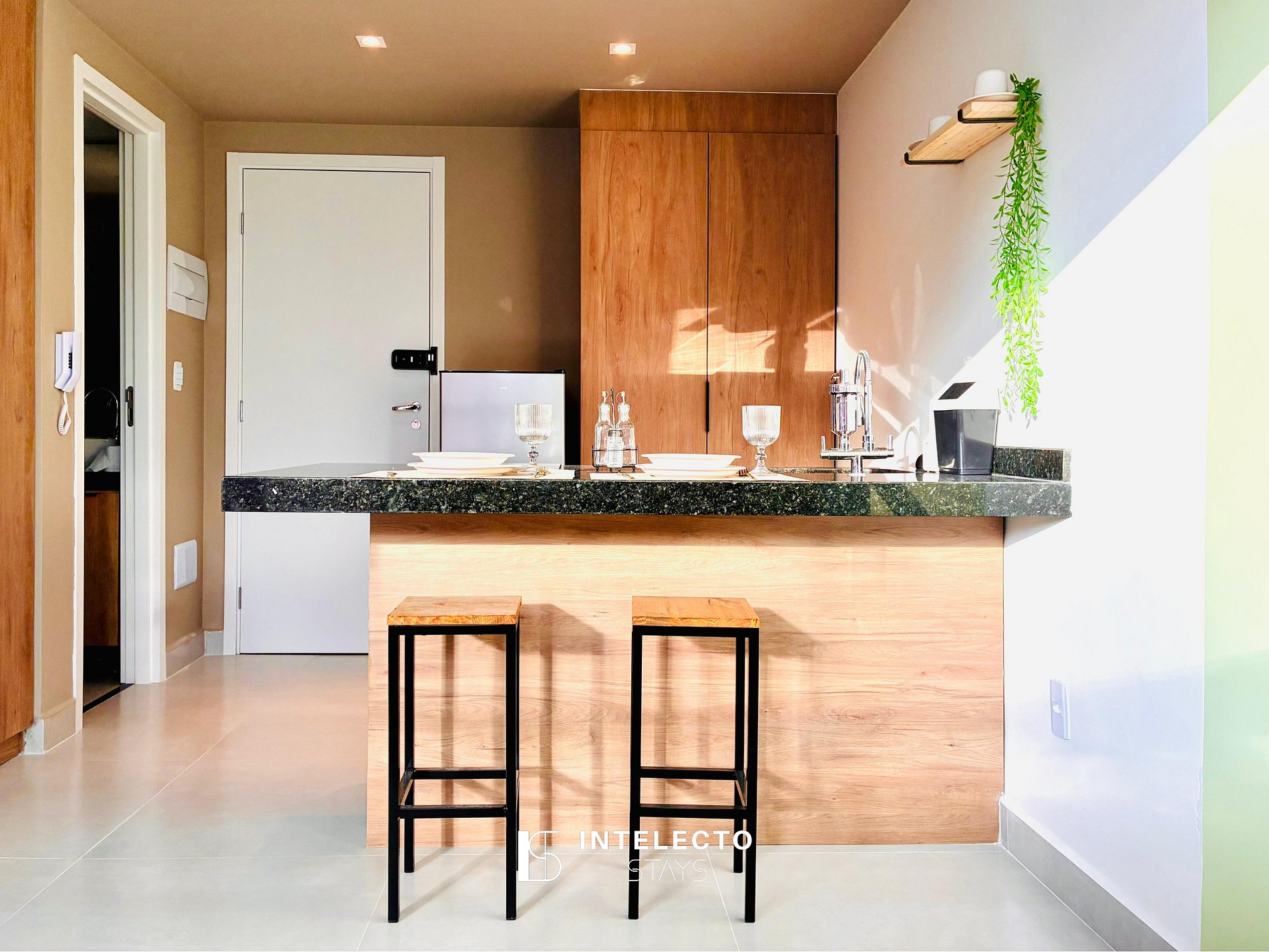 - Espaços integrados (quarto com cama queen e sala de estar com sofá-cama) com armários e guarda-roupas planejados