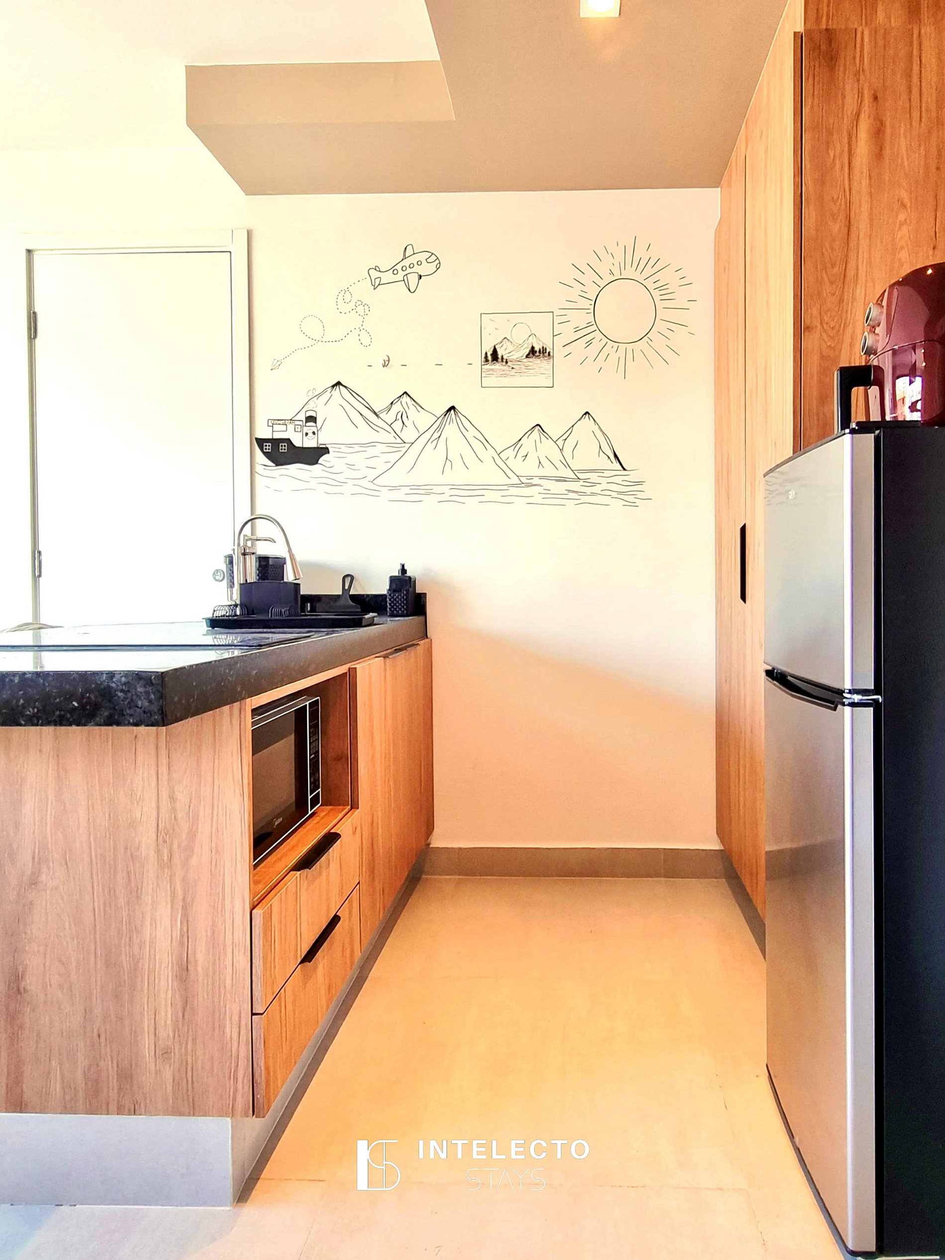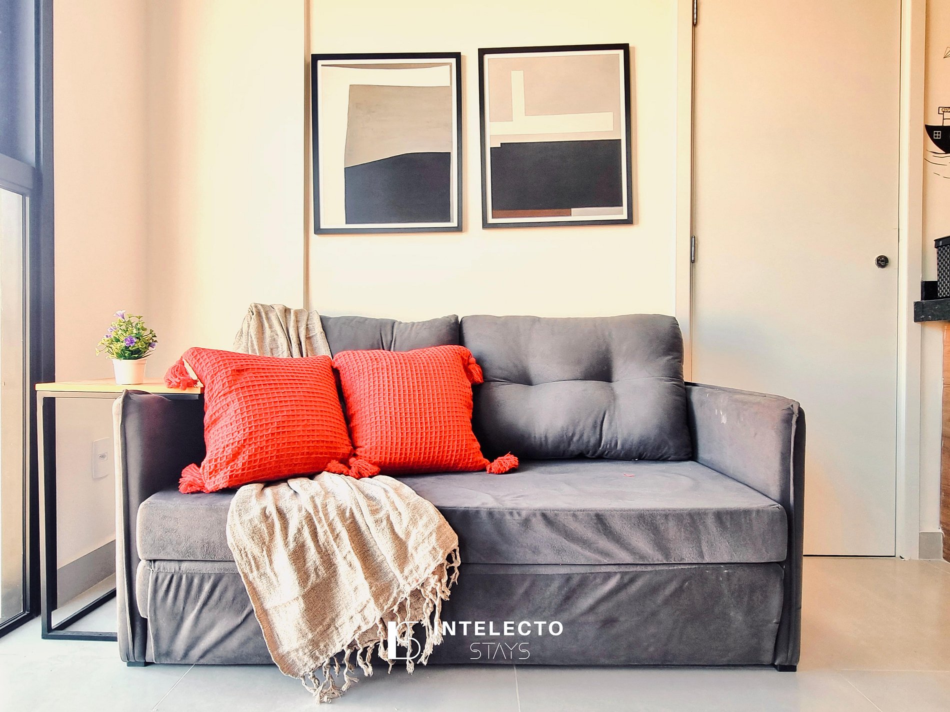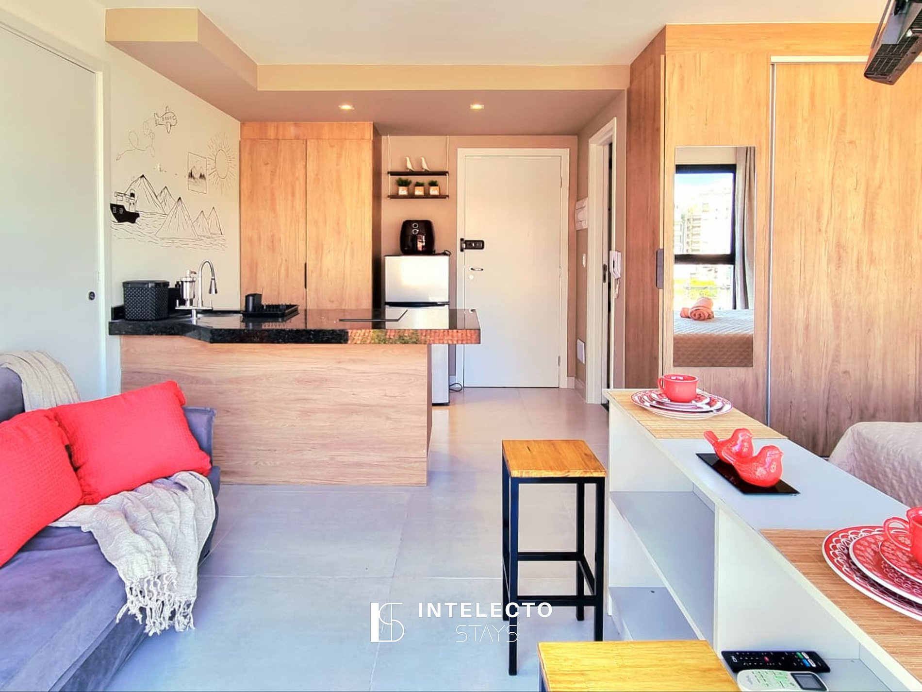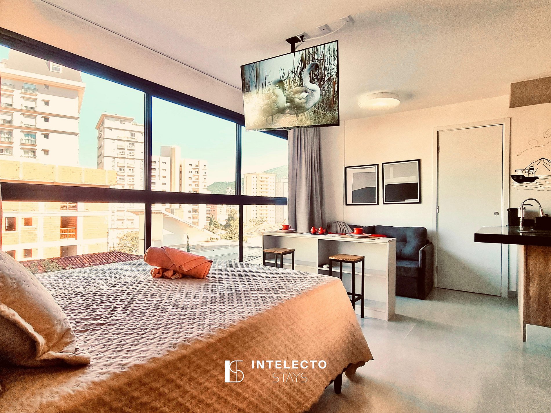 - Espaços integrados (quarto com cama queen e sala de estar com sofá-cama) com armários e guarda-roupas planejados