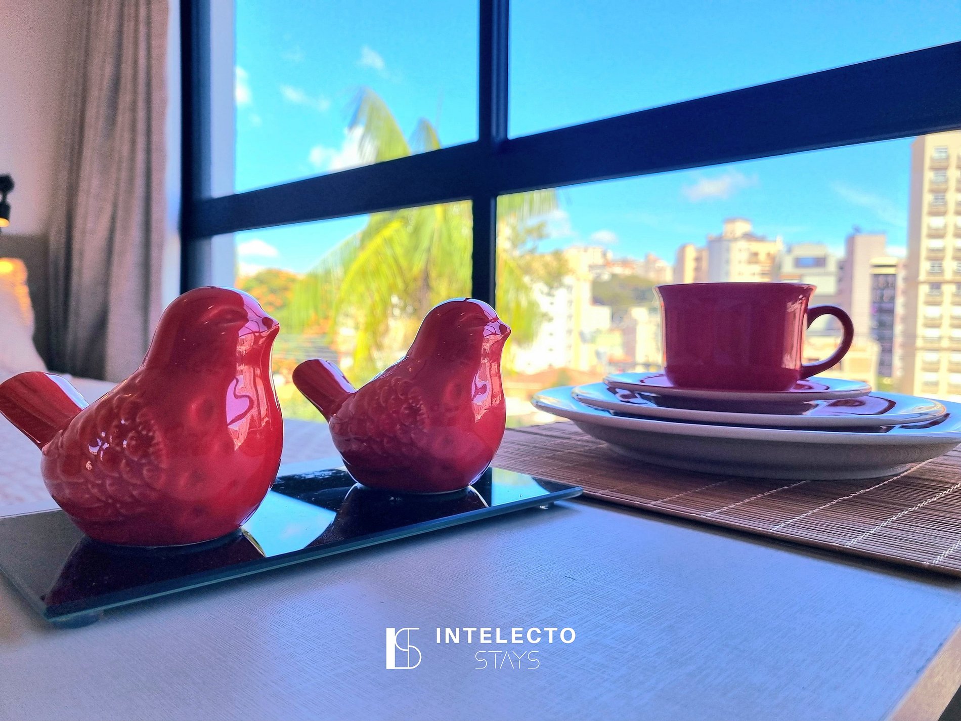 Situado na área central de Poços, perto de tudo. É muito tranquilo, seguro e organizado, com portaria 24 horas, self check-in com reconhecimento facial e uma vista linda da cidade.