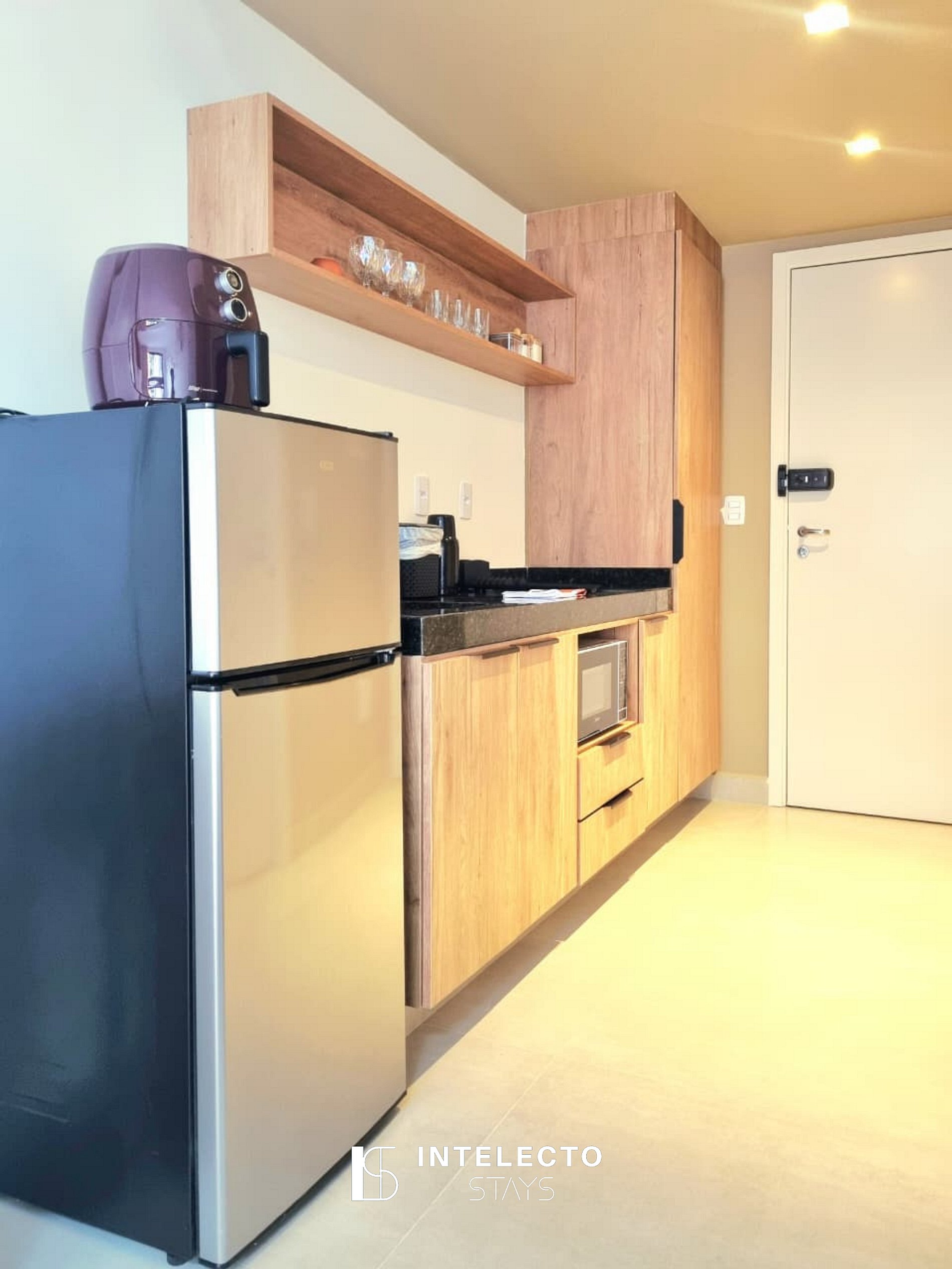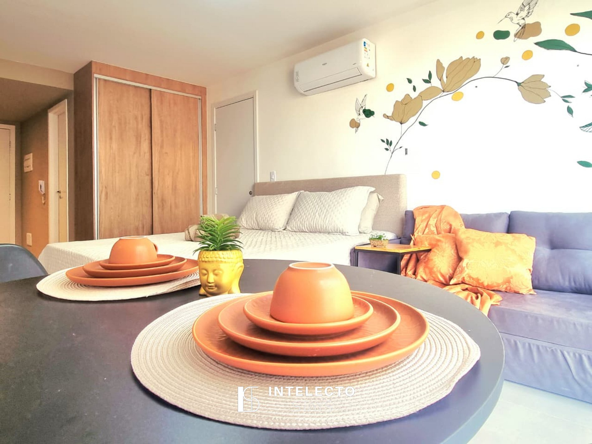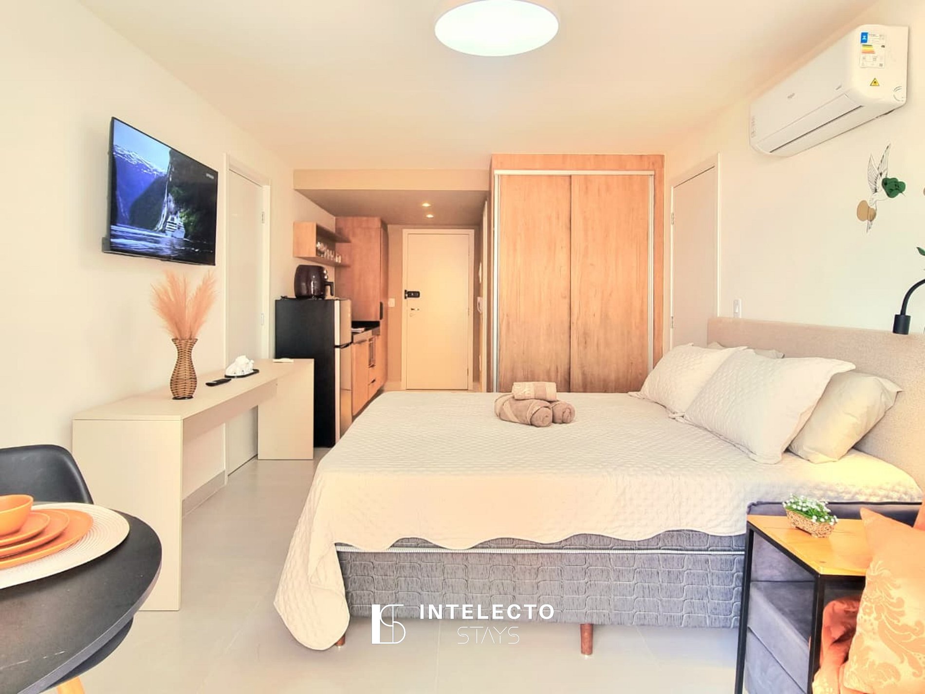 - Espaços integrados (quarto com cama queen e sala de estar com sofá-cama) com armários e guarda-roupas planejados