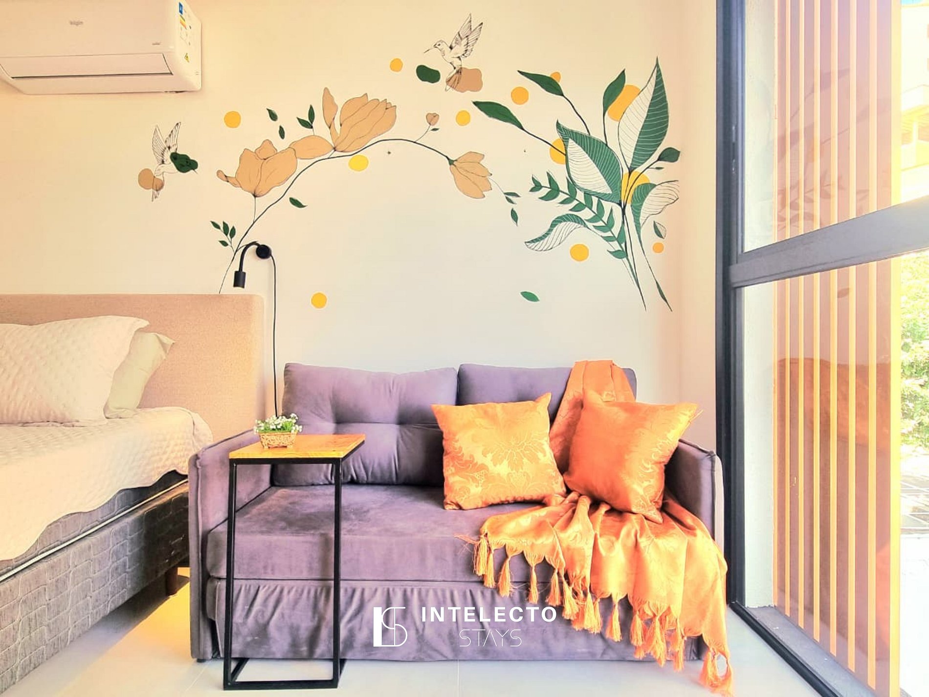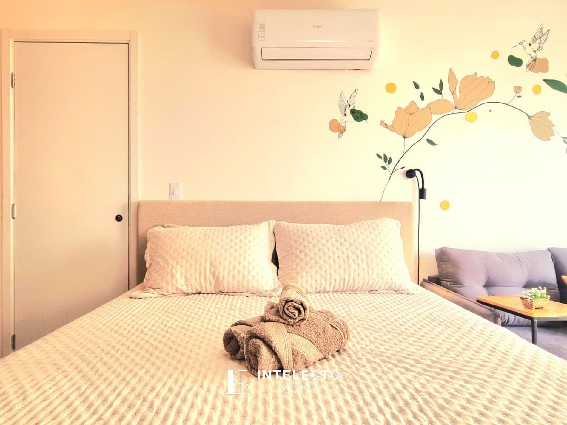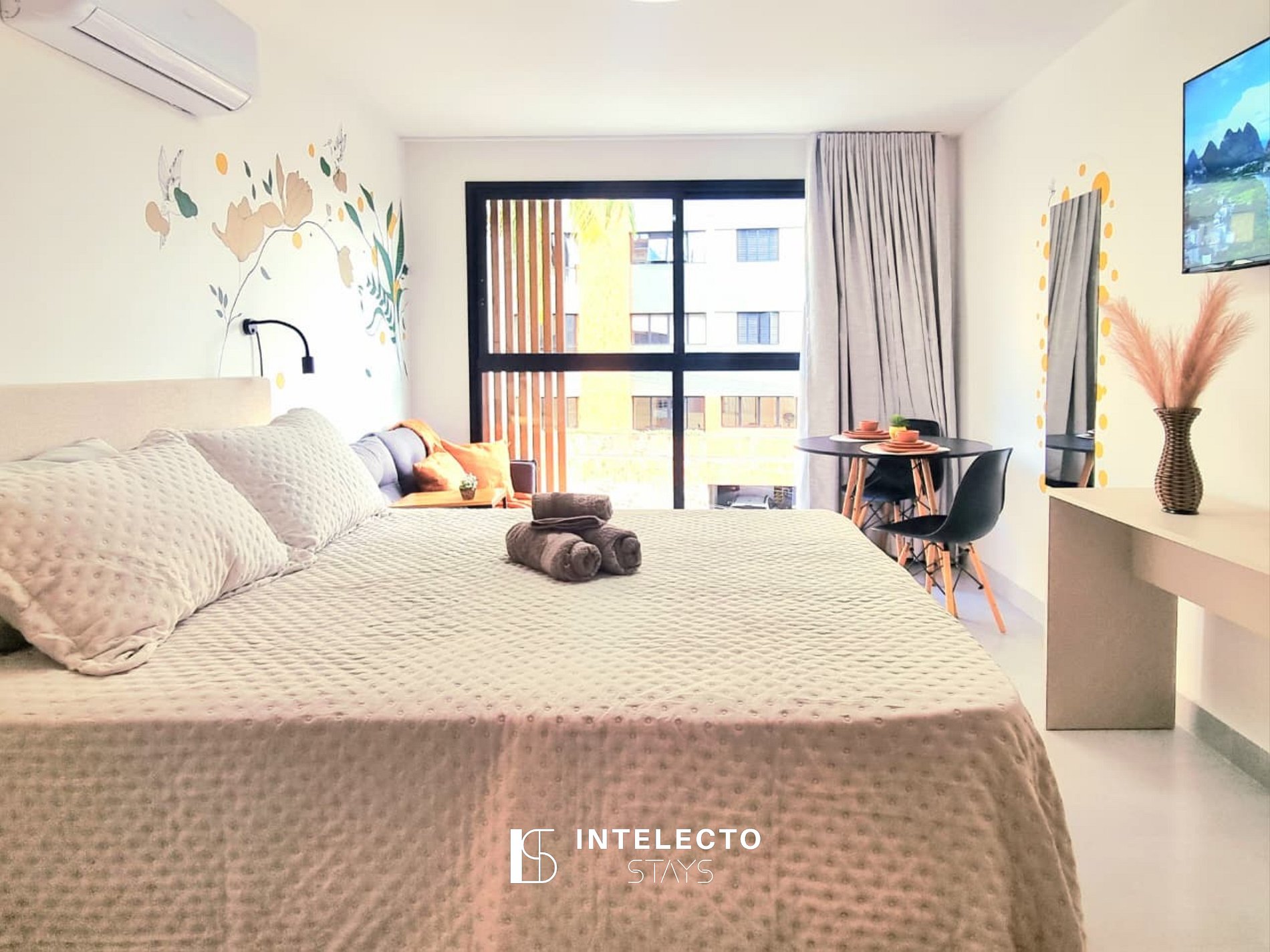 - Espaços integrados (quarto com cama queen e sala de estar com sofá-cama) com armários e guarda-roupas planejados