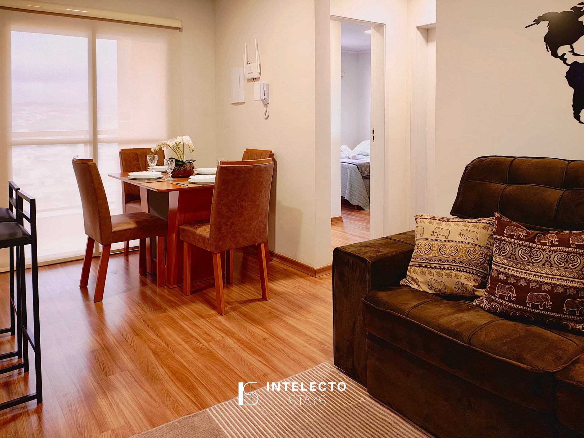 - Sala de dois ambientes com uma vista linda, mesa de 4 lugares, sofá-cama e Smart TV com streamings