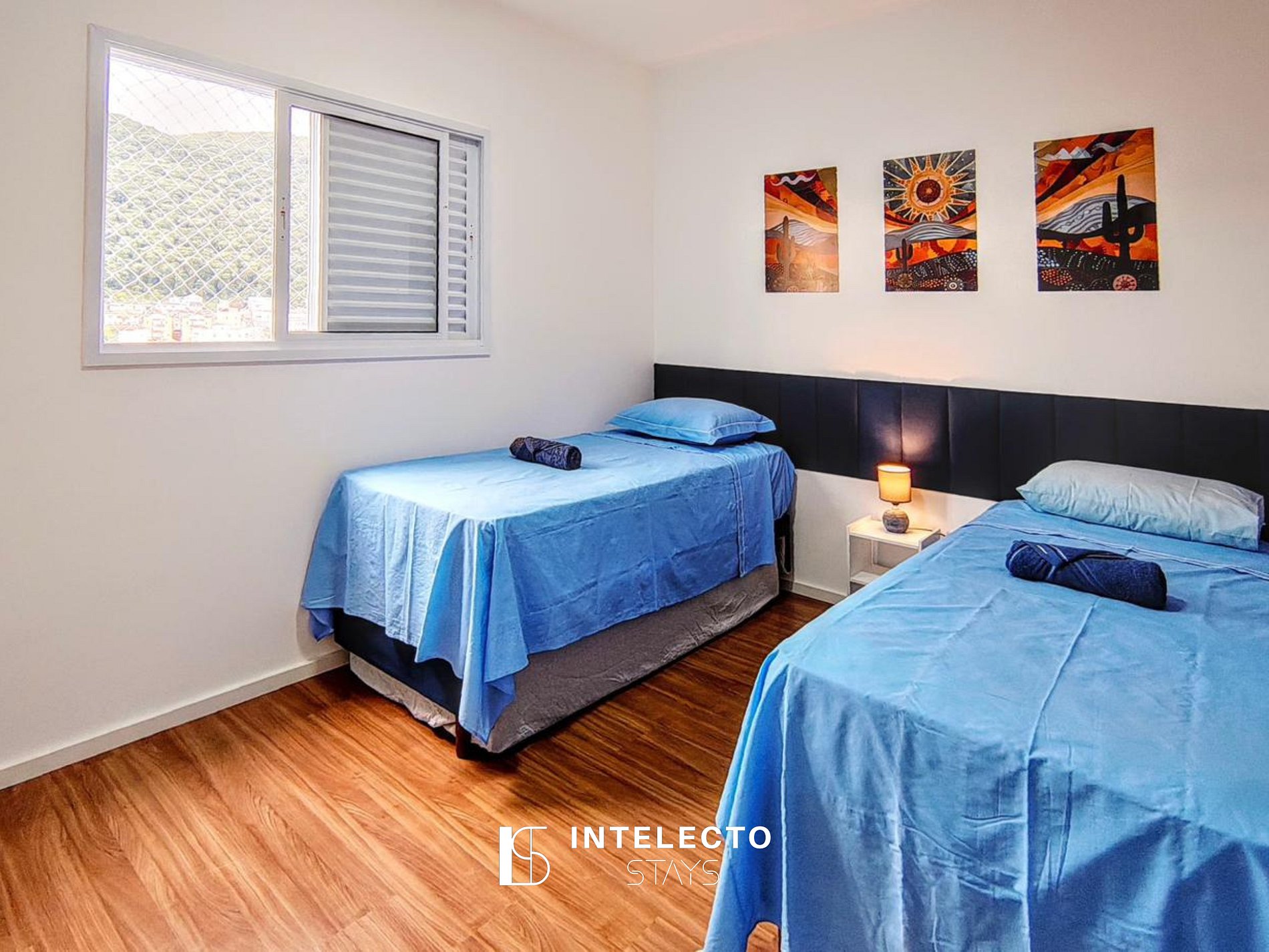 - Três dormitórios (uma suíte com cama de casal, quarto com uma cama de solteiro e outra cama de solteiro com auxiliar e outro com duas camas de solteiro)