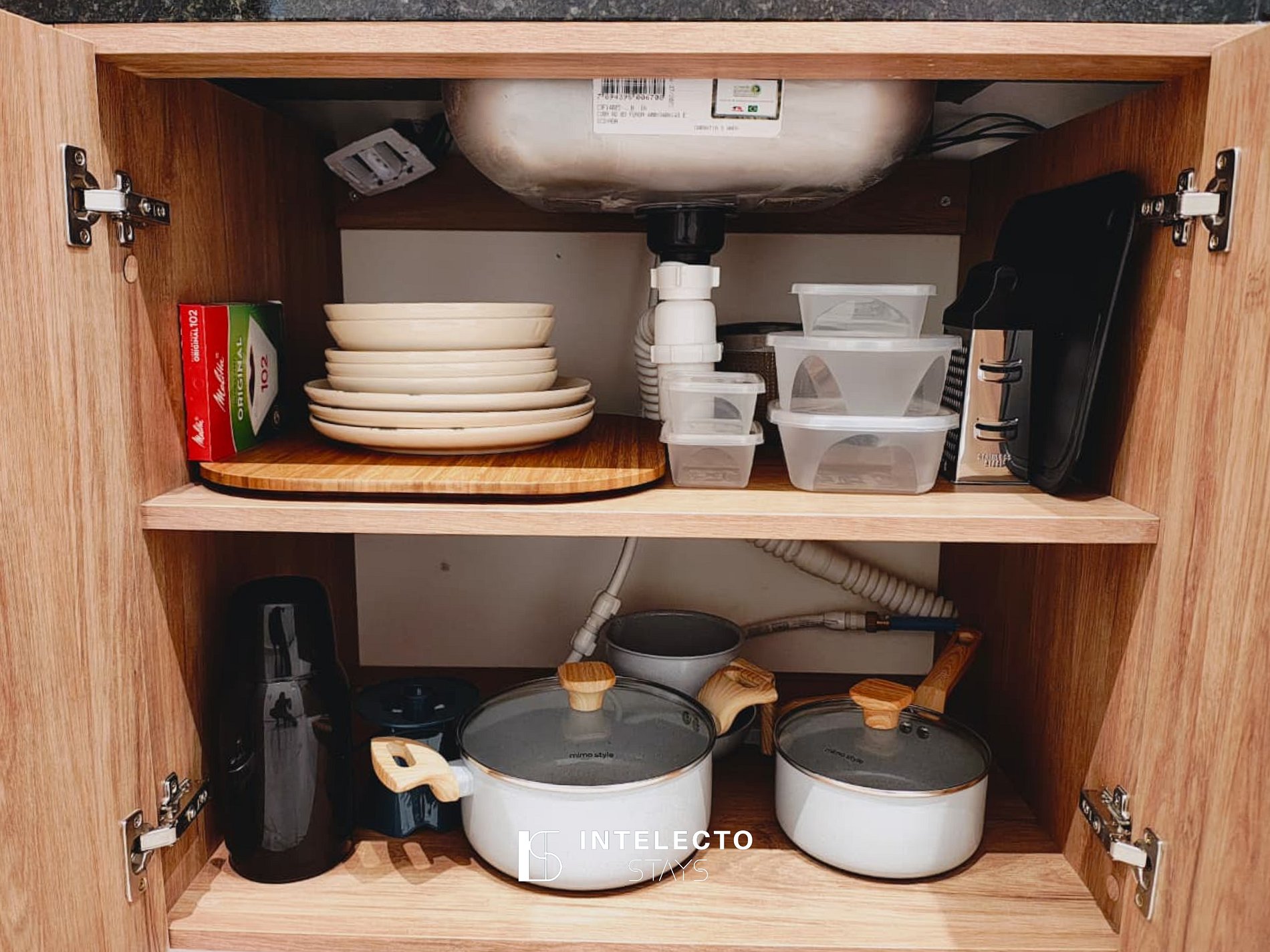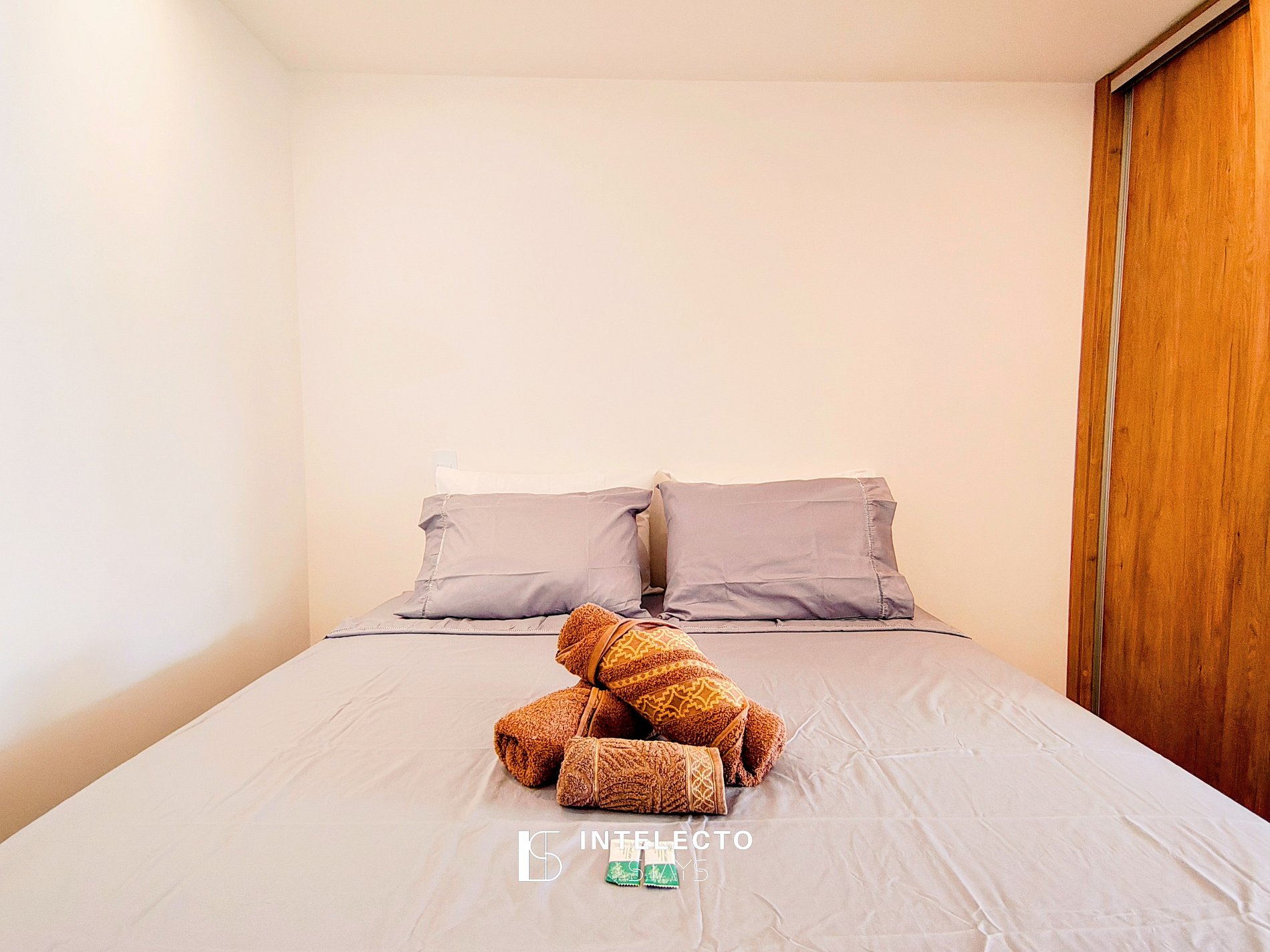 - Espaços integrados (quarto com cama queen e sala de estar com sofá) com armários e guarda-roupas planejados