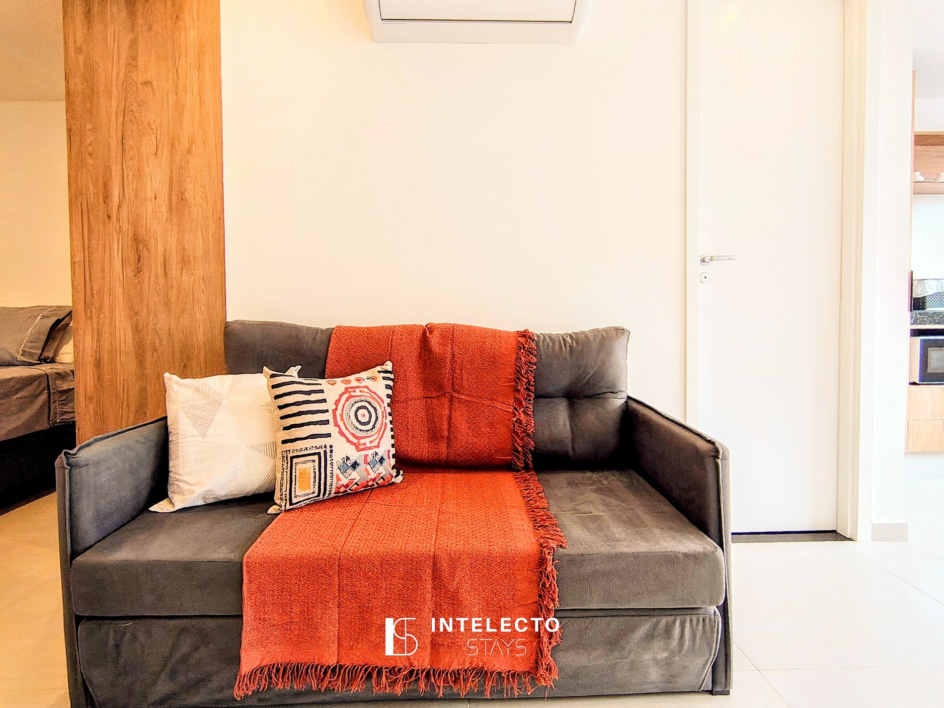 - Espaços integrados (quarto com cama queen e sala de estar com sofá) com armários e guarda-roupas planejados