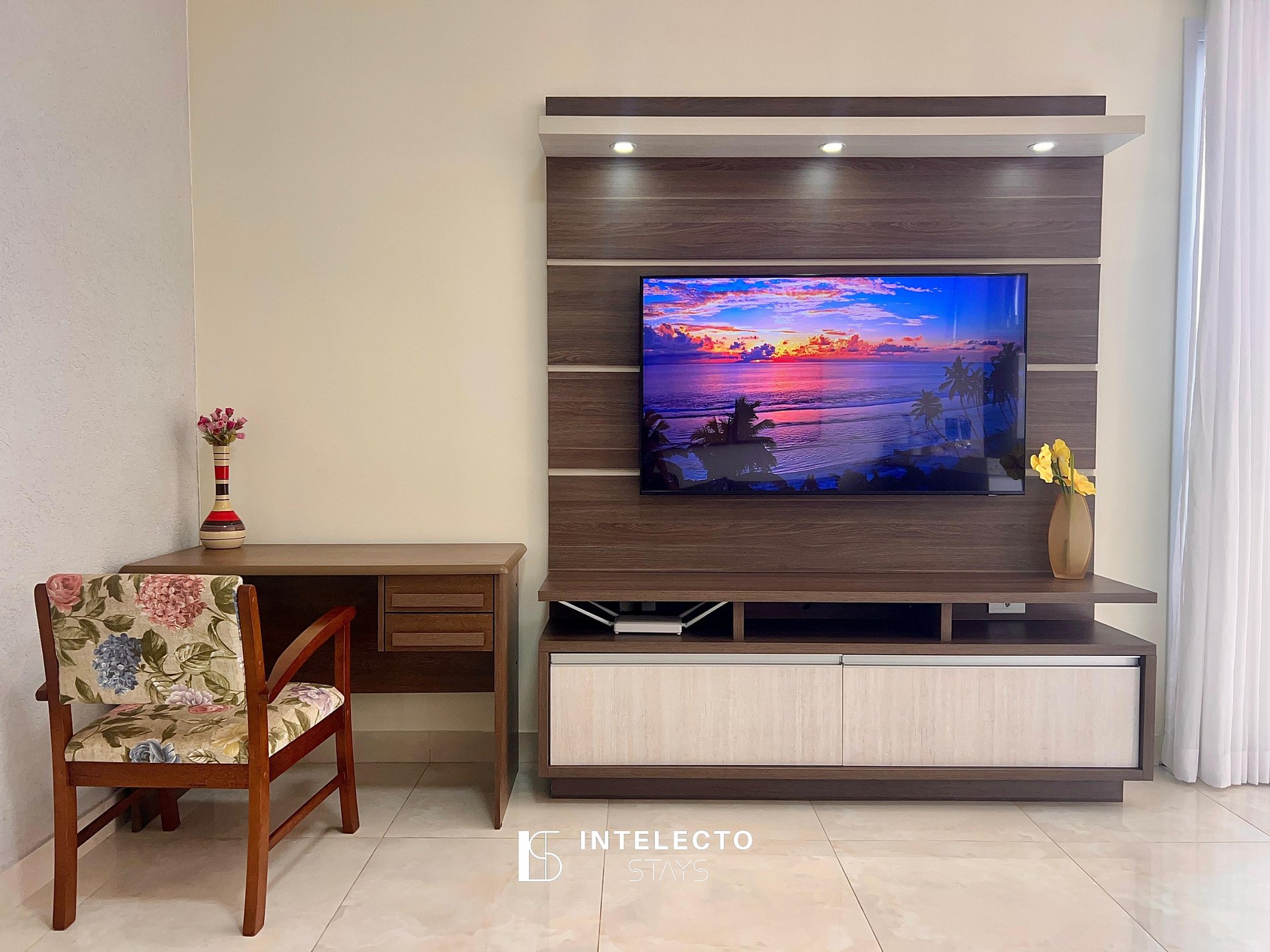- Sala de dois ambientes com mesa de 4 lugares, Smart TV, sofá e uma mesa para trabalho