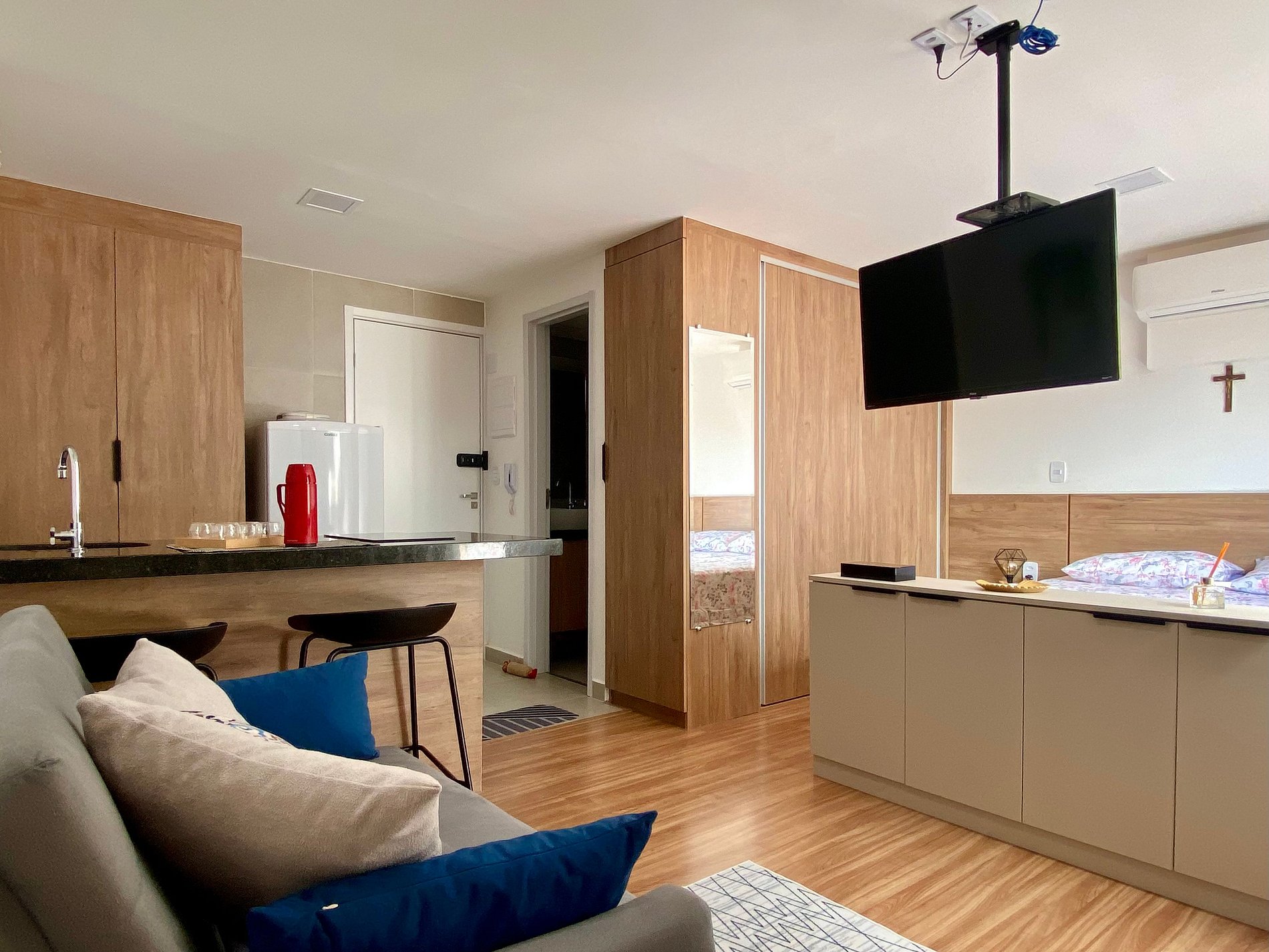 - Espaços integrados (quarto com cama queen e sala de estar com sofá-cama) com armários e guarda-roupas planejados