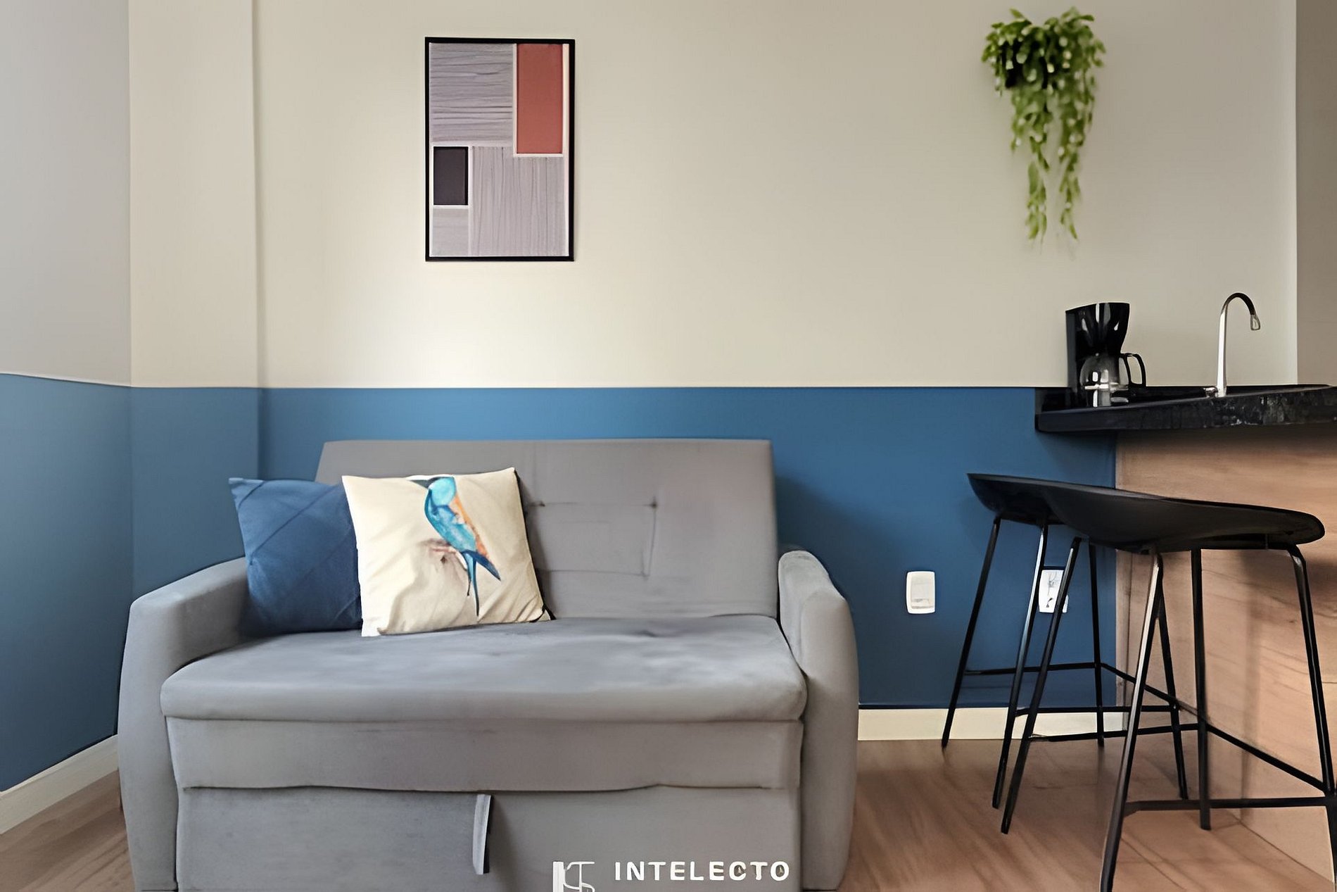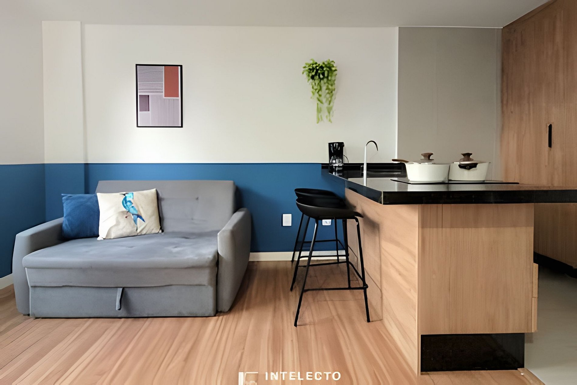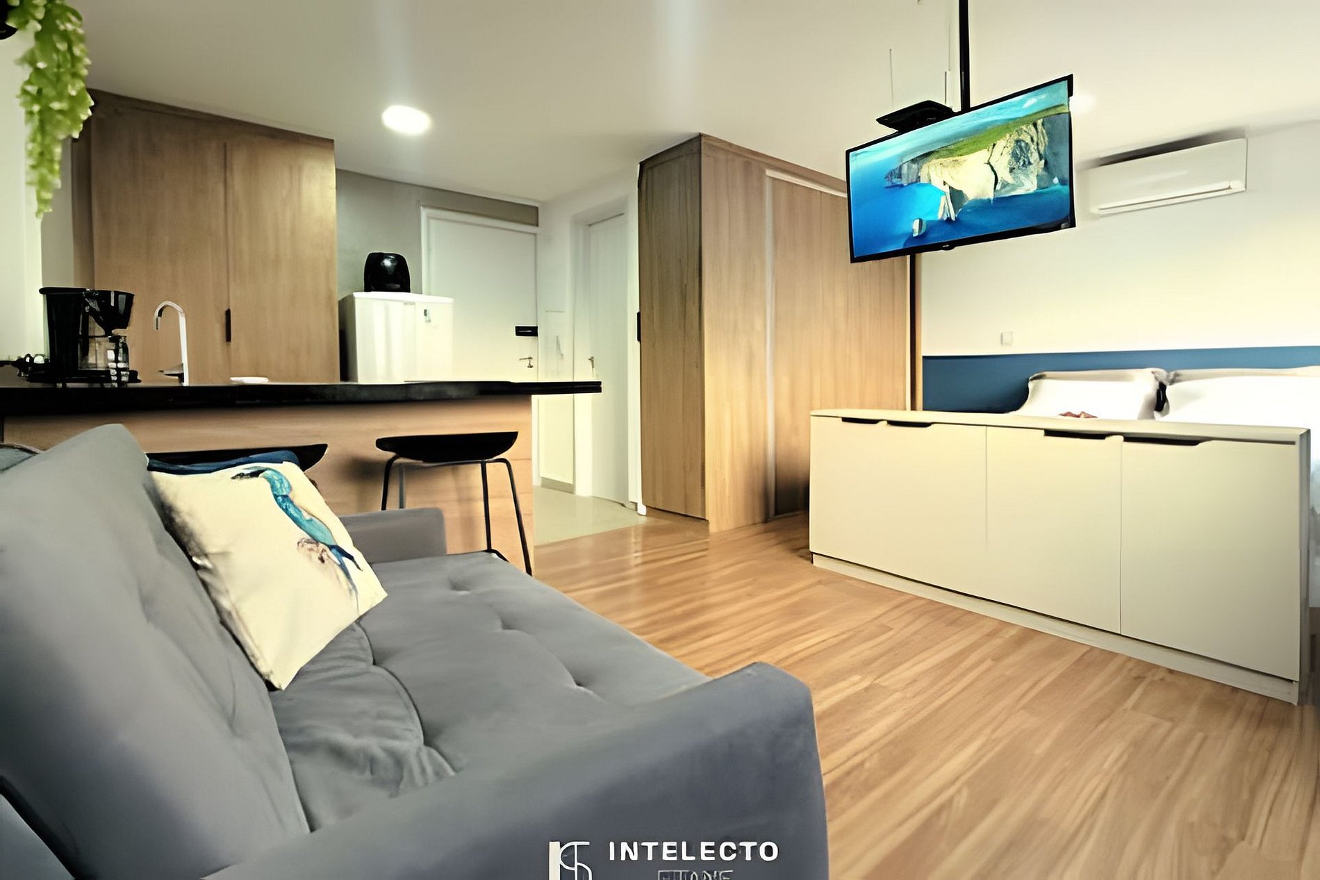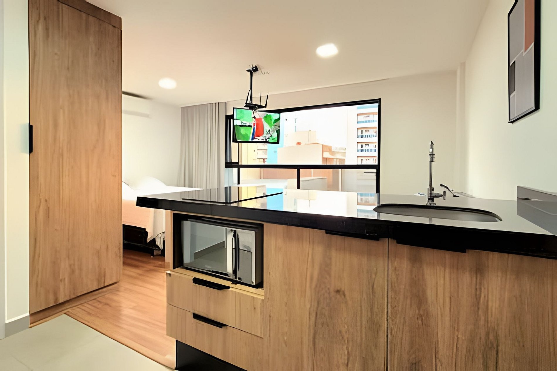 - Espaços integrados (quarto com cama queen e sala de estar com sofá-cama) com armários e guarda-roupas planejados