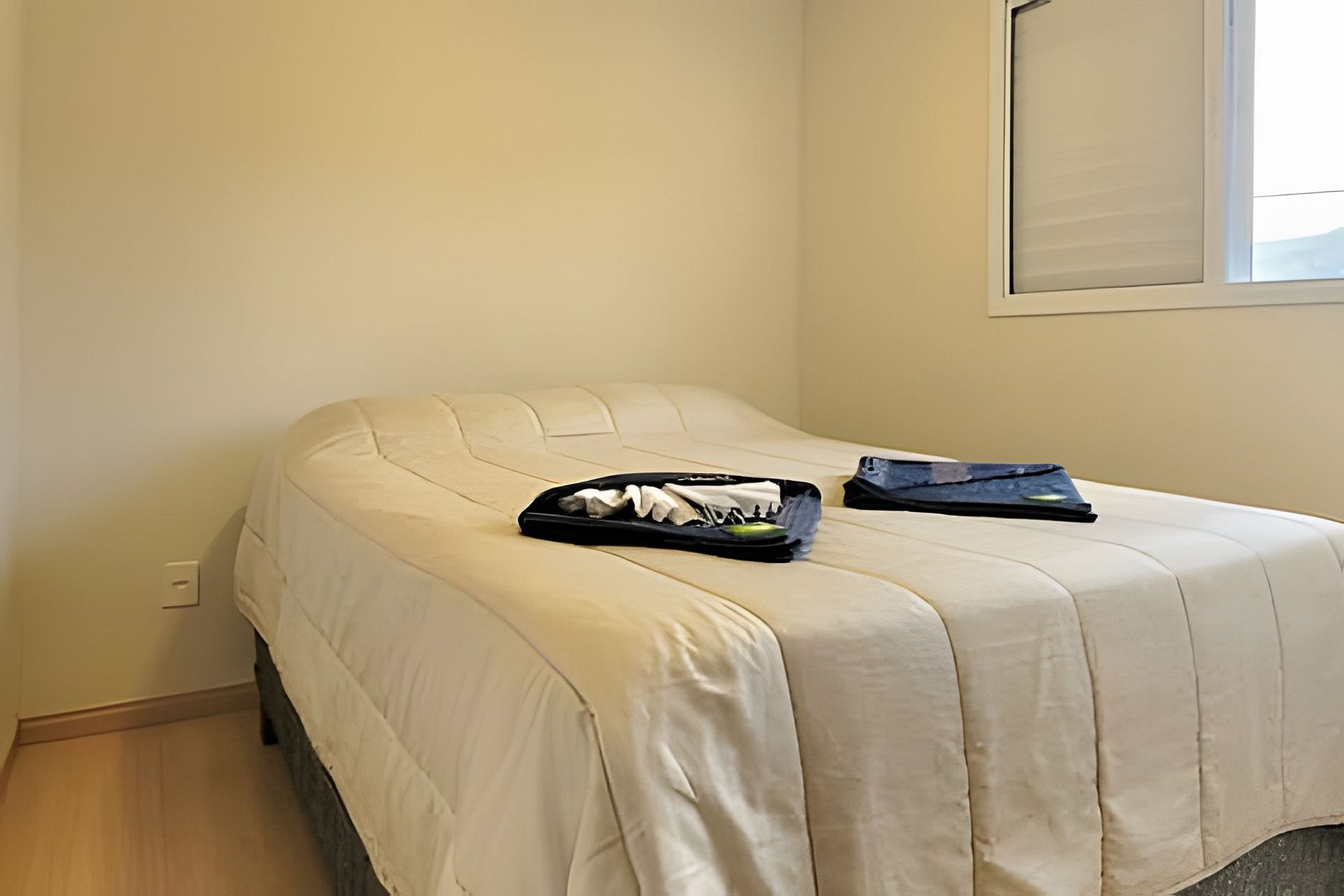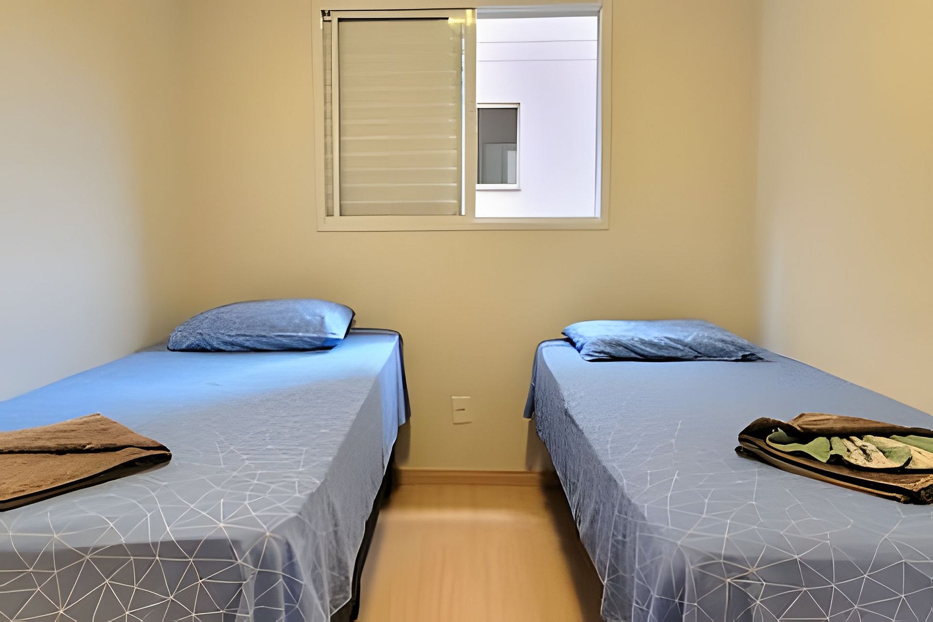 - Dois dormitórios (um quarto com cama de casal e outro com duas camas de solteiro)