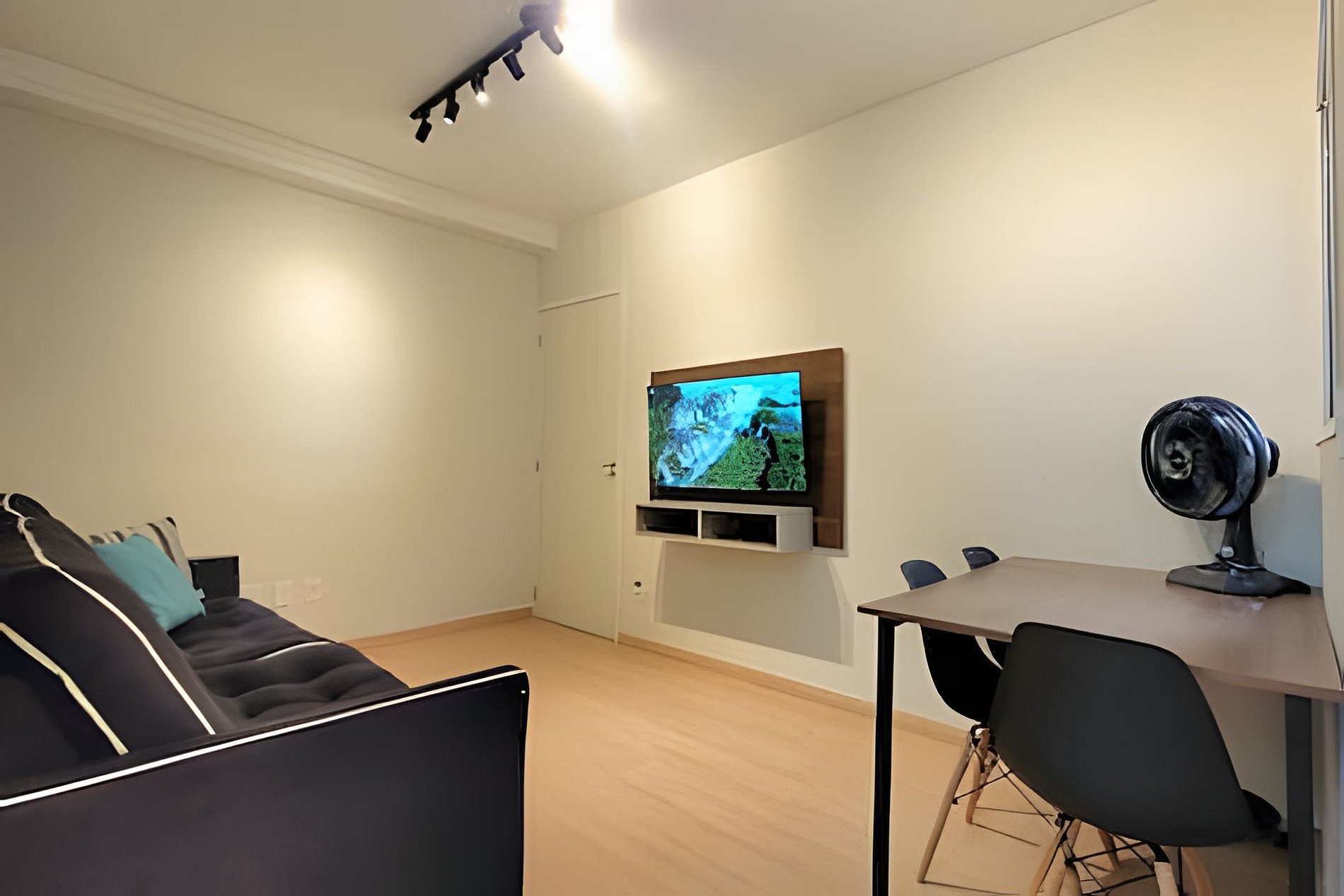 - Sala de dois ambientes aconchegante com mesa de 4 lugares, sofá-cama confortável e SmarTV com streamings.