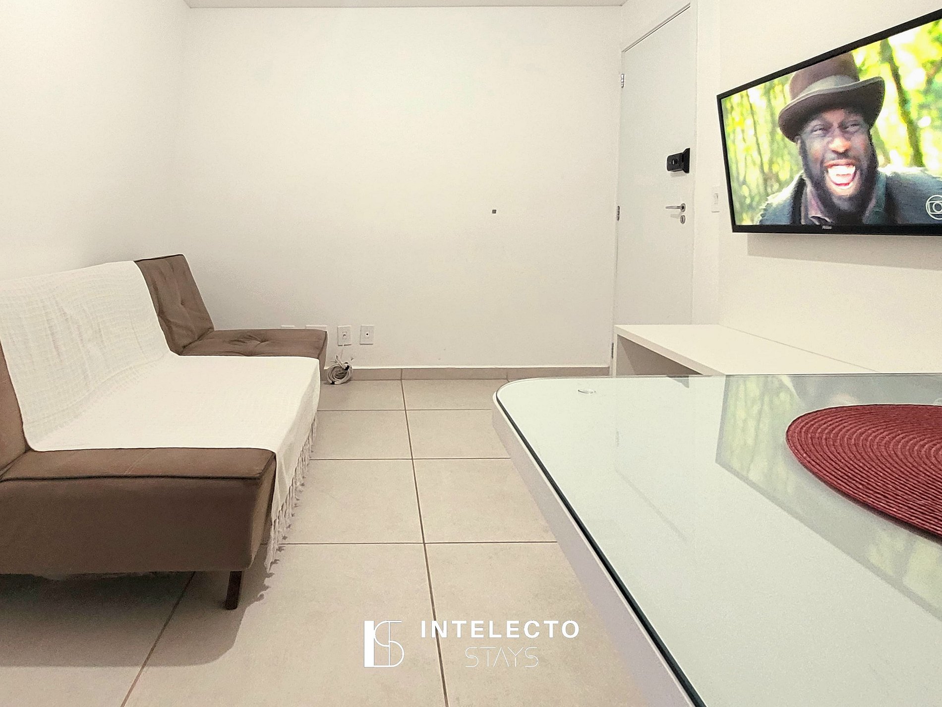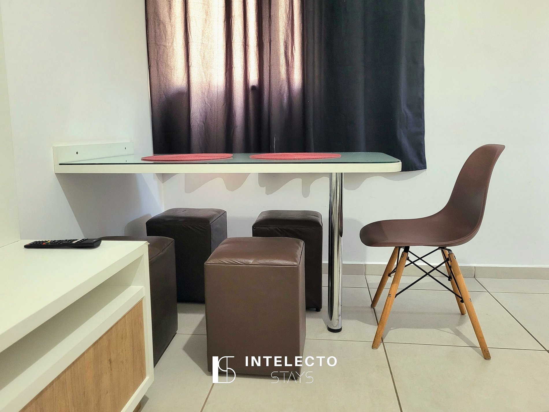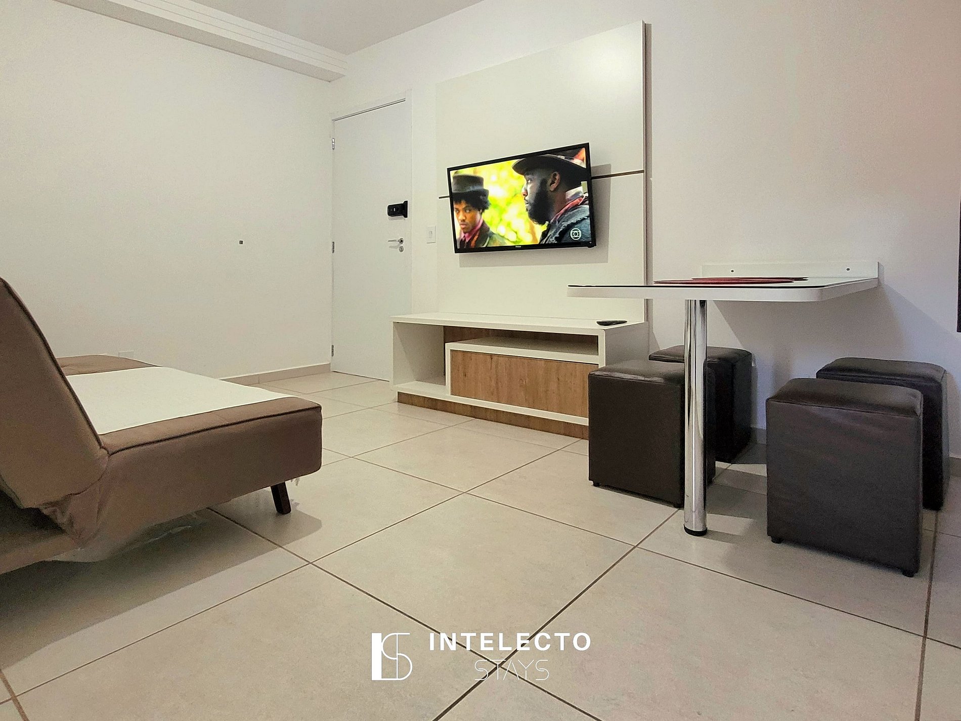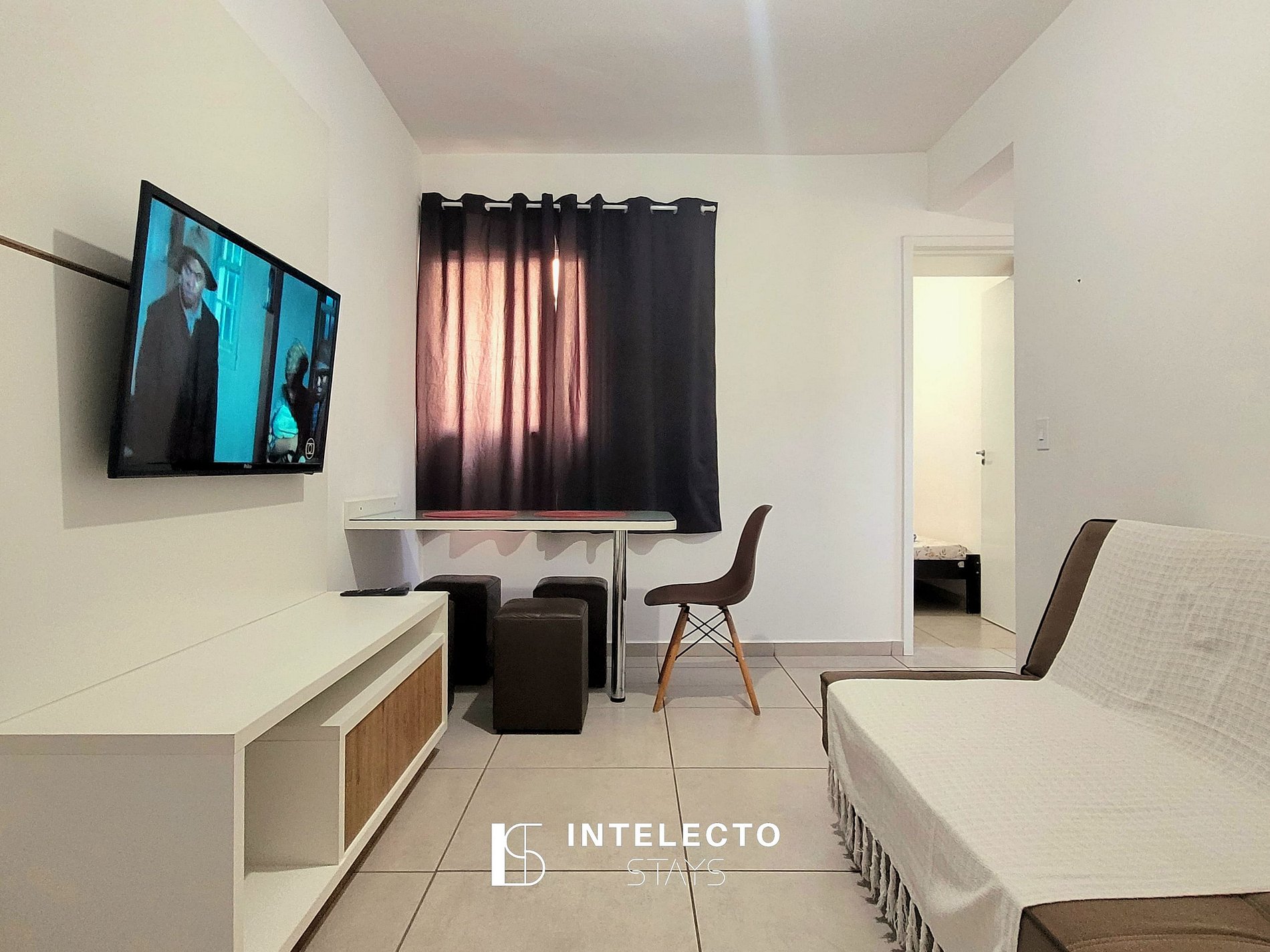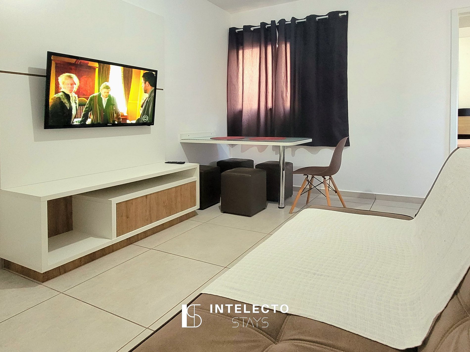 - sala de dois ambientes com mesa de 4 lugares, sofá-cama e Smart TV