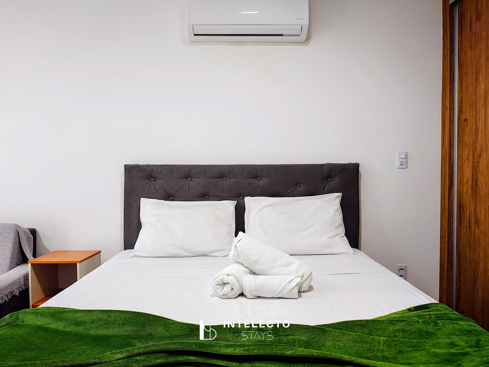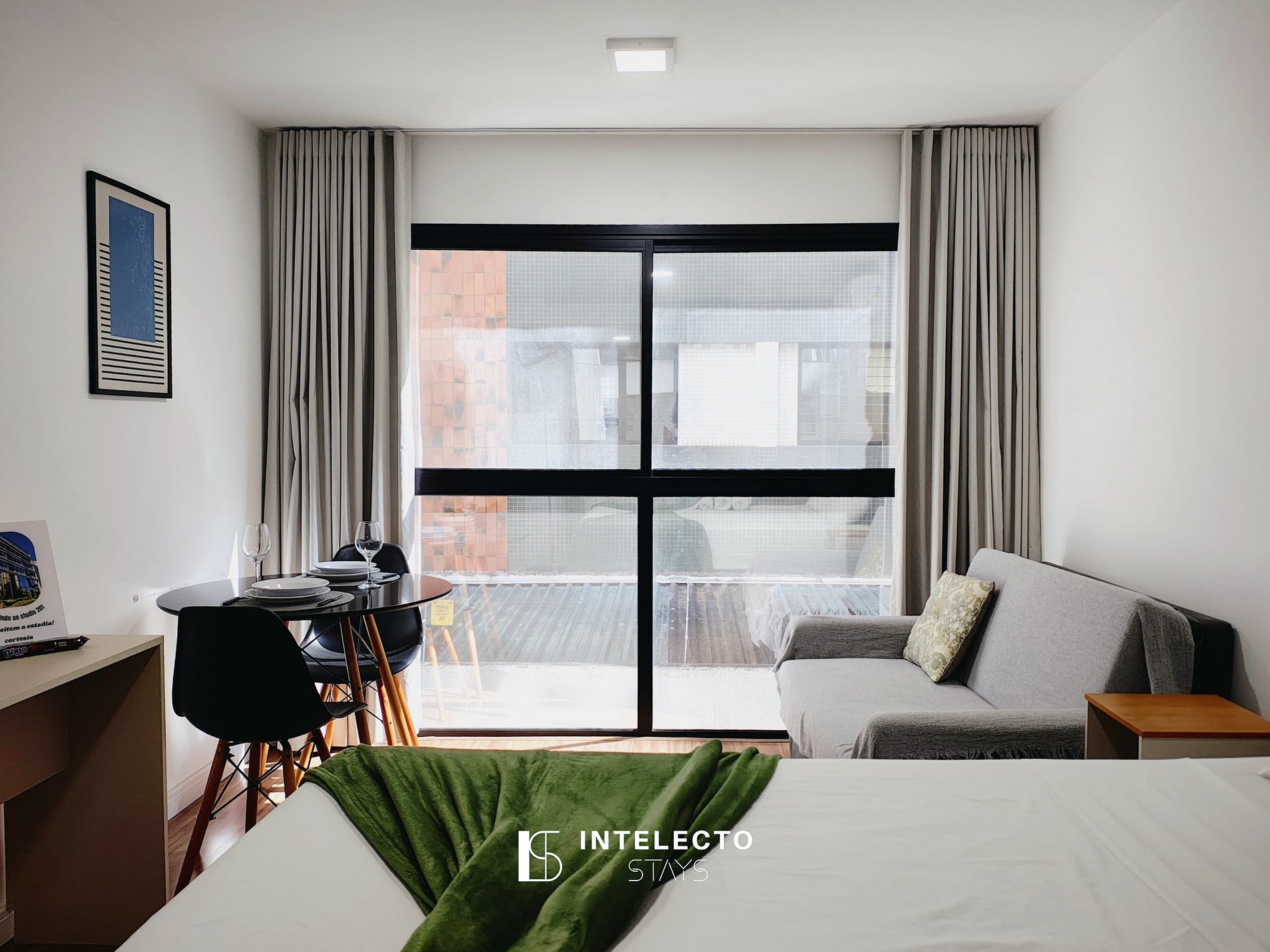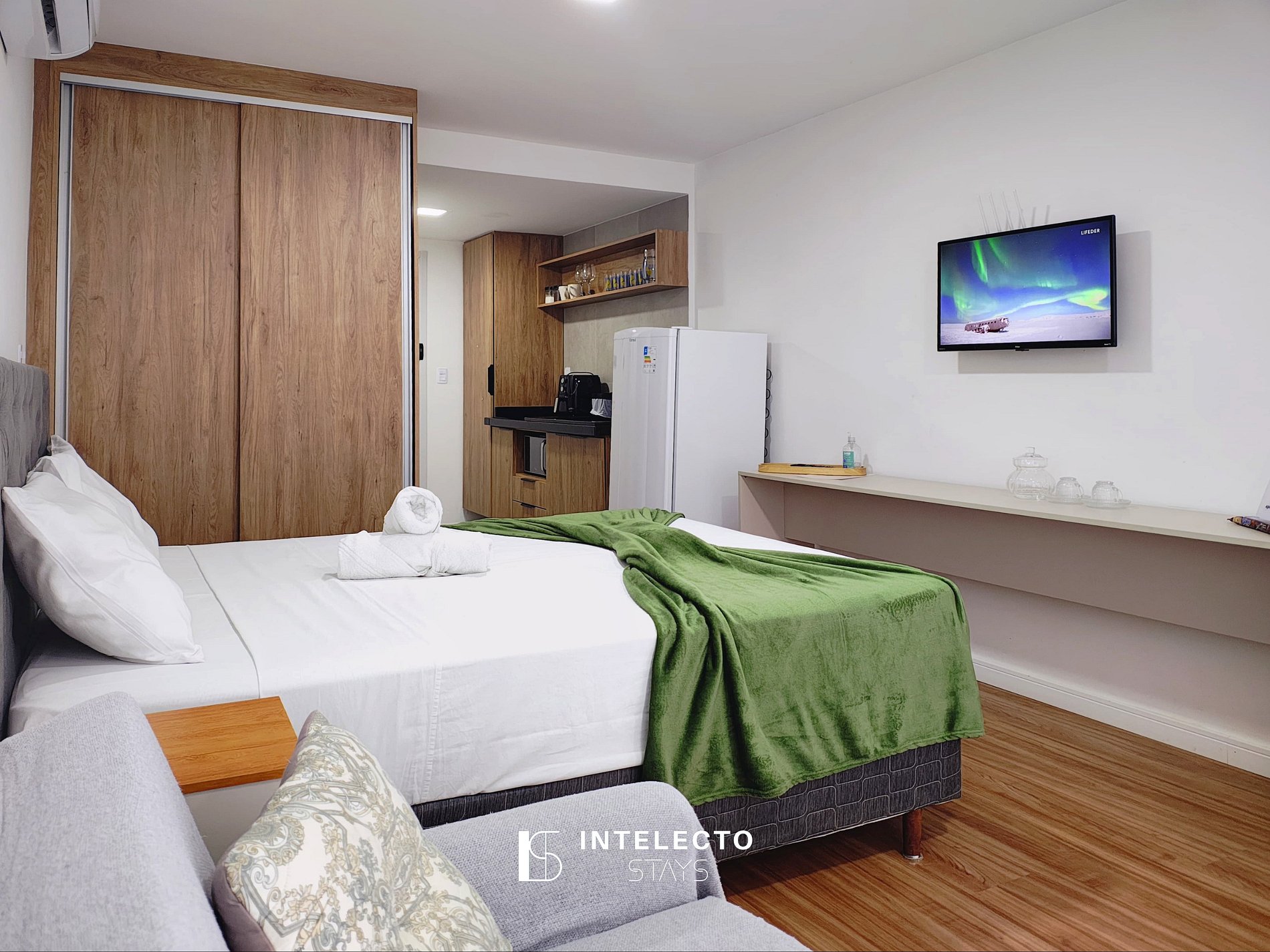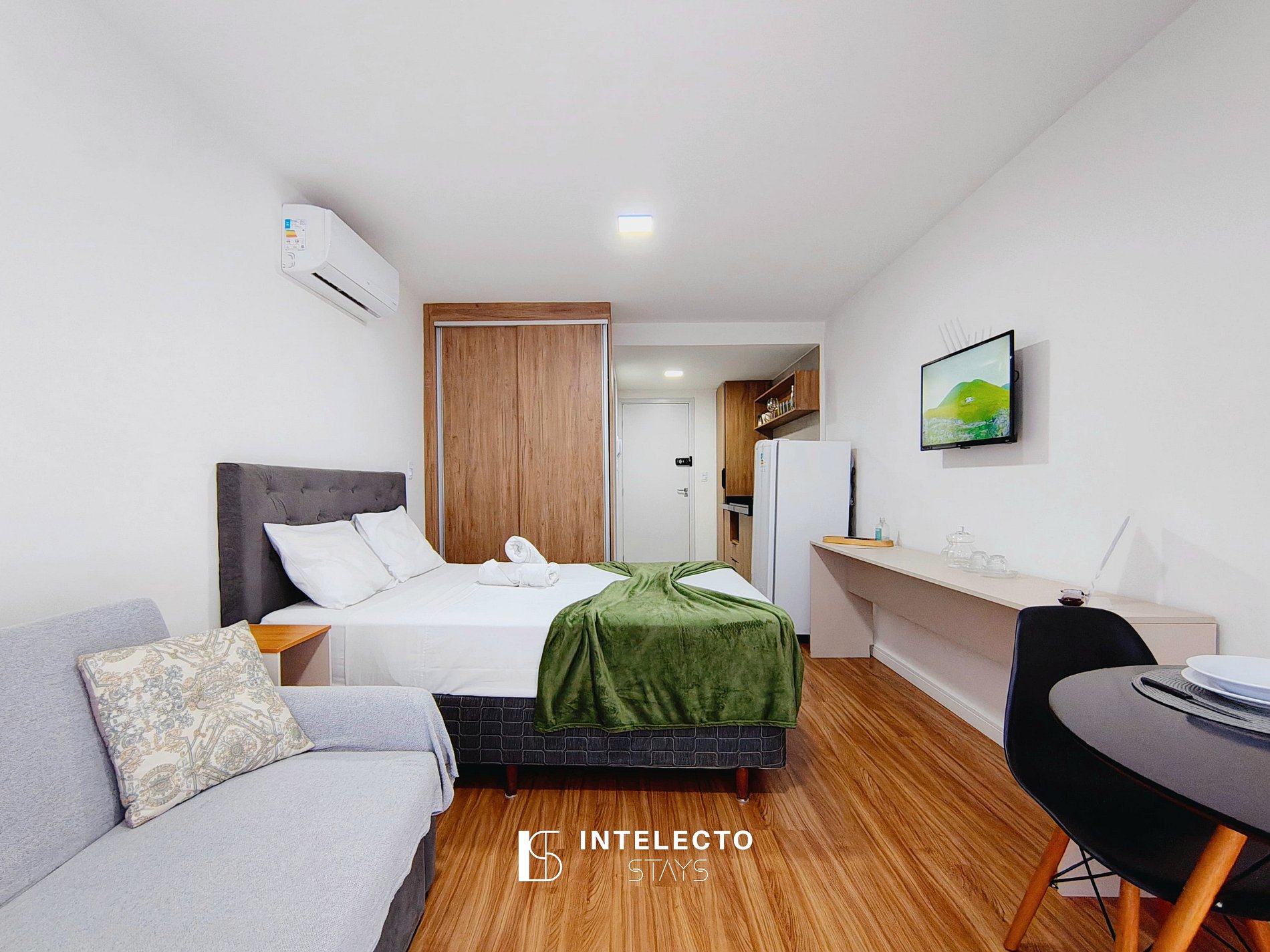 - Espaços integrados (quarto com cama queen e sala de estar com sofá-cama) com armários e guarda-roupas planejados