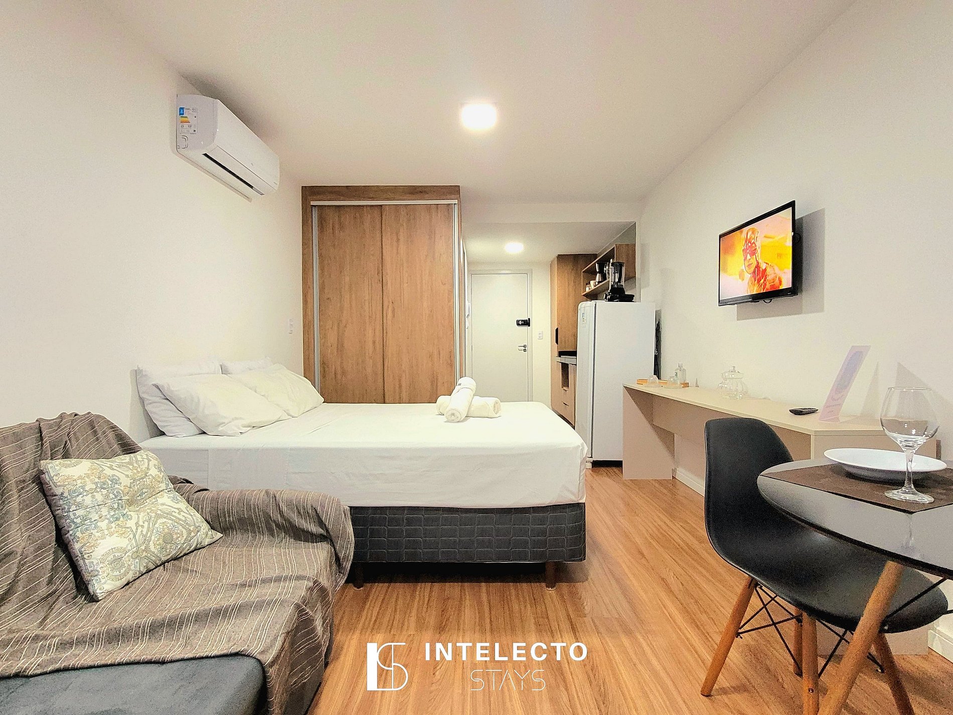 - Espaços integrados (quarto com cama queen e sala de estar com sofá-cama) com armários e guarda-roupas planejados