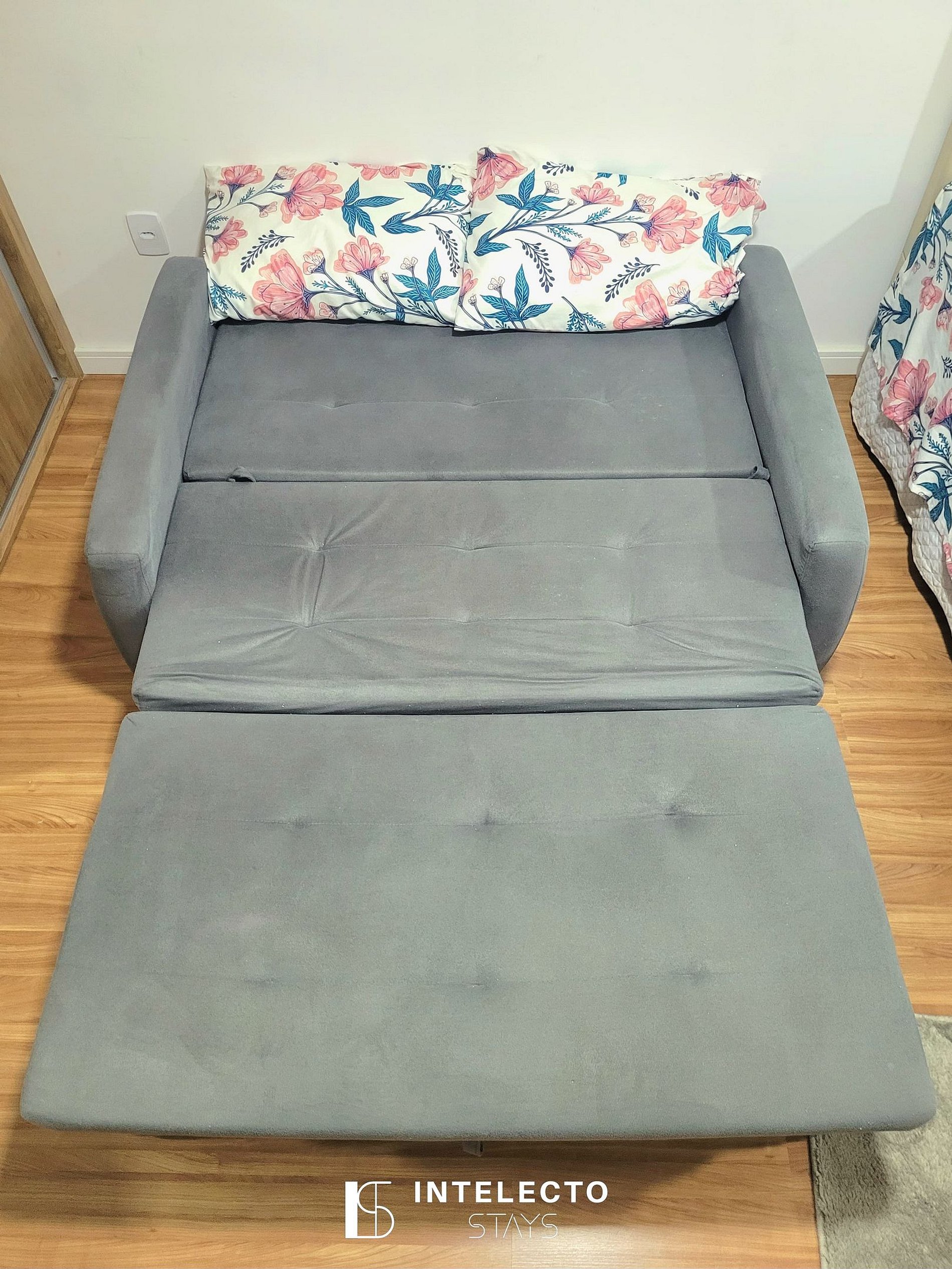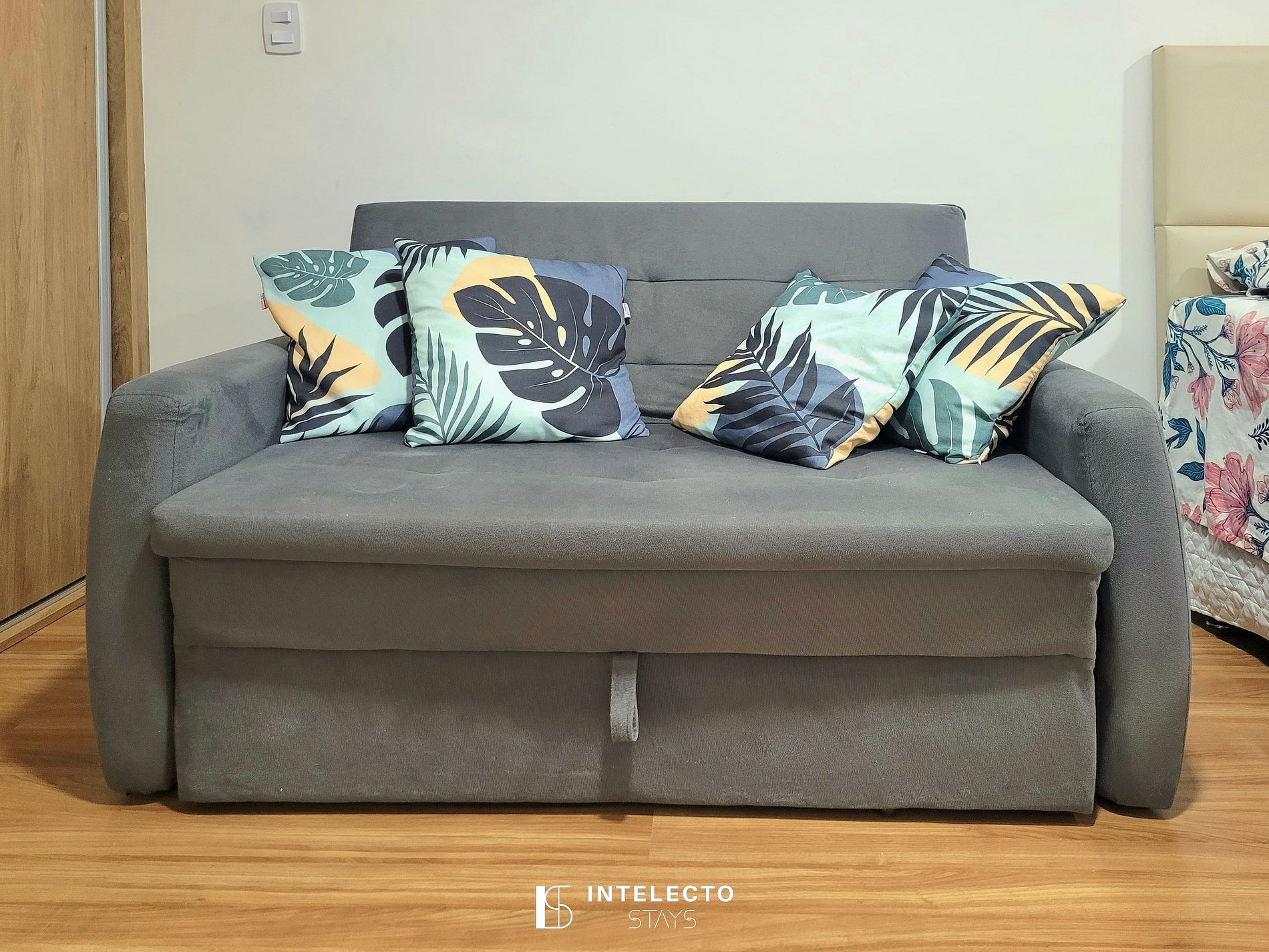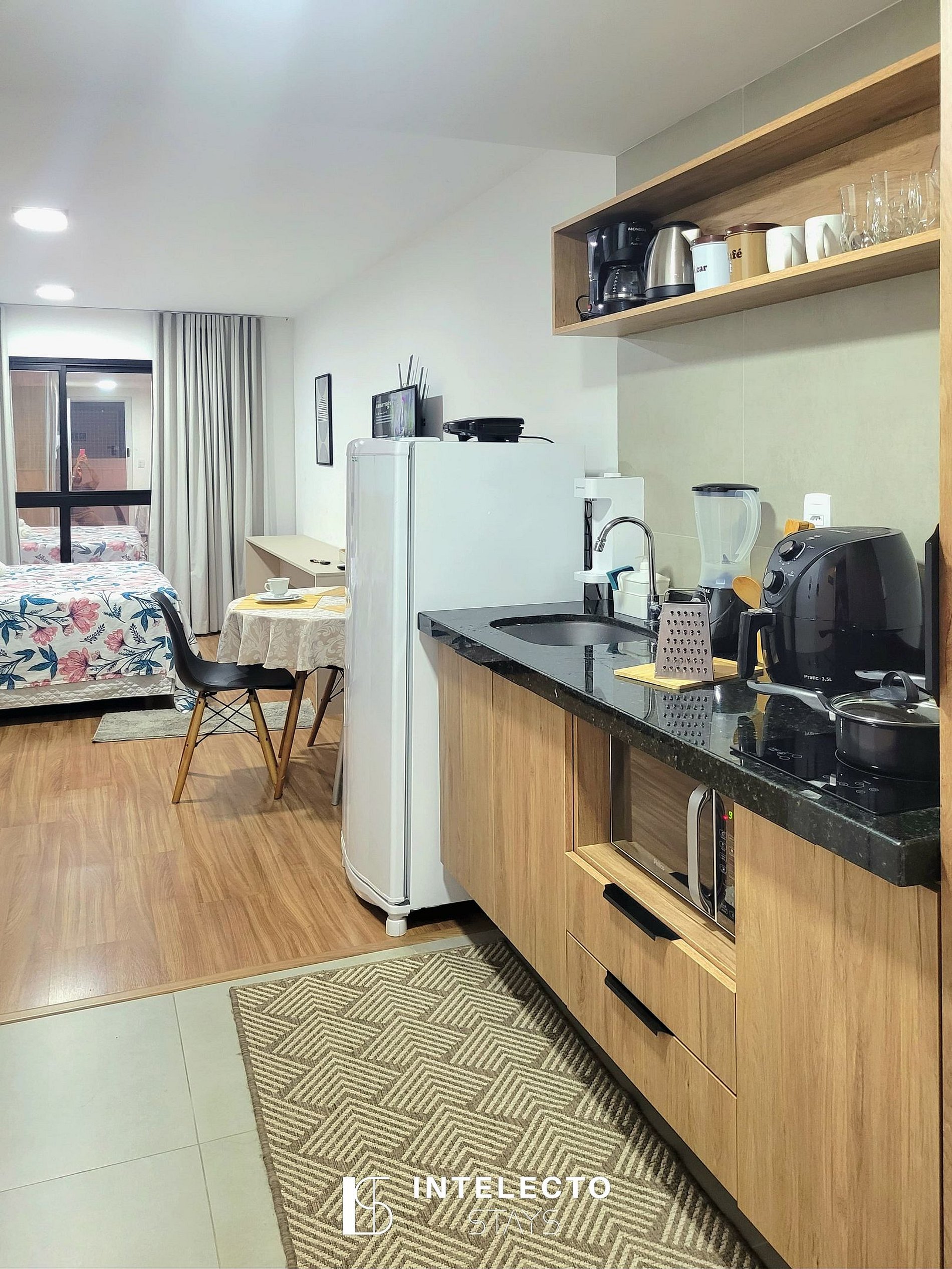- Espaços integrados (quarto com cama queen e sala de estar com sofá-cama) com armários e guarda-roupas planejados