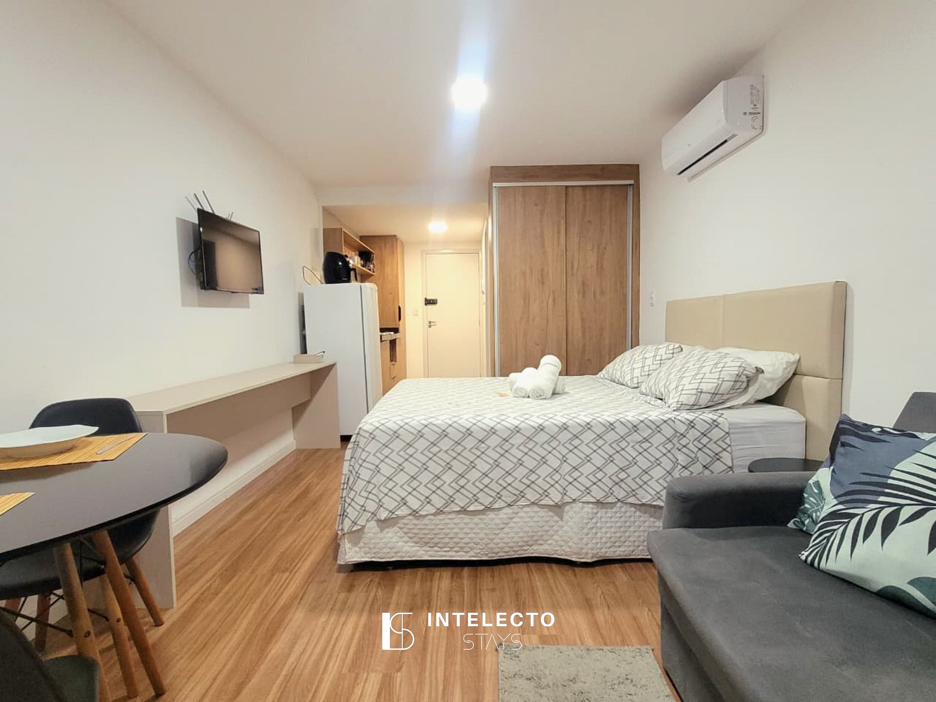 - Espaços integrados (quarto com cama queen e sala de estar com sofá-cama) com armários e guarda-roupas planejados