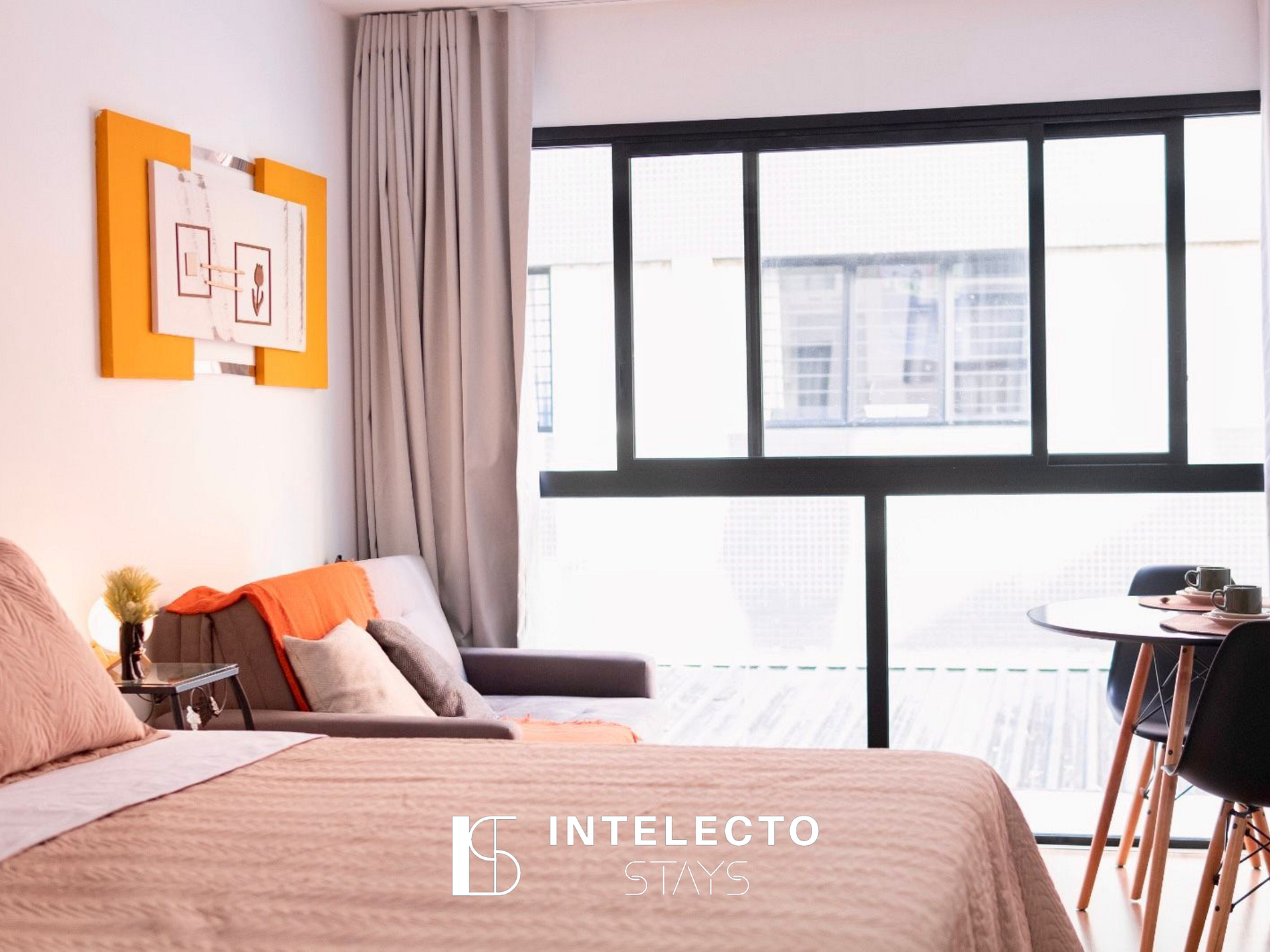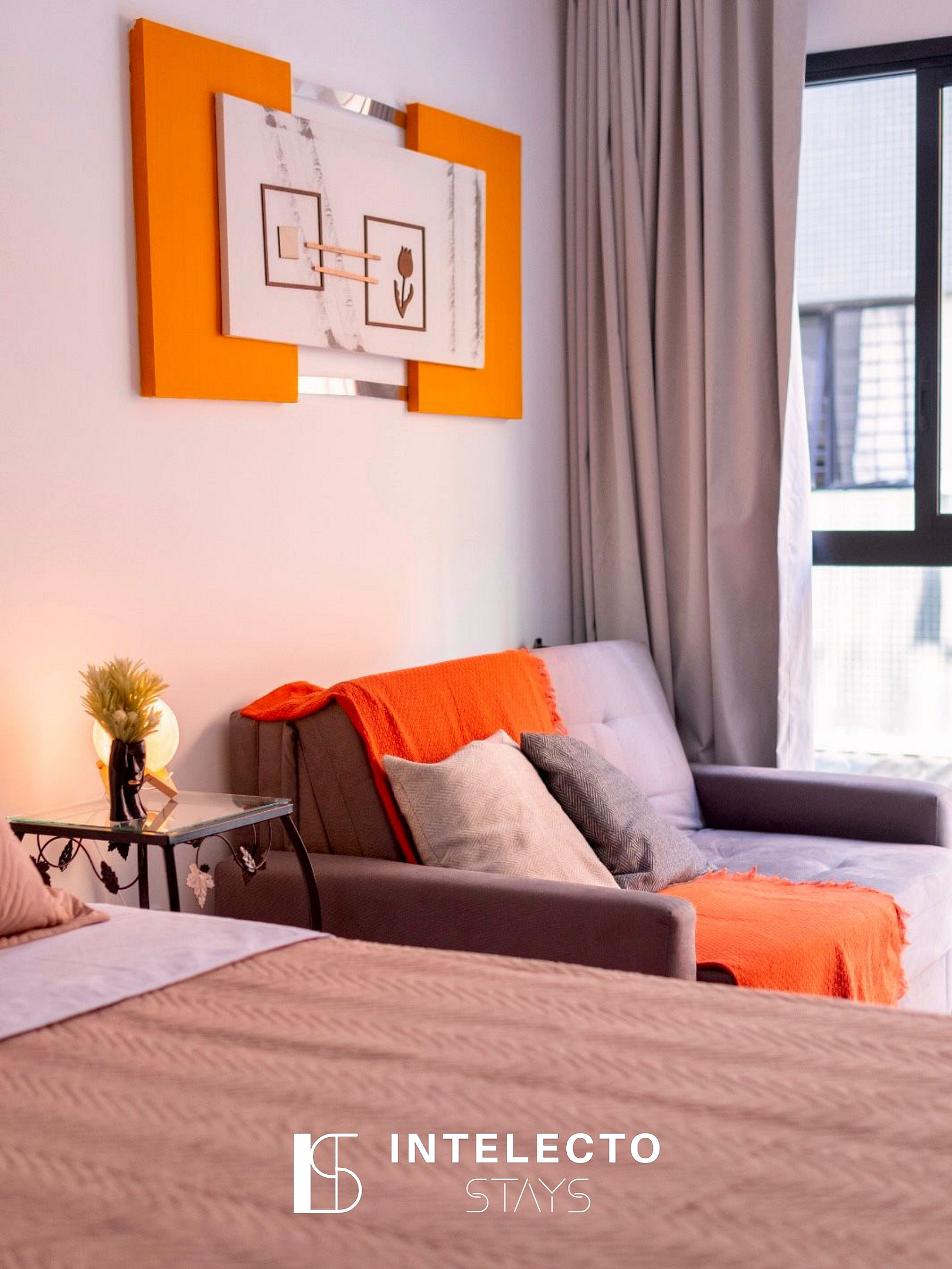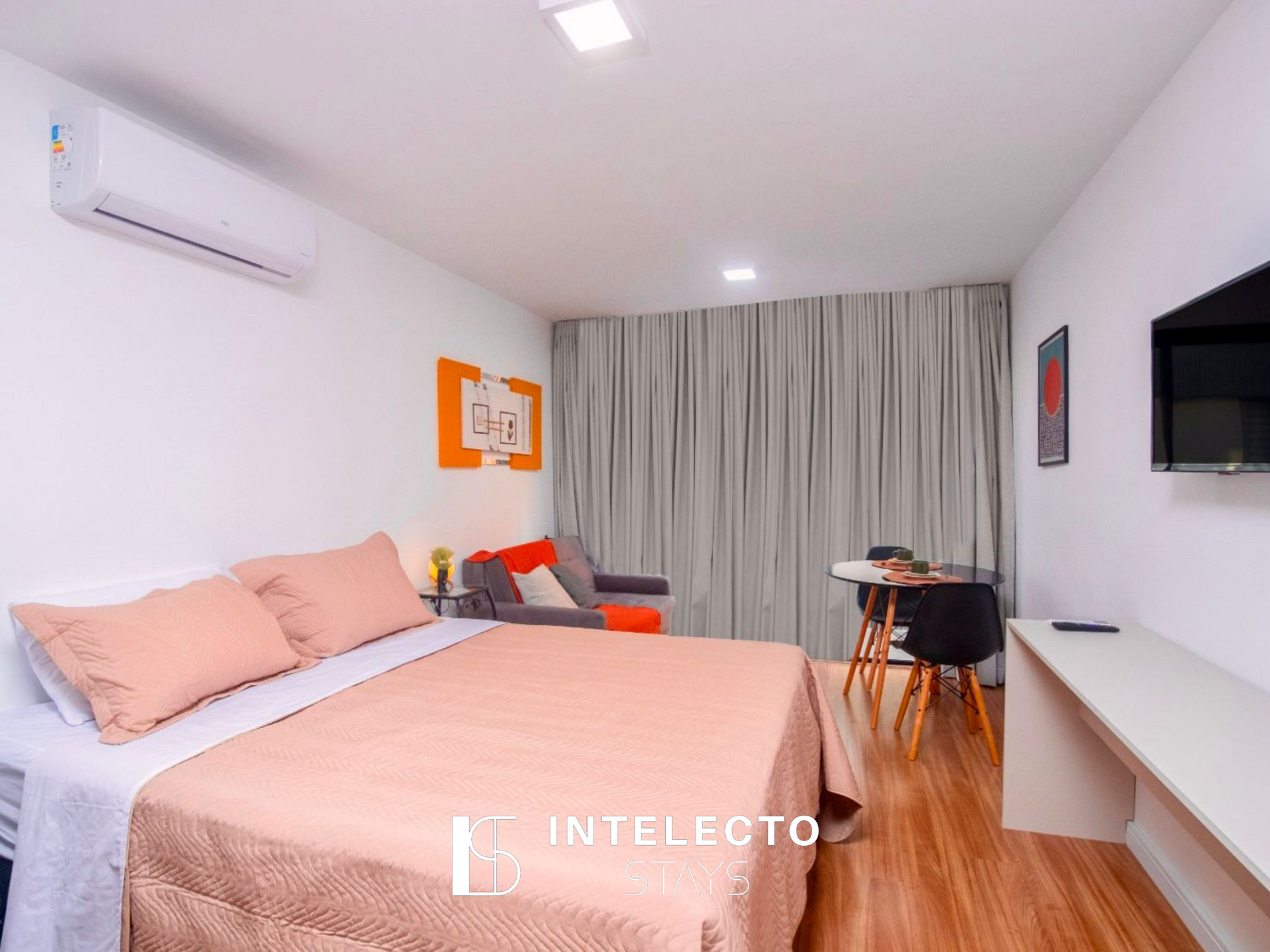 - Espaços integrados (quarto com cama queen e sala de estar com sofá-cama) com armários e guarda-roupas planejados